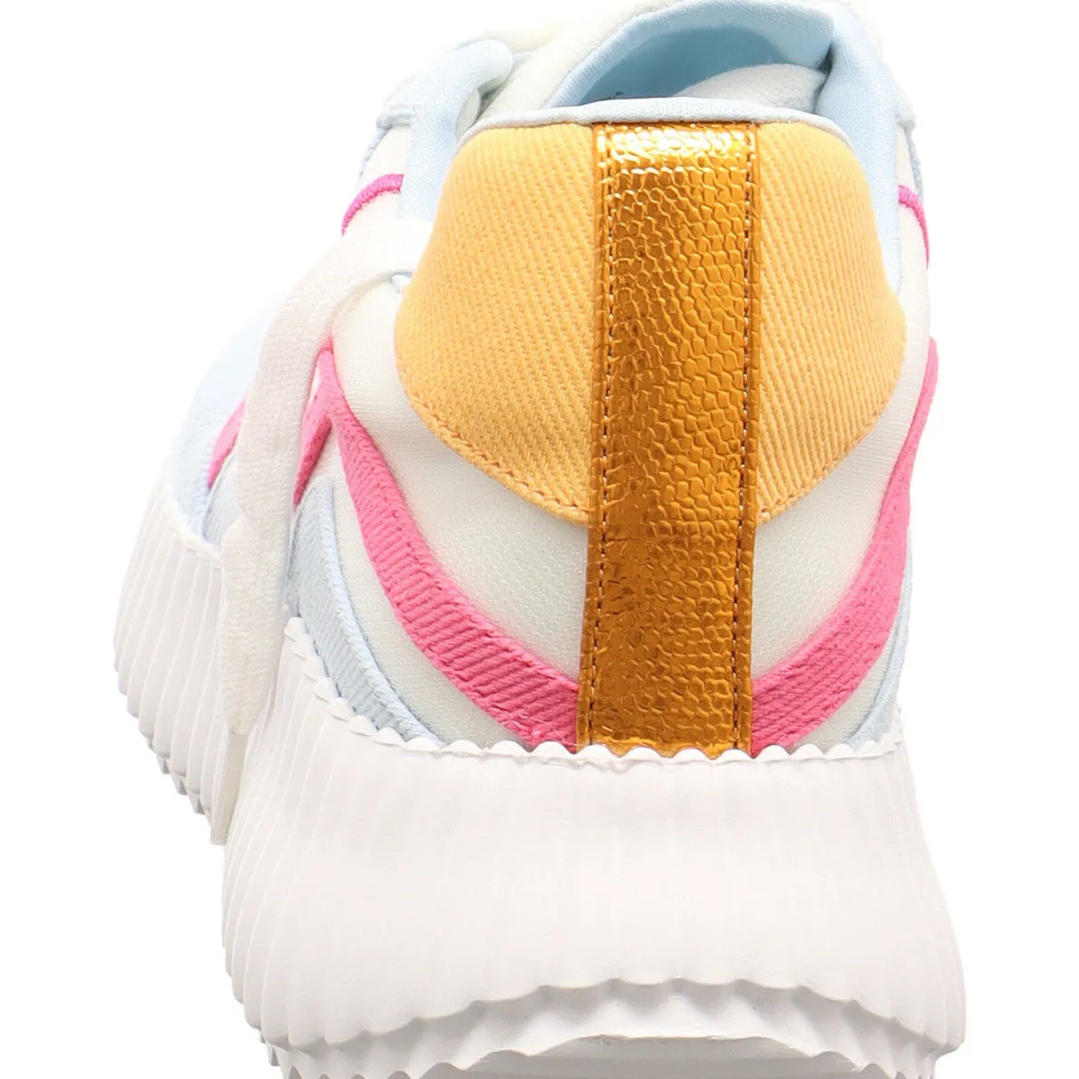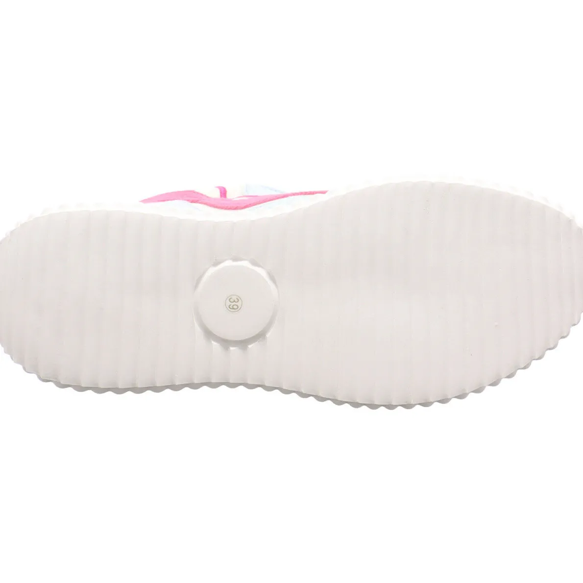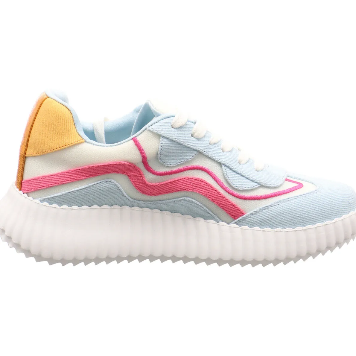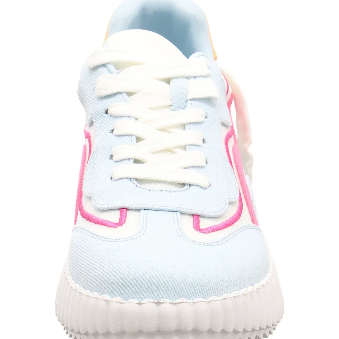 Das Obermaterial aus Textil im Denim Look überzeugt in einem angesagten Muster in Blau, Pink und Orange. Die Einsätze in Weiß schimmern im Licht und sind optische Hingucker. Zudem runden die groben Ziernähte das Design des Sneakers gekonnt ab.