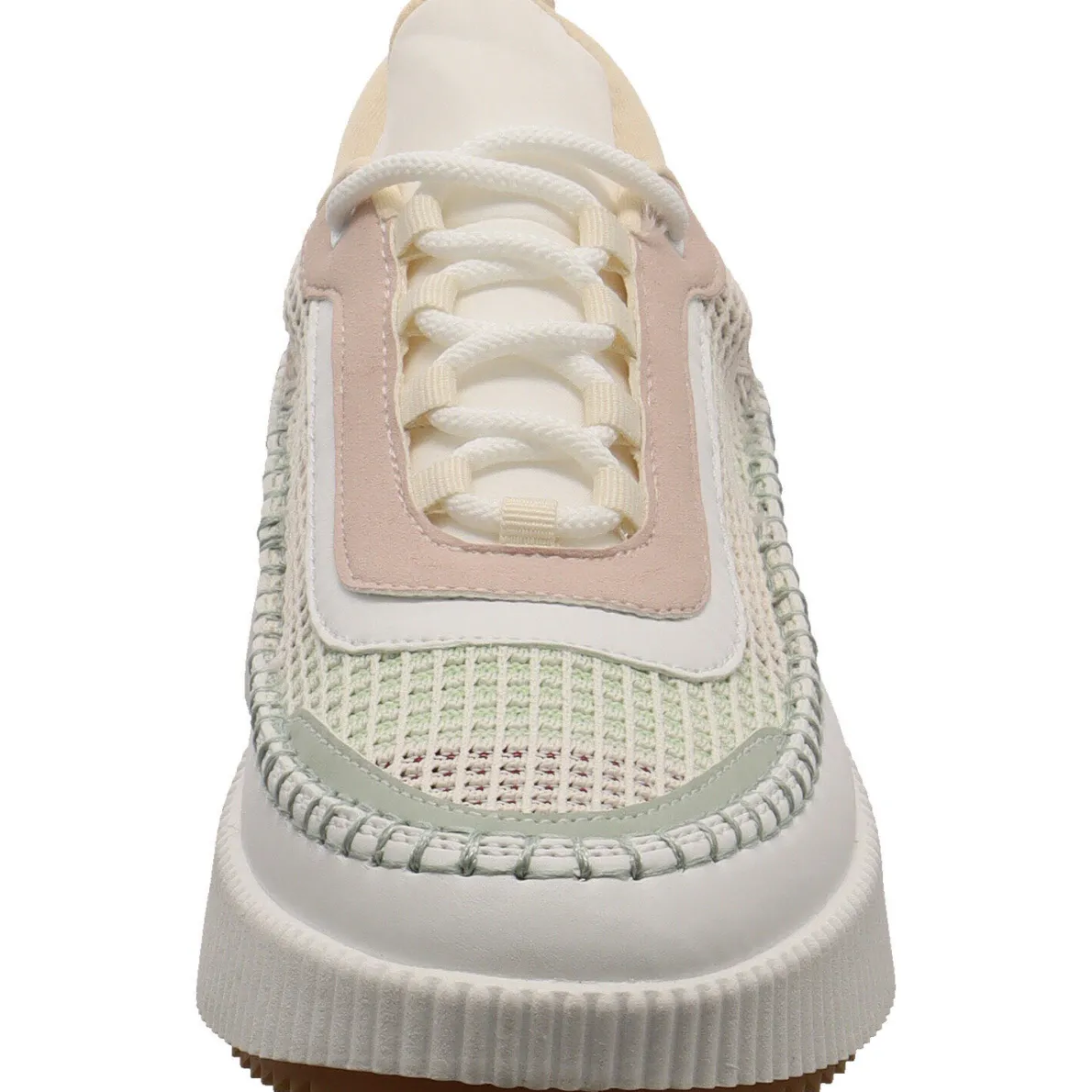 Das Obermaterial überzeugt im angesagten Strick Look. Es wurde aus Textil in Weiß gefertigt und die Farben Rosa, Grün und Rot wurden darin eingearbeitet. Die Einsätze in Weiß aus Kunstleder in Glattleder Optik, sowie in Nubukoptik in Rosa und Textil in Beige sind optische Hingucker. Zudem runden die groben Ziernähte in Salbei Grün das Design des Sneakers gekonnt ab.
