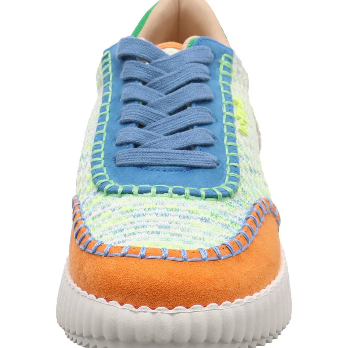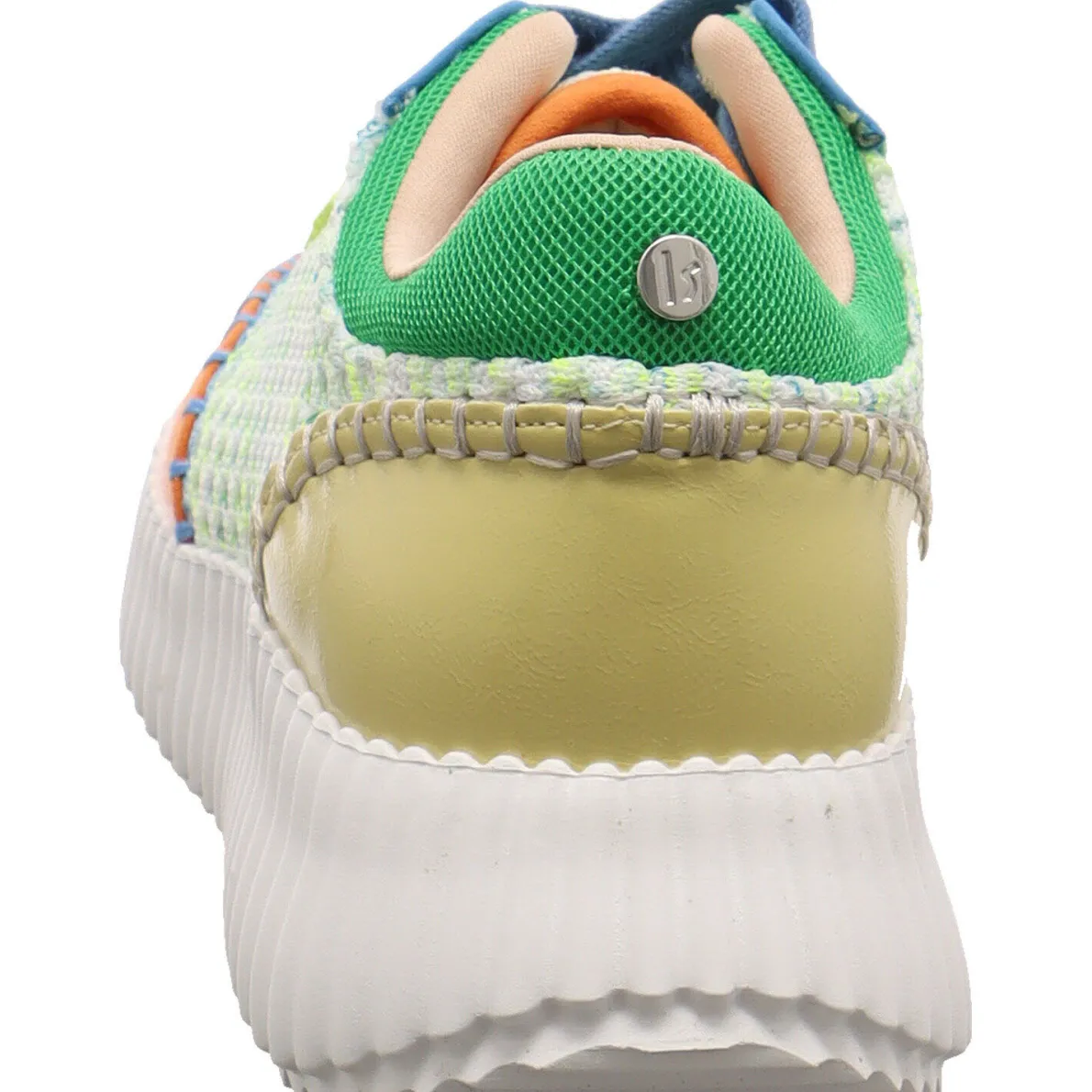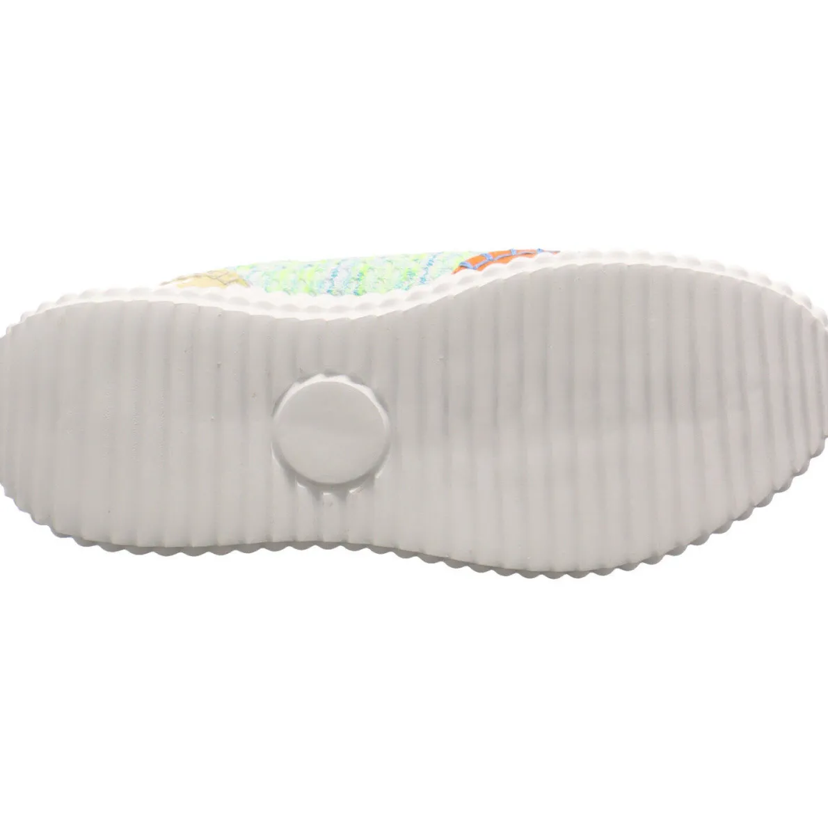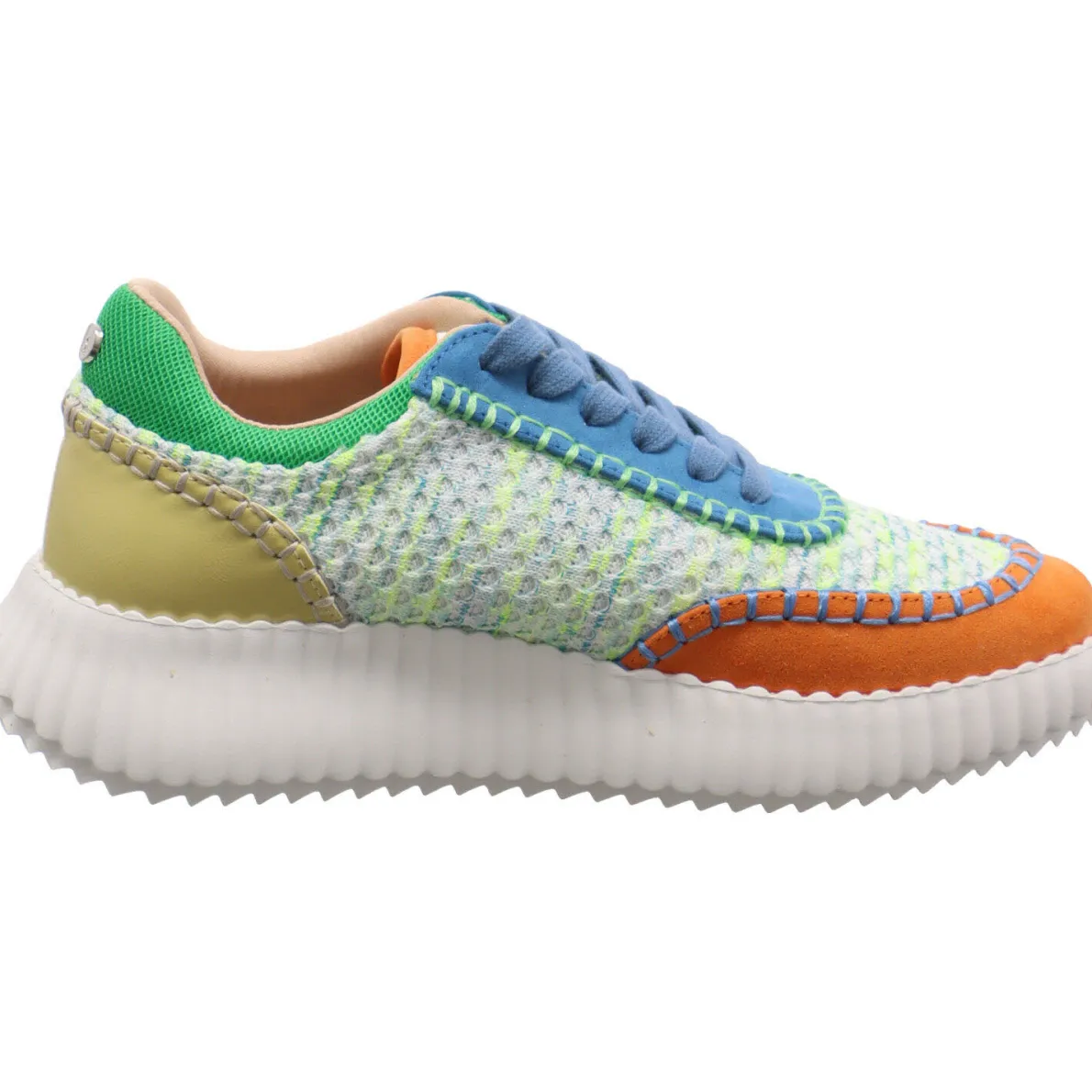 Das Obermaterial überzeugt im angesagten Strick Look. Es wurde aus Textil in Weiß mit Neon Grün gefertigt und ist mit Akzenten in Blau versehen. Die Einsätze in Beige, Orange und Blau aus Kunstleder in Lack Optik, sowie in Nubukoptik sind optische Hingucker. Zudem runden die groben Ziernähte das Design des Sneakers gekonnt ab.