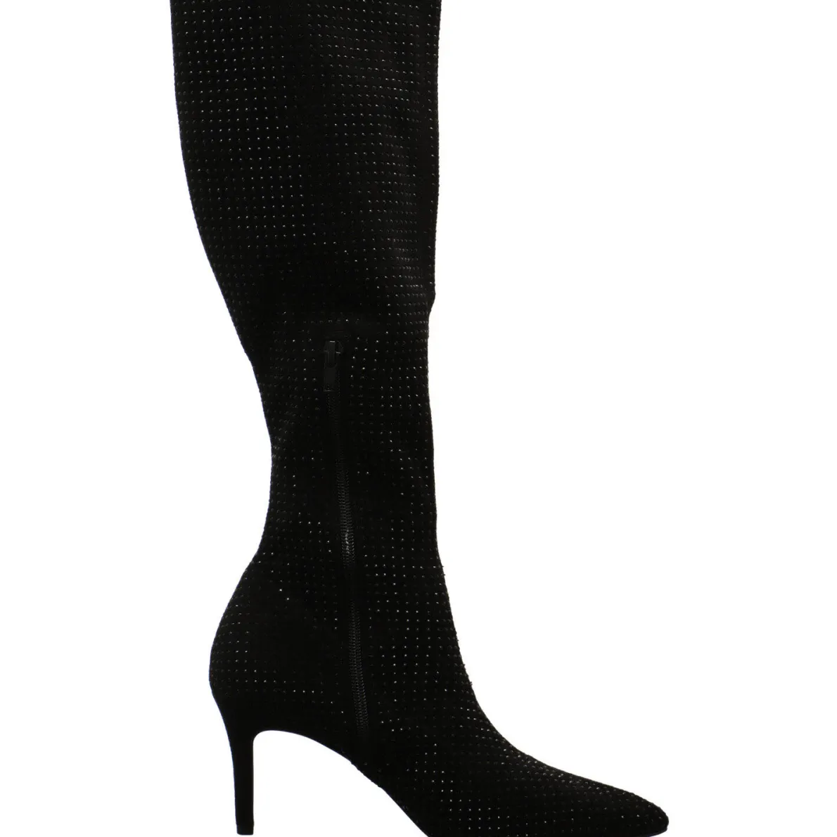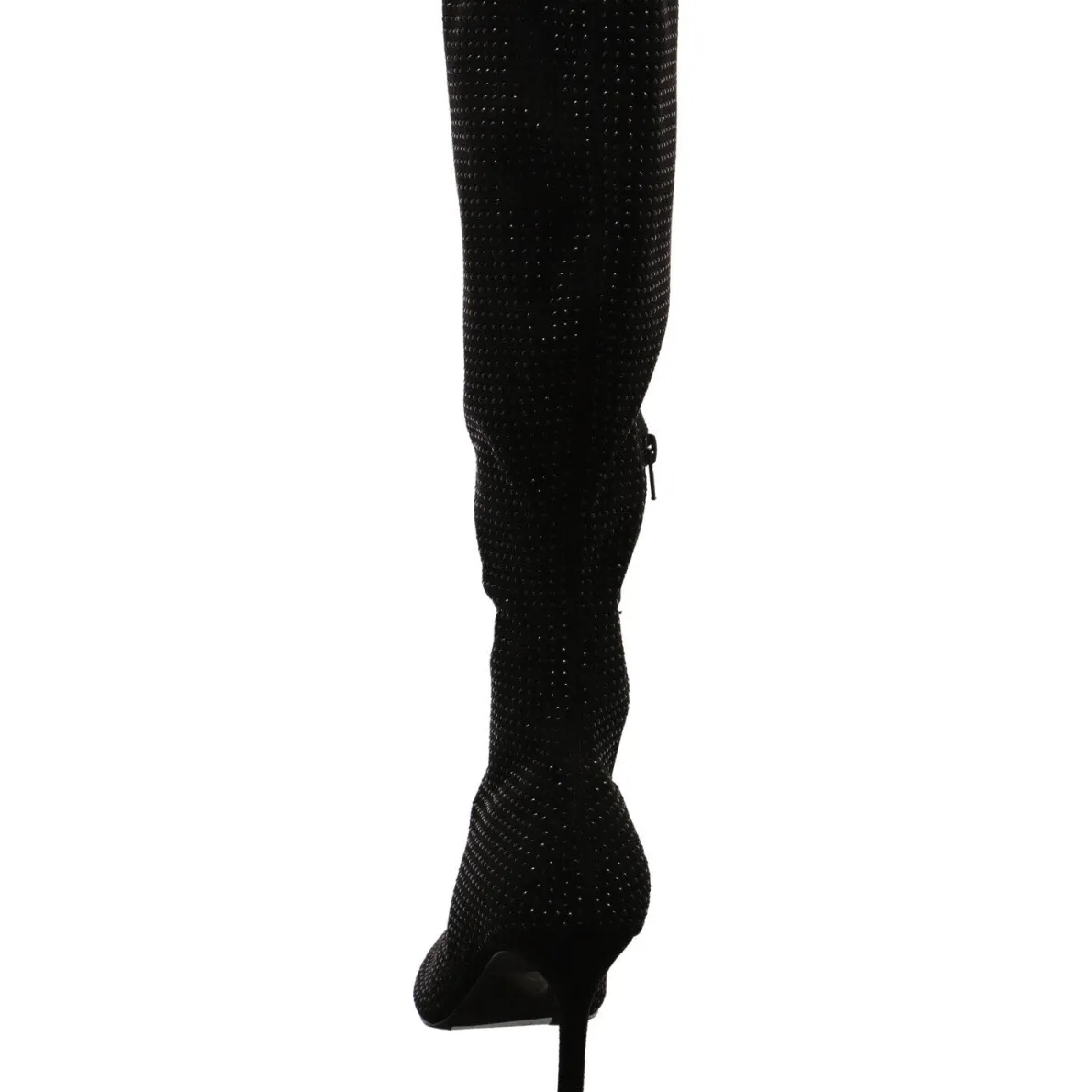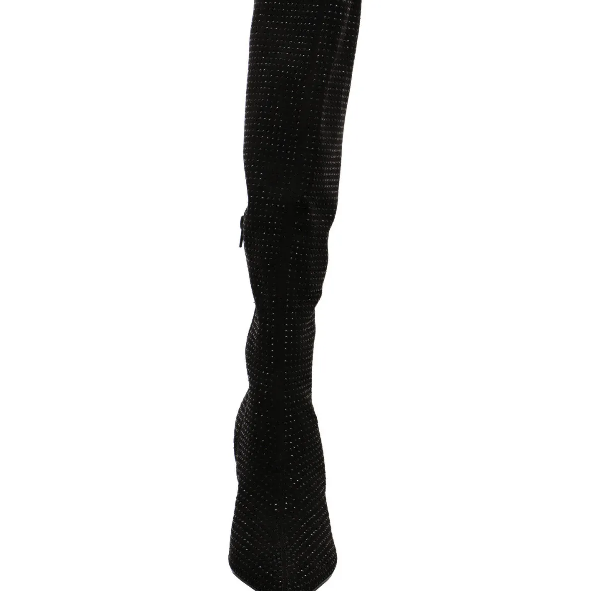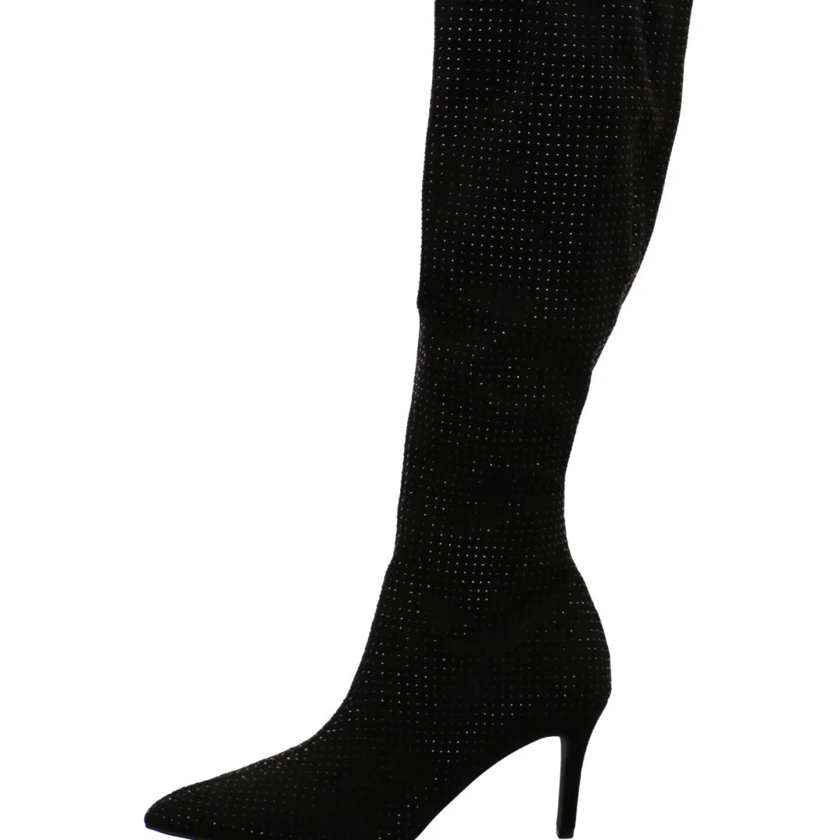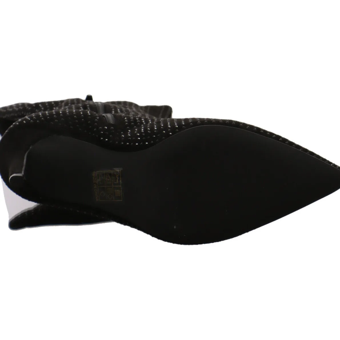 Gefertigt aus flexiblem Textil in Schwarz, kann man den Stiefel durch das weiche Material anziehen wie Socken. Das Stretch Material in Kombination mit dem unauffälligen Reißverschluss an der Innenseite macht den Einstieg besonders komfortabel und sehr einfach. Ein absolutes Highlight ist das mit Glitzersteinen besetzte Obermaterial, welches im Sonnenlicht toll glitzert und Spitze Form des Schuhs.