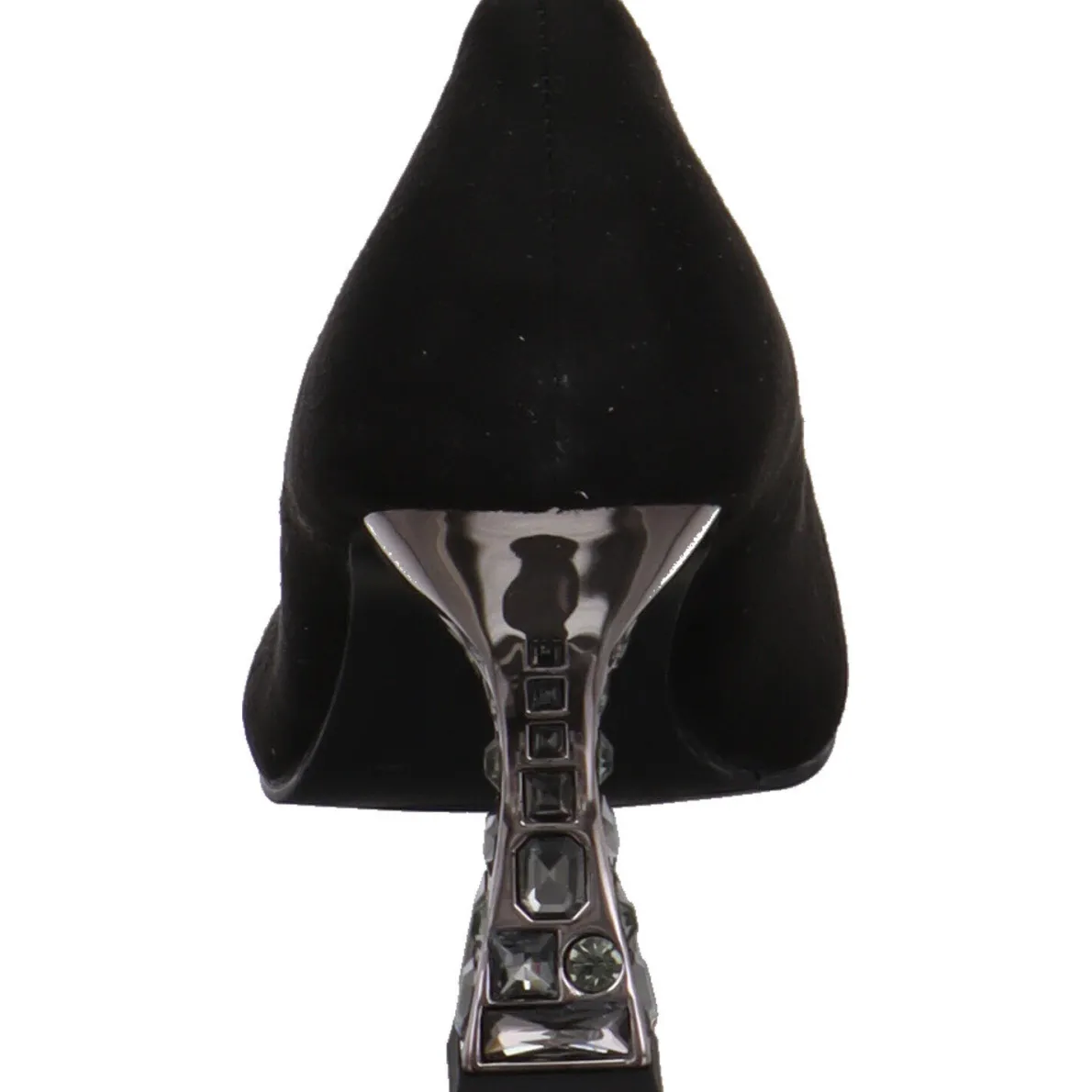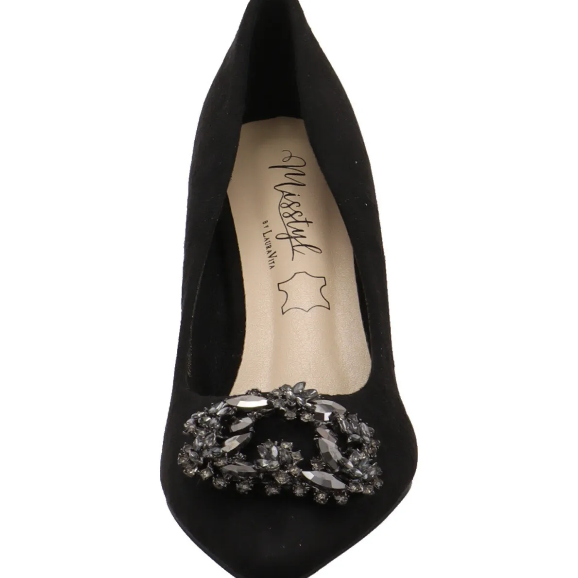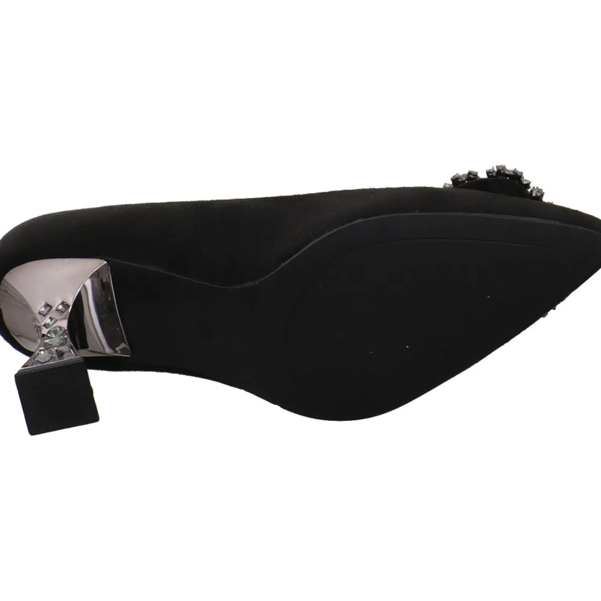 Das Obermaterial aus Textil in Schwarz ist auf dem Blatt mit einer Brosche verziert, welche im Licht funkelt. Die elegante Linienführung und er modische Absatz mit Glitzersteinen in Silber runden das Design perfekt ab. Die Echtleder Innensohle ist dabei angenehm, weich gepolstert.