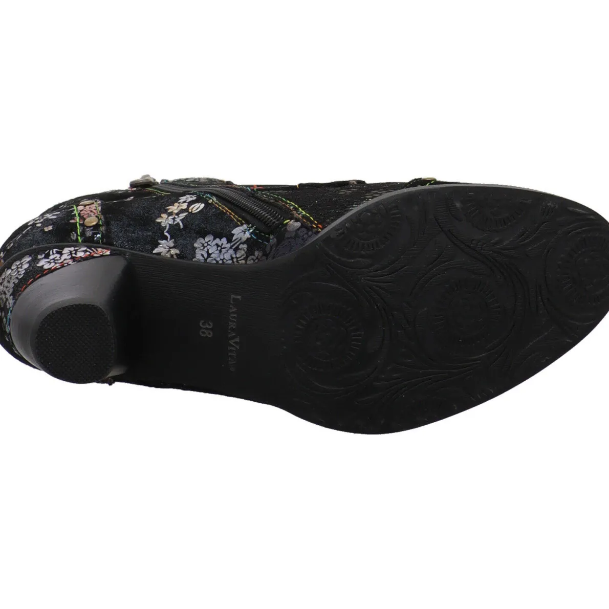 Ein seitlicher Reißverschluss hilft bei einem leichten Einstieg. Der extravagante Trichterabsatz ist ebenfalls mit einem Blumenprint verziert, zaubert lange Beine und gibt dennoch einen sicheren Stand.