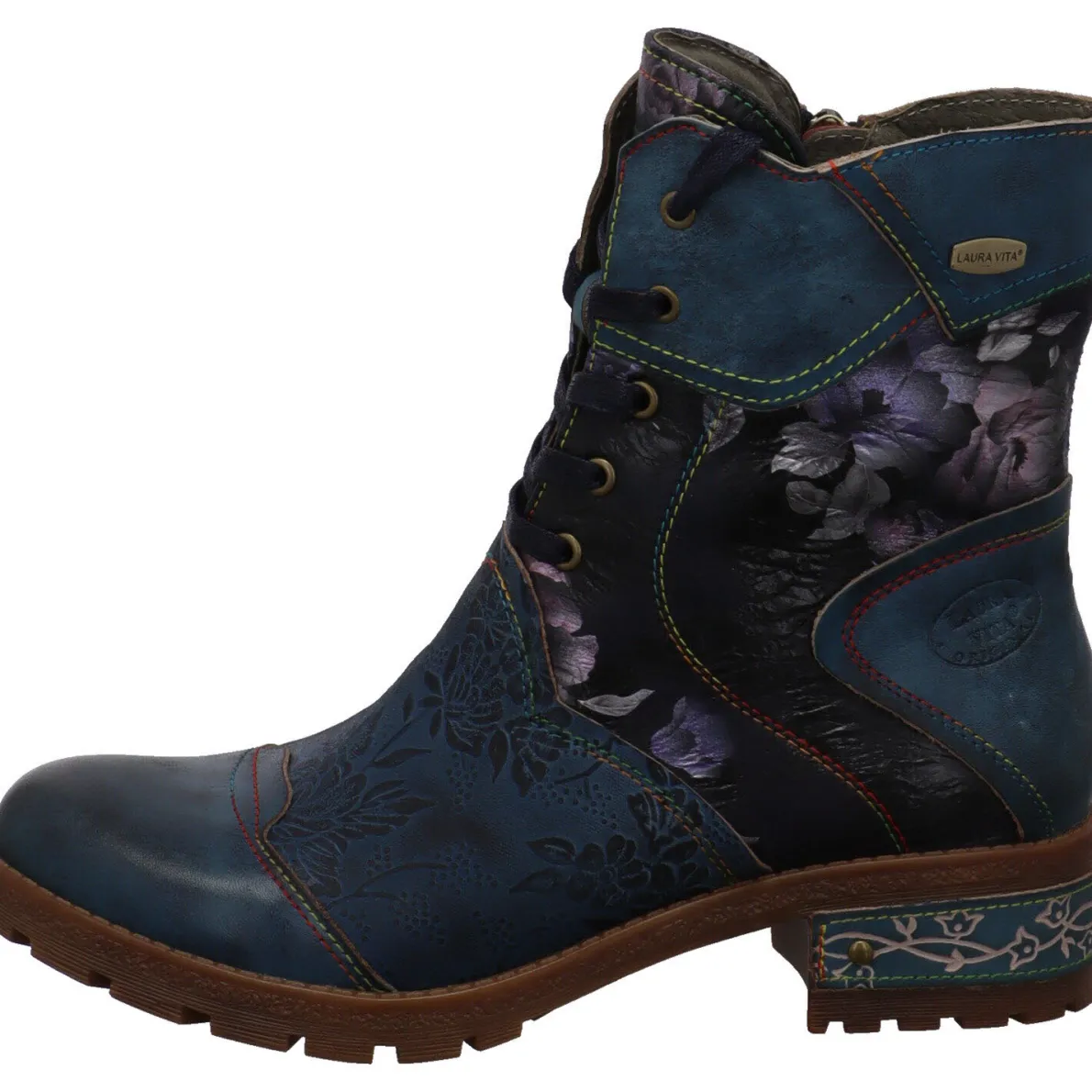 Für alle die das Besondere suchen. Diese modische Damen Schnürstiefelette Cocrailo 24, vom französischen Trendlabel Laura Vita, wird dich begeistern. Sie wurde aus einem Mix aus hochwertigem Echtleder und Textil in Blau gefertigt. Hightlights sind dabei der Blumen Print und Prägungen auf dem Obermaterial.