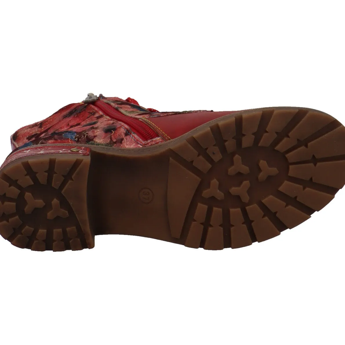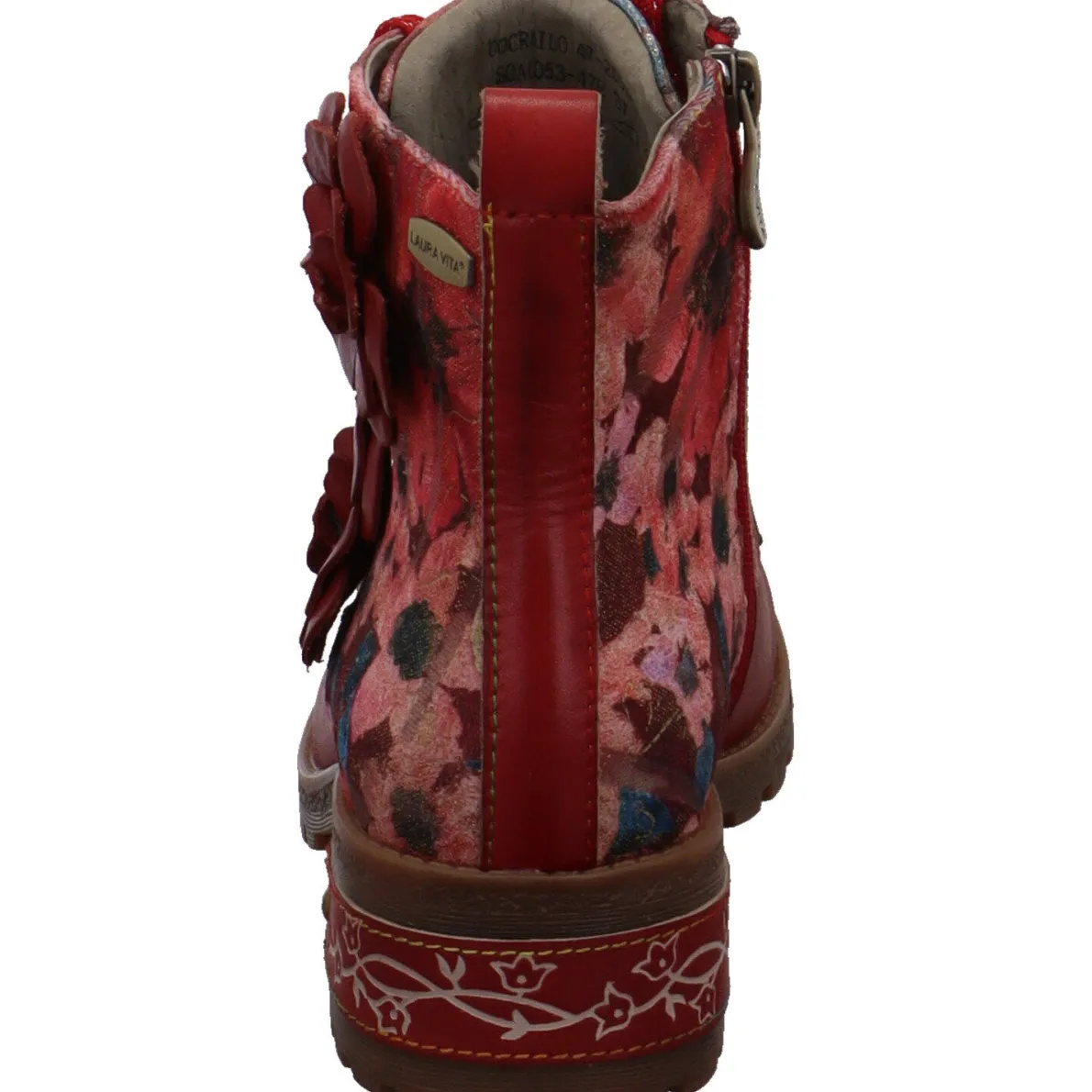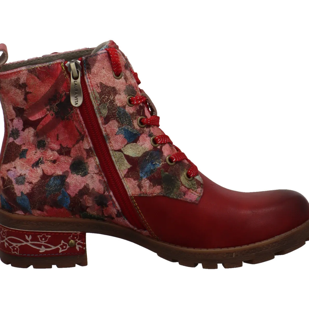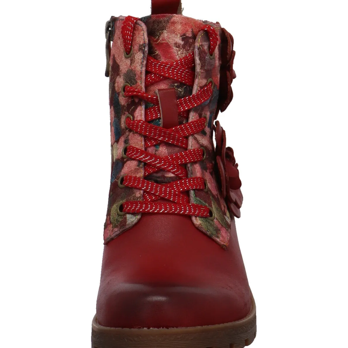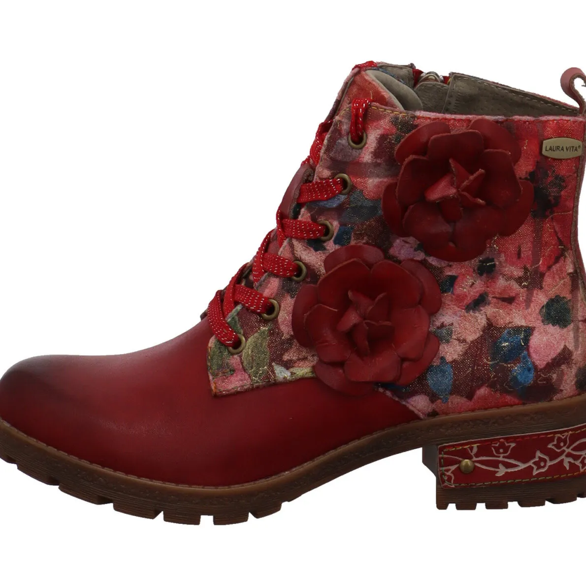 Sie begeistert und durch ihr hochwertiges Obermaterial aus Echtleder in unserer Lieblingsfarbe Rot. Am Schaft ist die Stiefelette mit einem bunten Blumen Print verziert. Zwei große Blumen Applikanten an der Seite und die Schnürung mit einem Glitzerfaden runden den extravaganten Look perfekt ab.