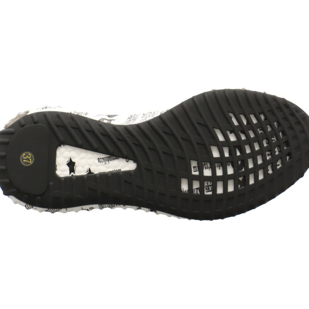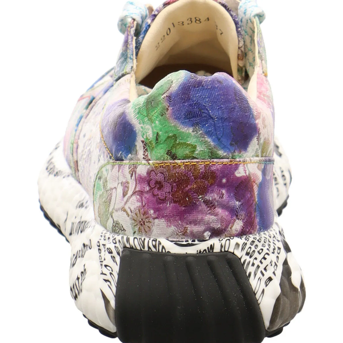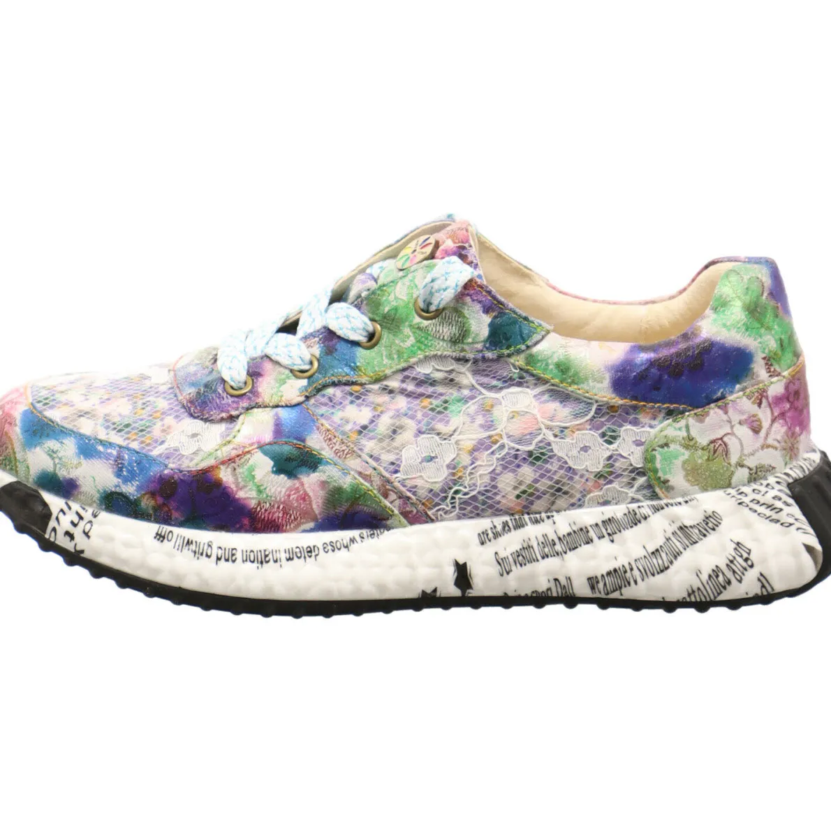 Er wurde aus hochwertigem Textil in hellem Beige und Lila gefertigt, welches mit einer Overlaystruktur versehen ist. Kleine Blumen in Weiß und eine filigrane Netzstruktur sind präzise aufgenäht und an der Ferse, sowie an der Schuhspitze befinden sich aus Echtleder gefertigte Einsätze mit floralem Muster in Grün und Blau. Das Lettering in Schwarz an der Sohle in Schwarz rundet den sportlichen Look gekonnt ab. Die Schnürung in Weiß, mit Glitzerdetails in Blau sorgt für die individuelle Anpassung des Schuhs an den Fuß. Zudem ist der Sneaker durch die Echtleder Innenausstattung angenehm zu tragen und durch sein herausnehmbares Wechselfußbett überaus praktisch.
