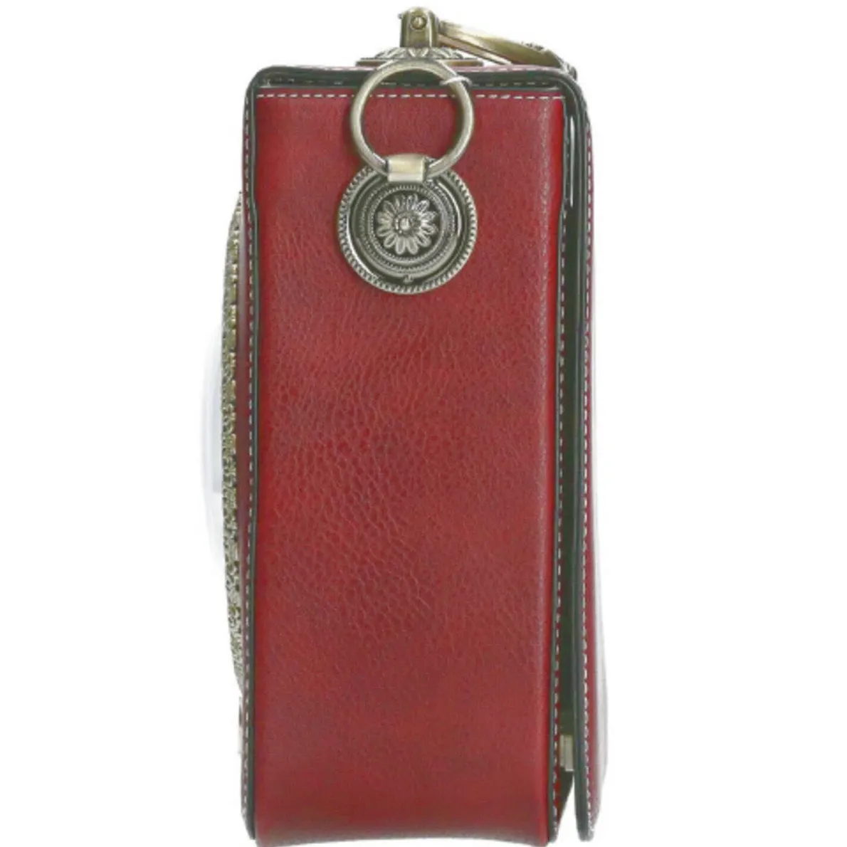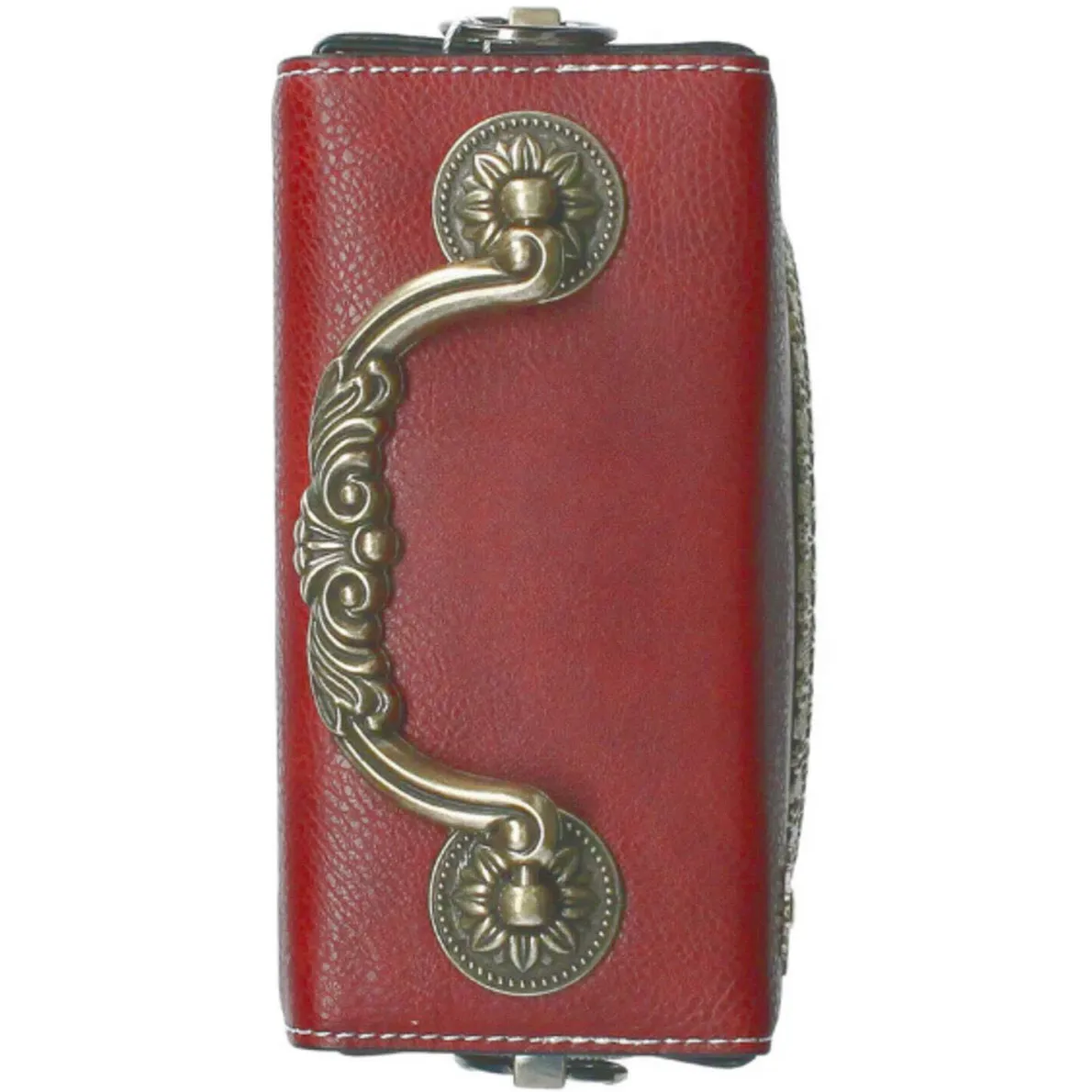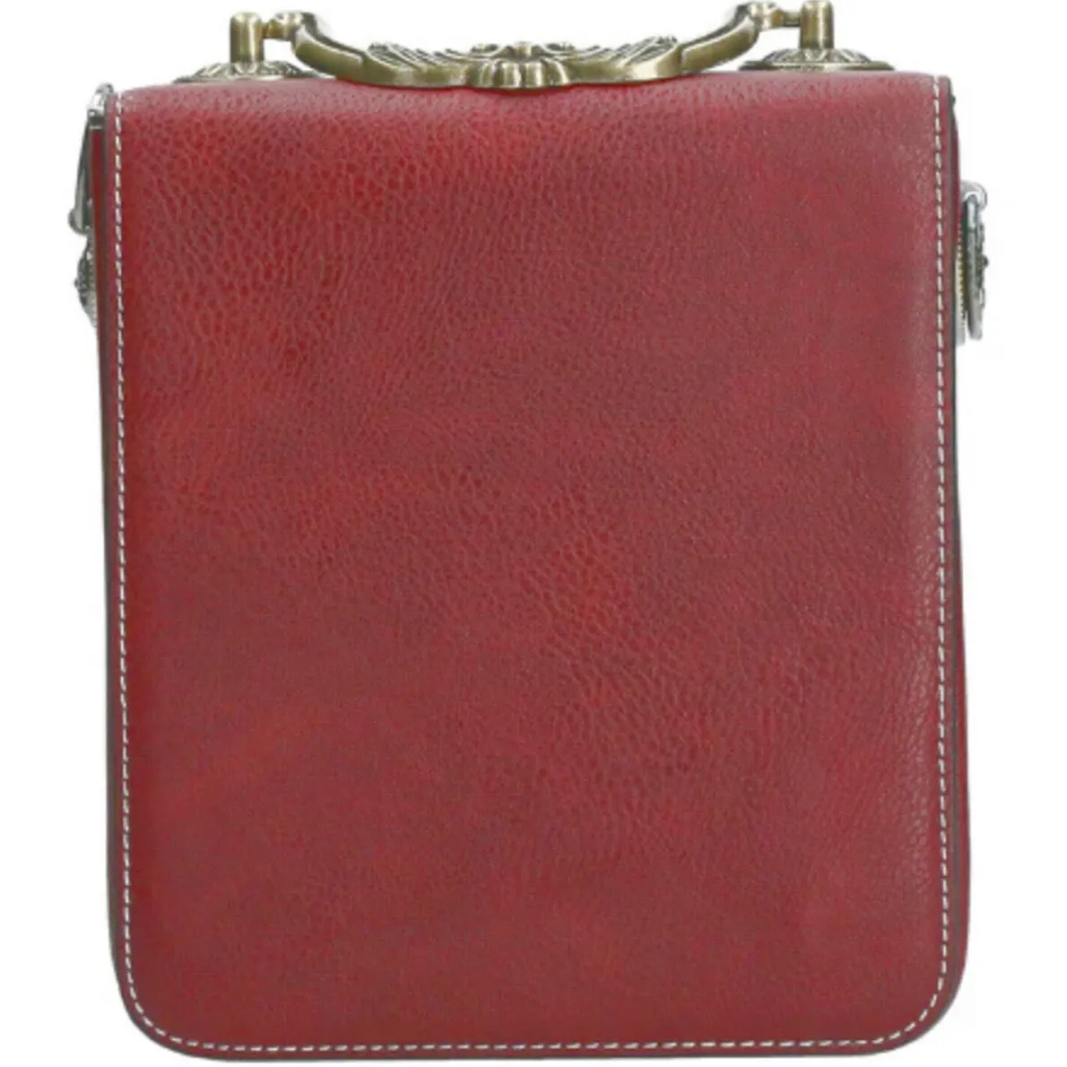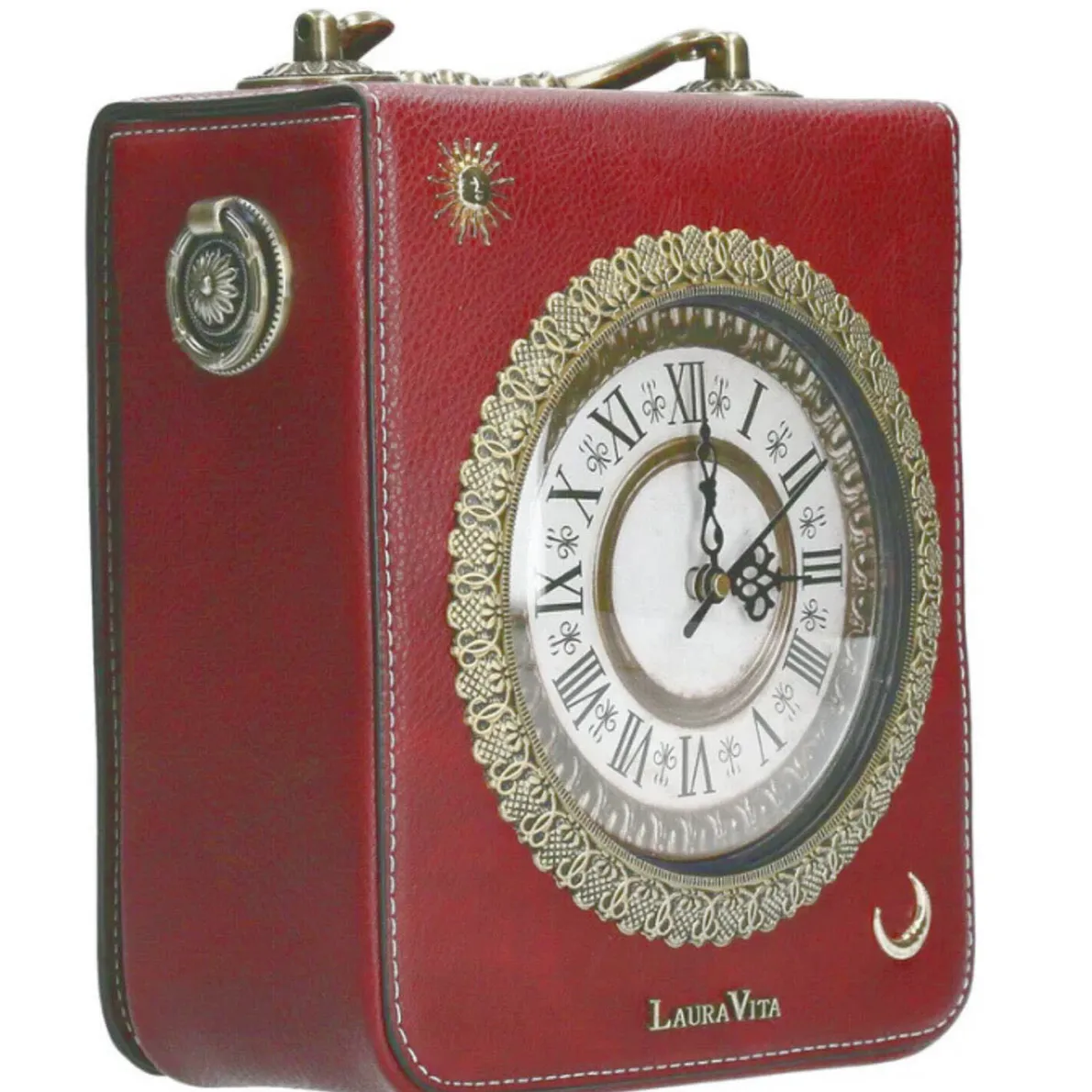 Sie wurde aus Kunstleder in Rot und in Form einer antiken Uhr gefertigt und mit passenden, messingfarbenen Details versehen.