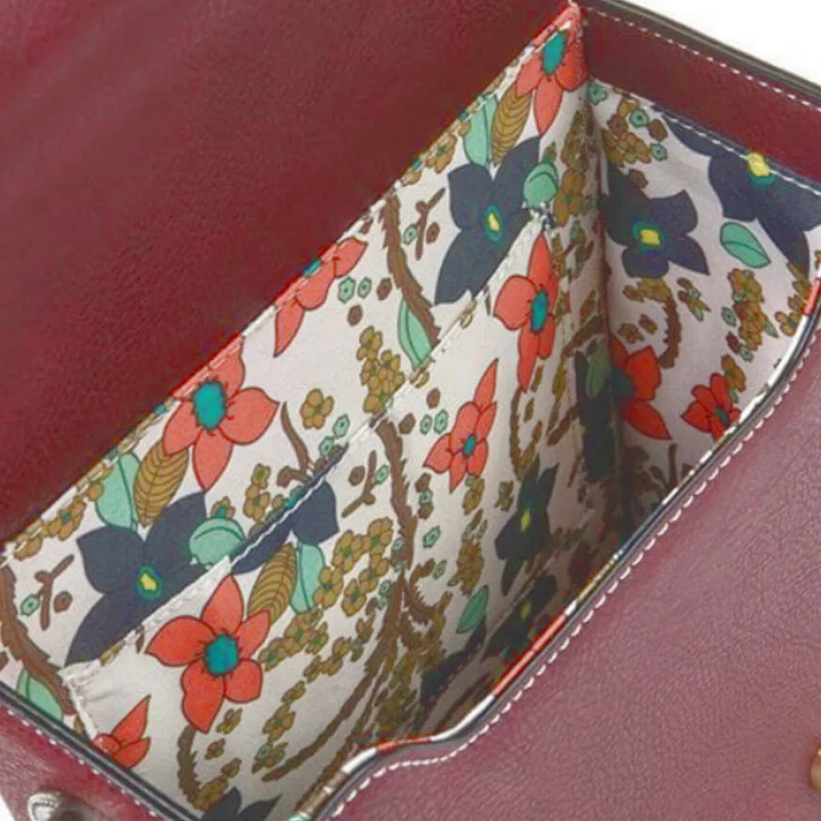 Du kannst sie mit einem doppelten Magnetverschluss öffnen. Innen findest du ein schönes Blumenmuster. Die Tasche bietet Platz für die Kleinigkeiten, auf die du nicht verzichten möchtest. Der Taschenboden sorgt für einen stabilen Stand und mit dem verstellbaren Umhängegurt kannst du sie bequem Crossover tragen.
