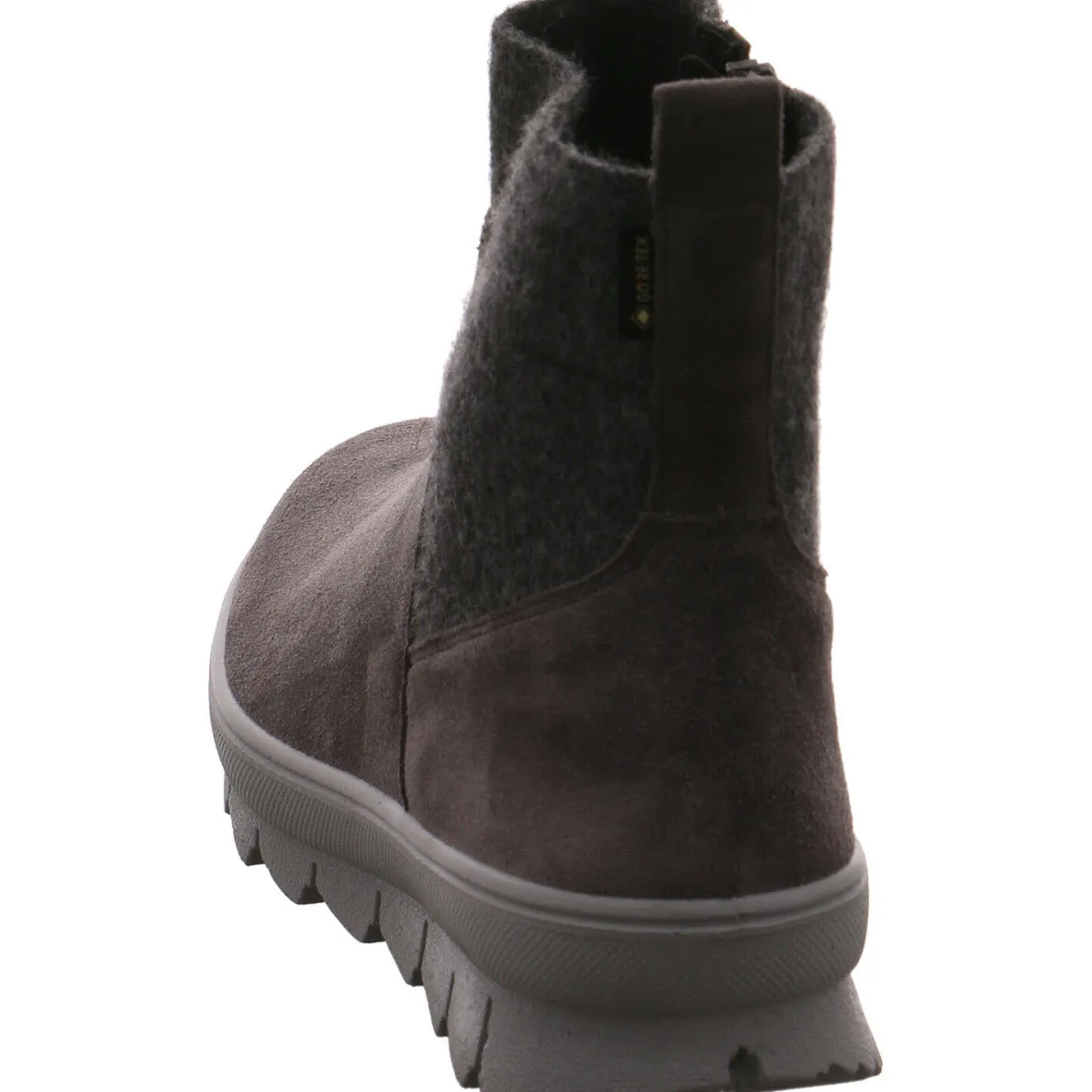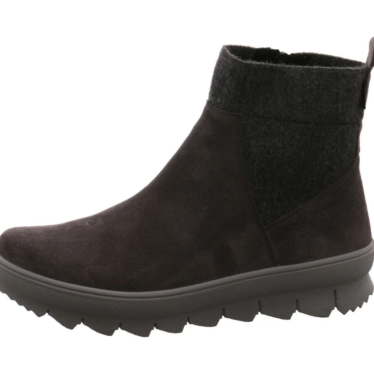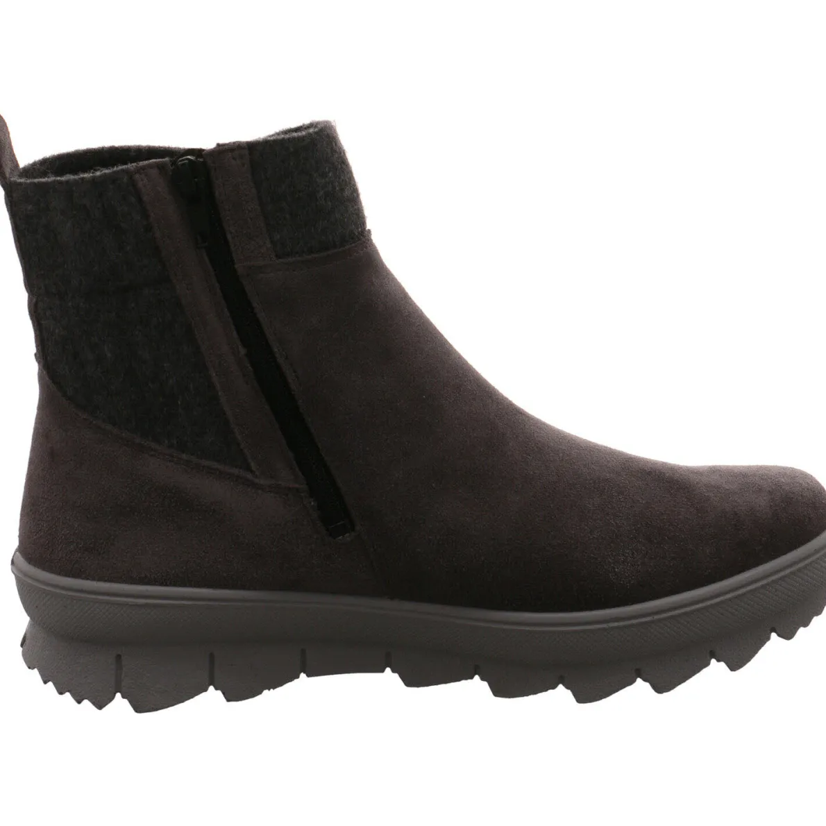 Diese sportliche Damen Stiefelette Novara in Grau von Legero überzeugt nicht nur mit ihrem individuellen Design, sondern auch mit ihrer Funktionalität. Der Schuh wurde aus griffigem Veloursleder gefertigt und ist im Inneren dick und warm gefüttert. Der Schaft ist aus Textil im Filz Look und mit Stretch versehen, dadurch ist der Einstieg besonders einfach. Zusätzlich ist der Stiefel mit einem funktionalen Reißverschluss versehen.