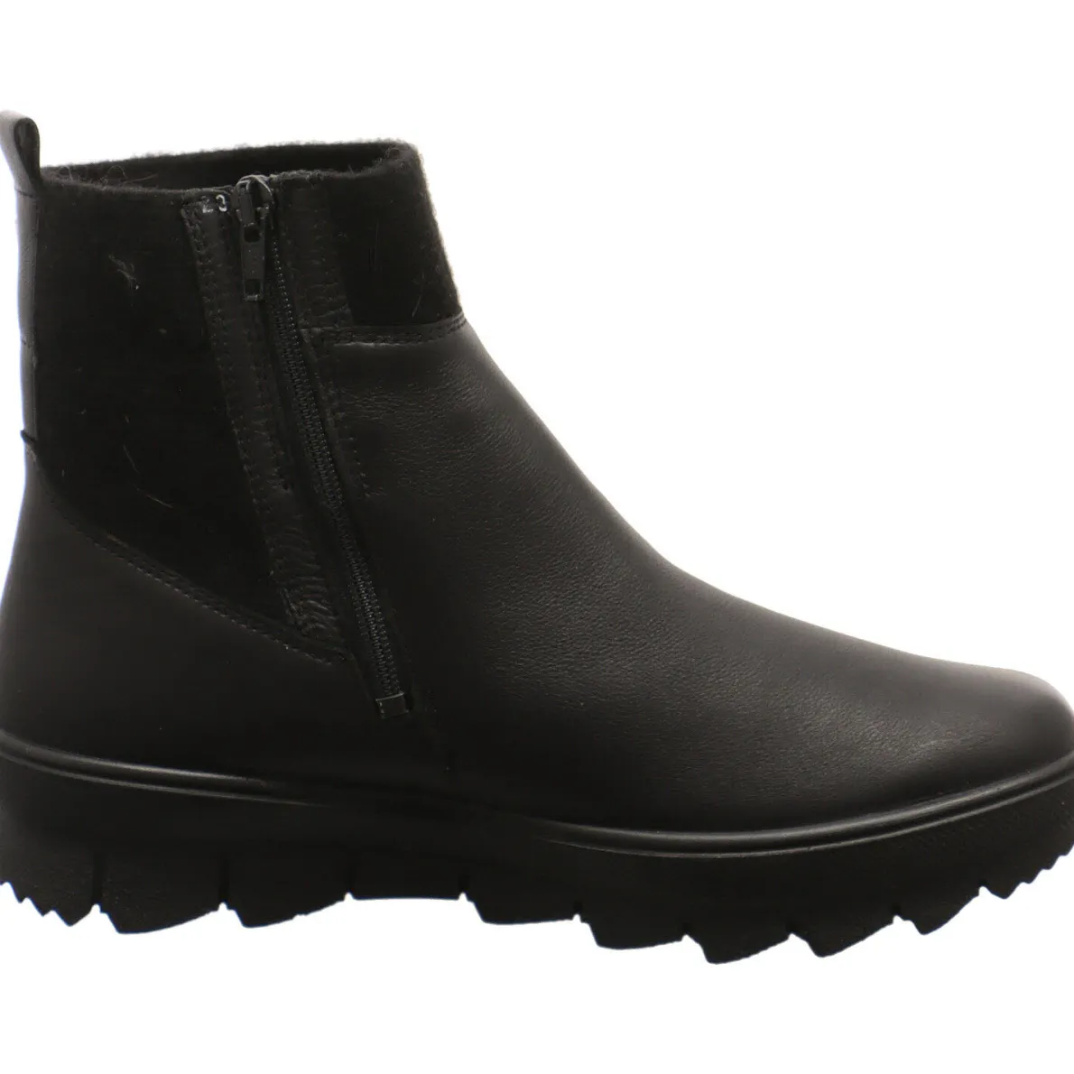 Diese sportliche Damen Stiefelette Novara in Schwarz von Legero überzeugt nicht nur mit ihrem individuellen Design, sondern auch mit ihrer Funktionalität. Der Schuh wurde aus hochwertigem Echtleder gefertigt und ist im Inneren dick und warm gefüttert. Der Schaft ist aus Textil im Filz Look und mit Stretch versehen, dadurch ist der Einstieg besonders einfach. Zusätzlich ist der Stiefel mit einem funktionalen Reißverschluss versehen.