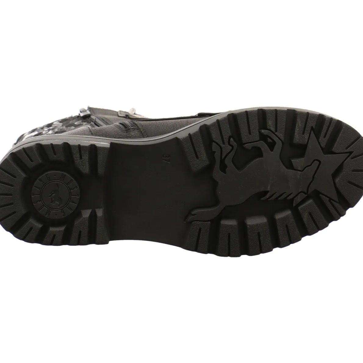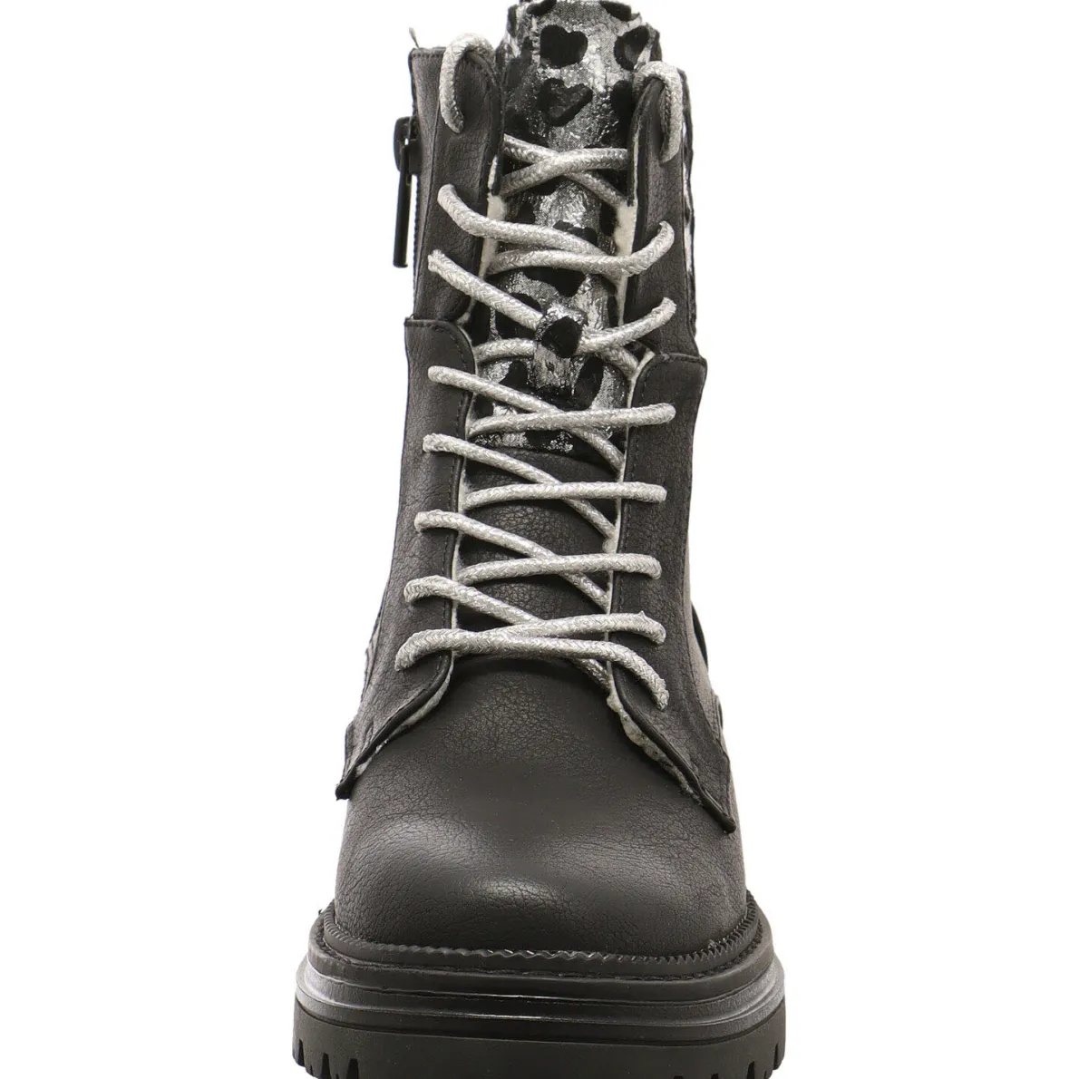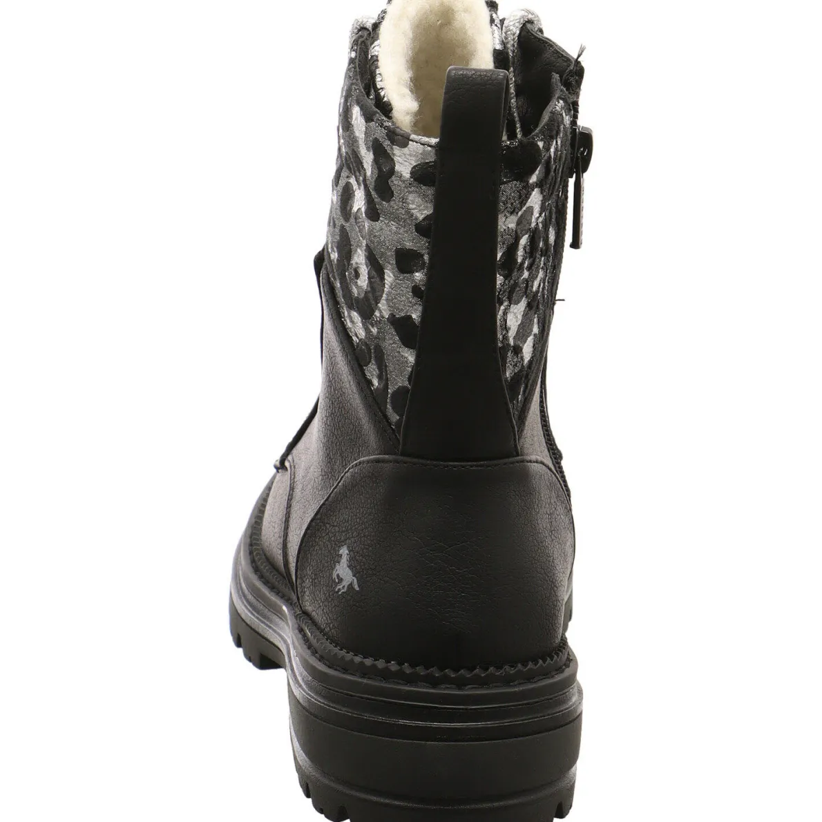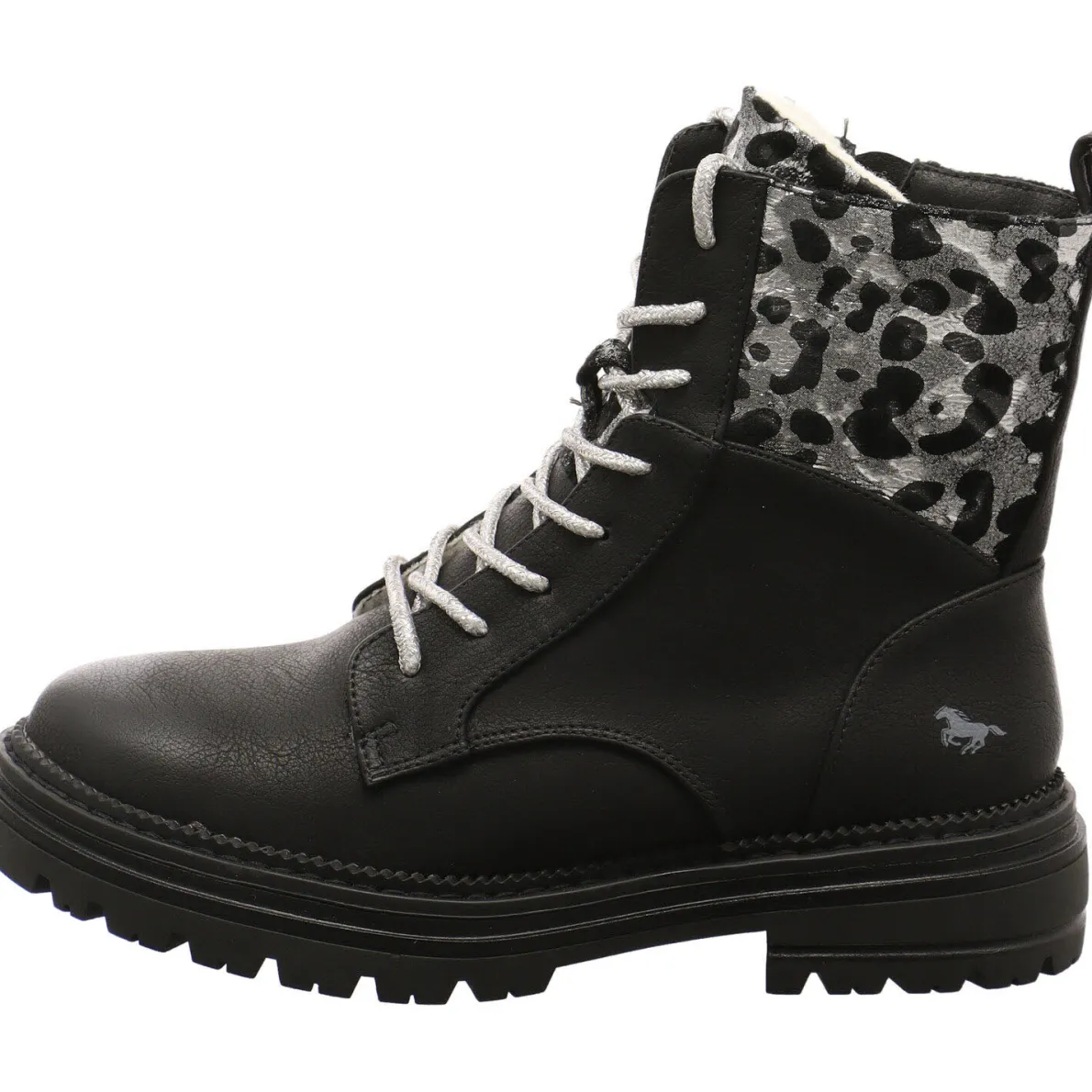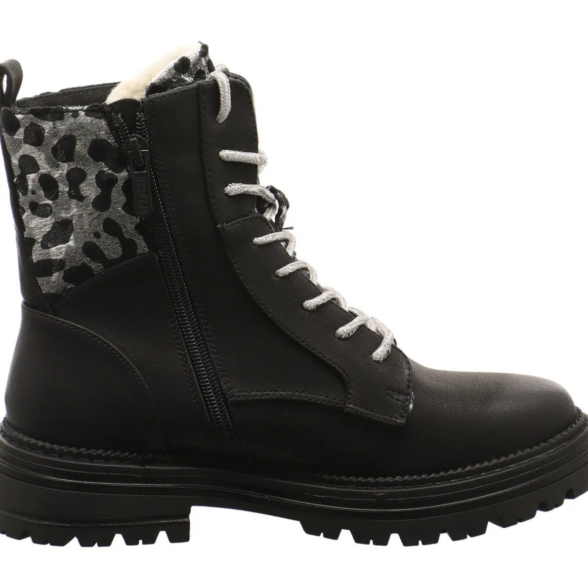 Das Obermaterial wurde aus Kunstleder in Schwarz gefertigt und ist am Schaft mit einem Textil Einsatz, mit Leo Animal Print in Silber Schwarz. Passend dazu, fallen die Schnürsenkel in Glitzer Silber auf. Die super zu dem schimmernden Look des Einsatz passen.