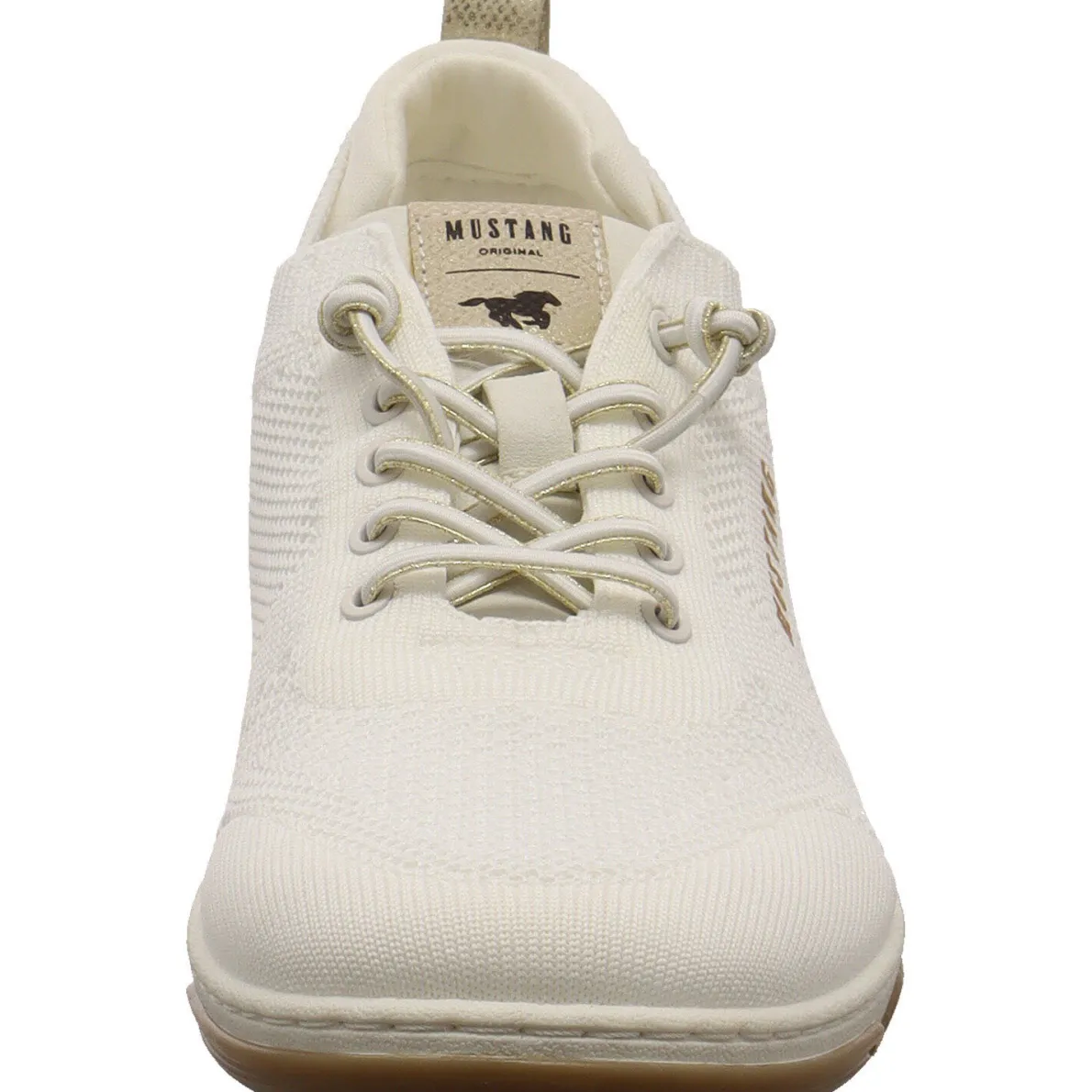 Perfekt für den Alltag ist dieser schöne Damen Schnürschuh von Mustang. Das Obermaterial in Weiß begeistert durch seine Strick Optik. Die perfekte Mischung aus Textil und Synthetik machen den Schuh angenehm leicht und super flexibel. Der Socken ähnliche Schaft ist angenehm weich und durch die Lasche und die Gummischnürung kommst du ganz leicht in den Schuh. Die Gummischnürung hat einen Akzent in Gold und schimmert leicht. Die Gummilaufsohle hat einen guten Grip.