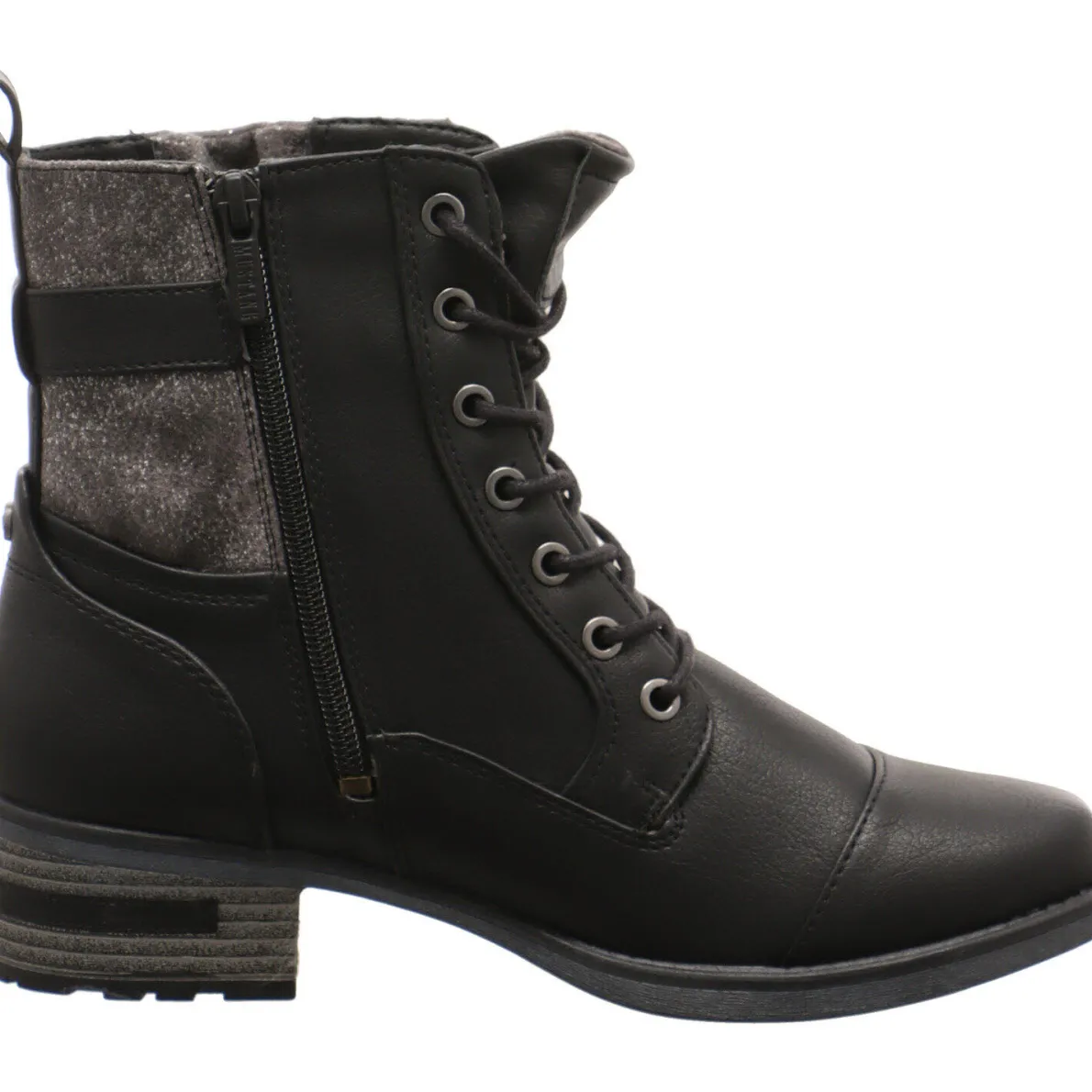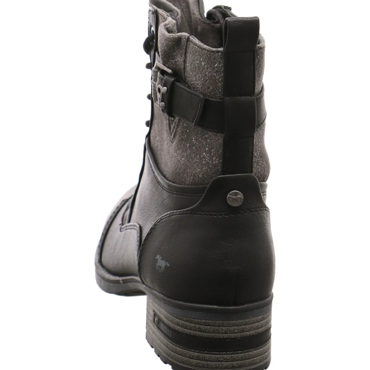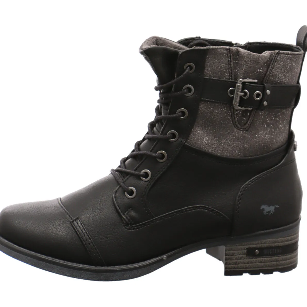 Diese individuelle Damen Schnürstiefelette in Schwarz von Mustang besticht mit authentisch genarbtem Kunstleder und sorgt für einen coolen Auftritt. Der Einsatz am Schaft in Grau mit kleinen Glitzer Details in Kombination mit der Schnalle und dem Riemen um den Schaft herum passen perfekt zum Look des Schuhs.