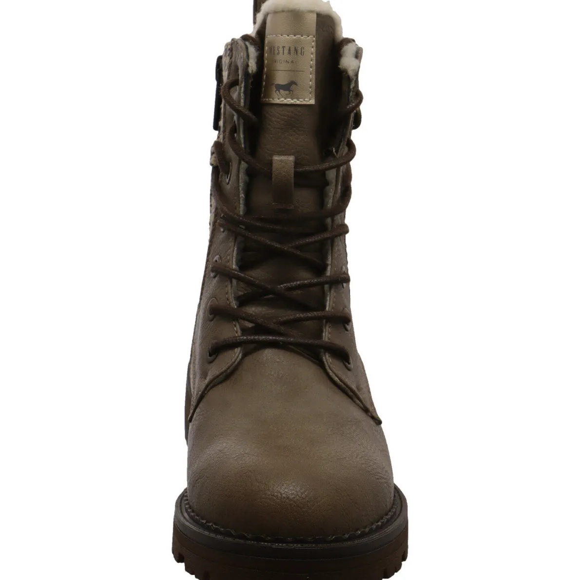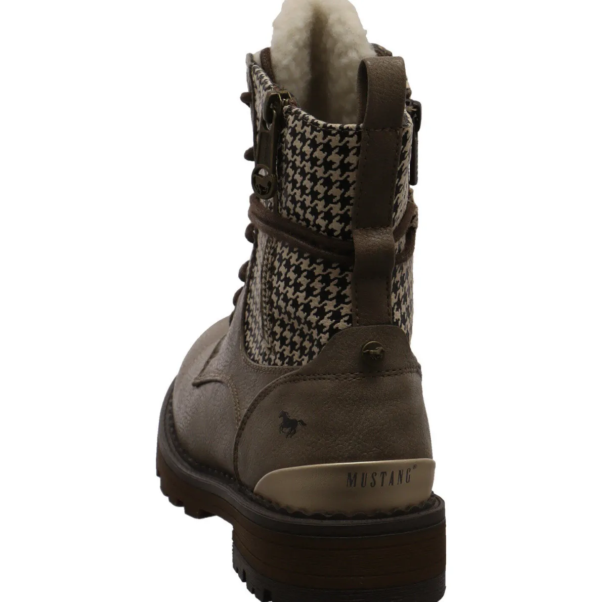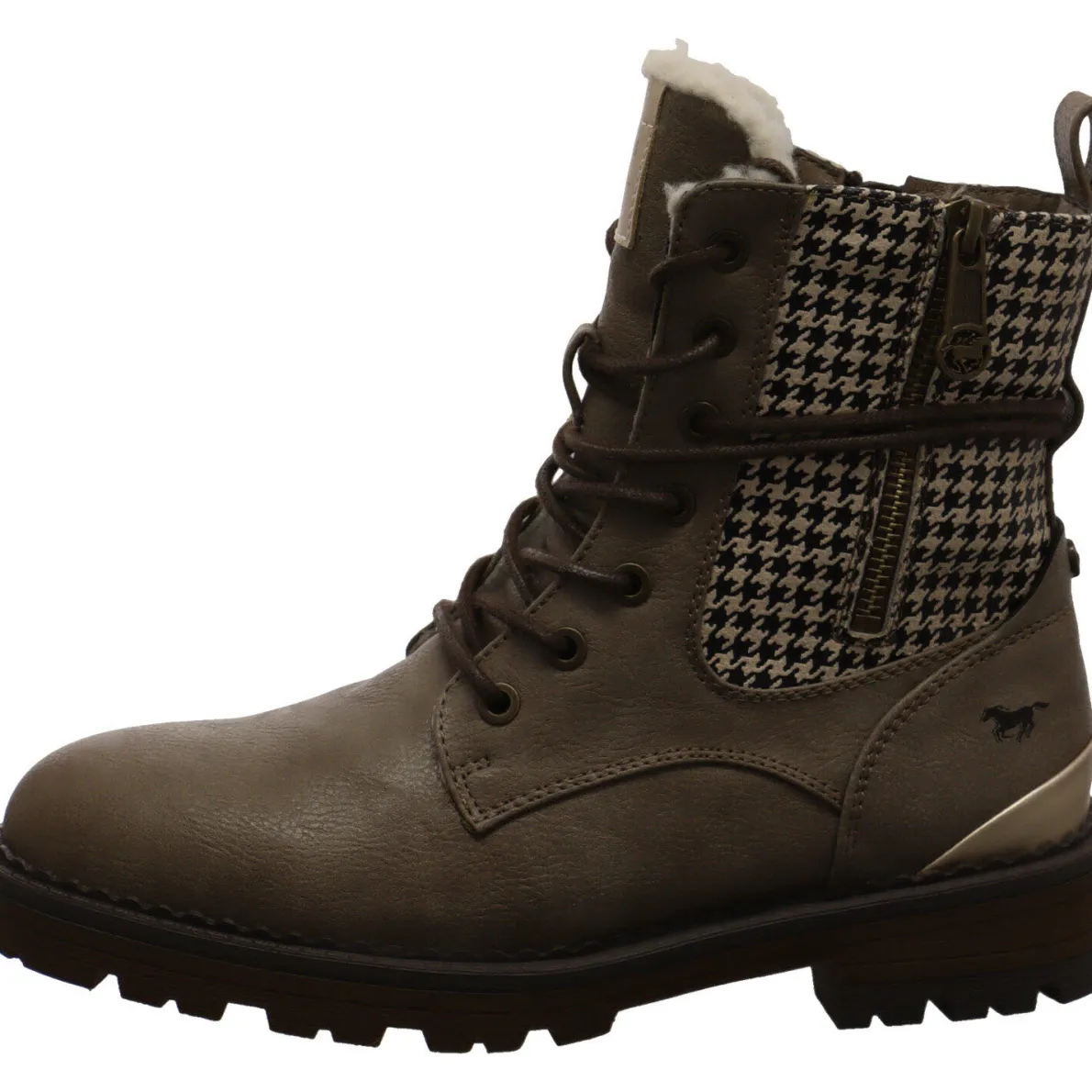 Diese individuelle Damen Winter Schnürstiefelette in Beige von Mustang besticht mit attraktivem Lederimitat und verleiht dir einen coolen Auftritt. Der Einsatz mit dem auffällligen Muster am Schaft in Verbindung mit dem Zierreißverschluss in Gold sind absolute Hingucker.