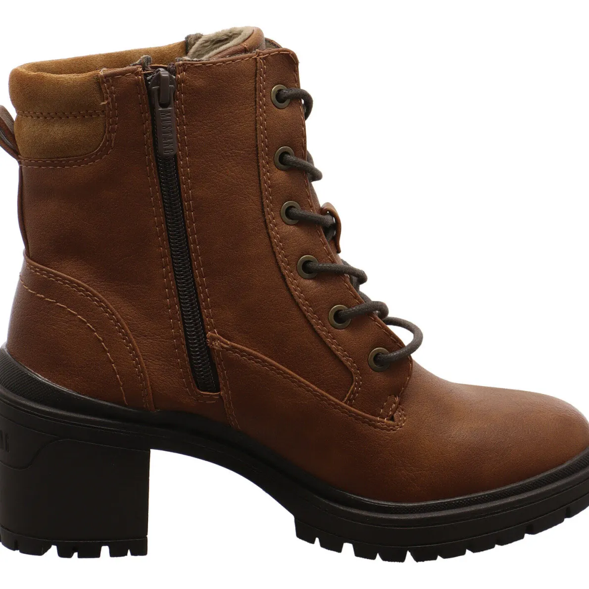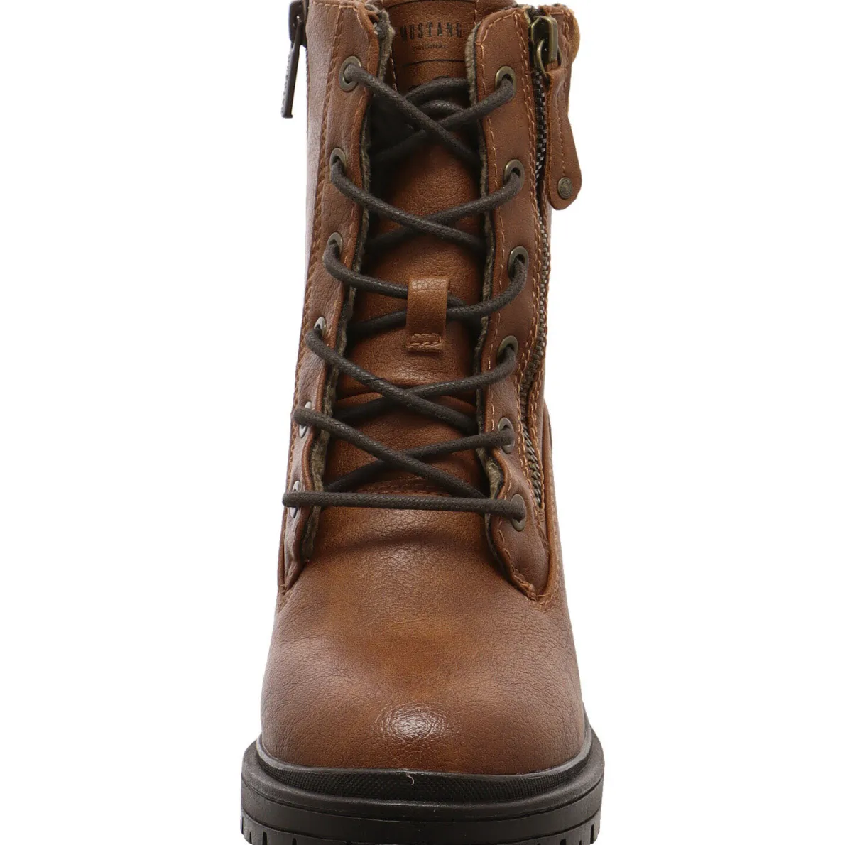 Diese Damen Schnürstiefelette von Mustang ist ein absoluter Eyecatcher. Das Obermaterial aus authentisch genarbtem Kunstleder in Kastanie Braun wird durch den gepolsterten Schaftrand aus Textil und dem Zierzipper neben der Schnürung gekonnt in Szene gesetzt. Abgerundet wird der auffällige Look durch die markante, gut profilierte Laufsohle mit dem Blockabsatz, der lange Beine zaubert. Die Kombination aus der Lasche am Schaft und dem seitlichen Reißverschluss garantiert einen leichten Ein- und Ausstieg. Durch die Schnürung kann der Schuh perfekt an den Fuß angepasst werden.