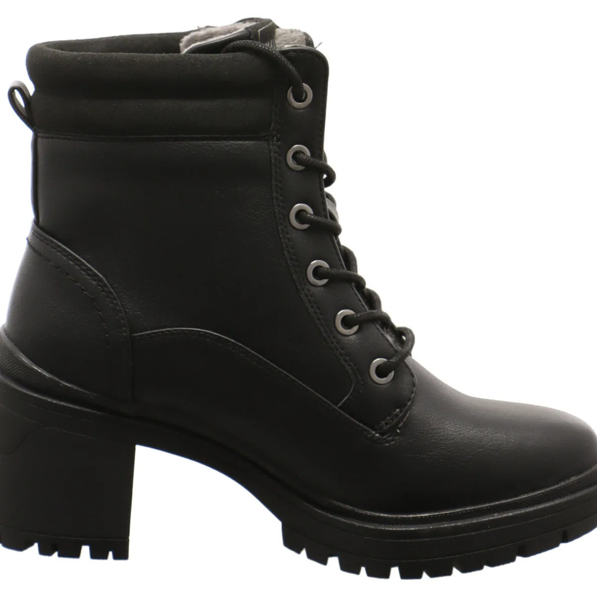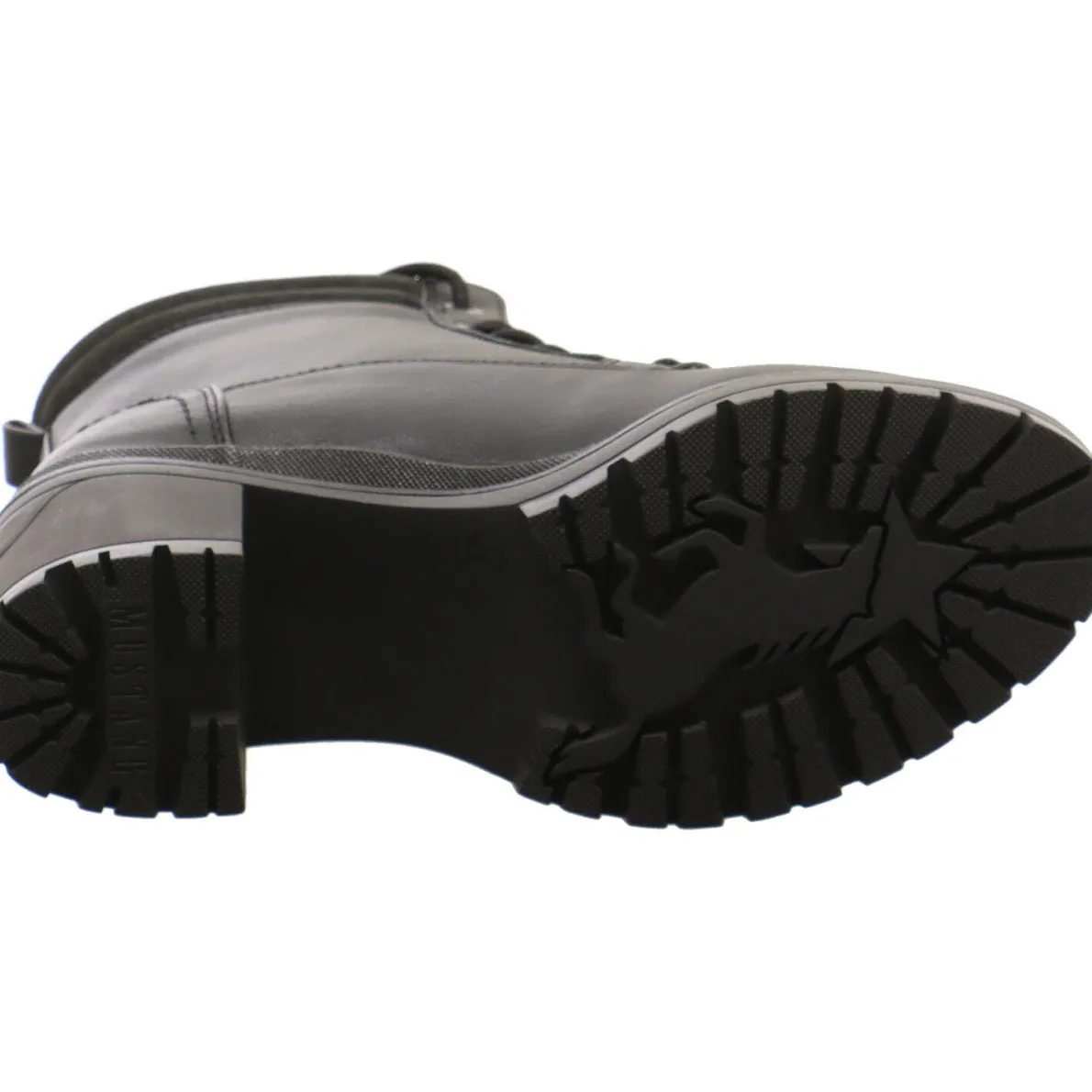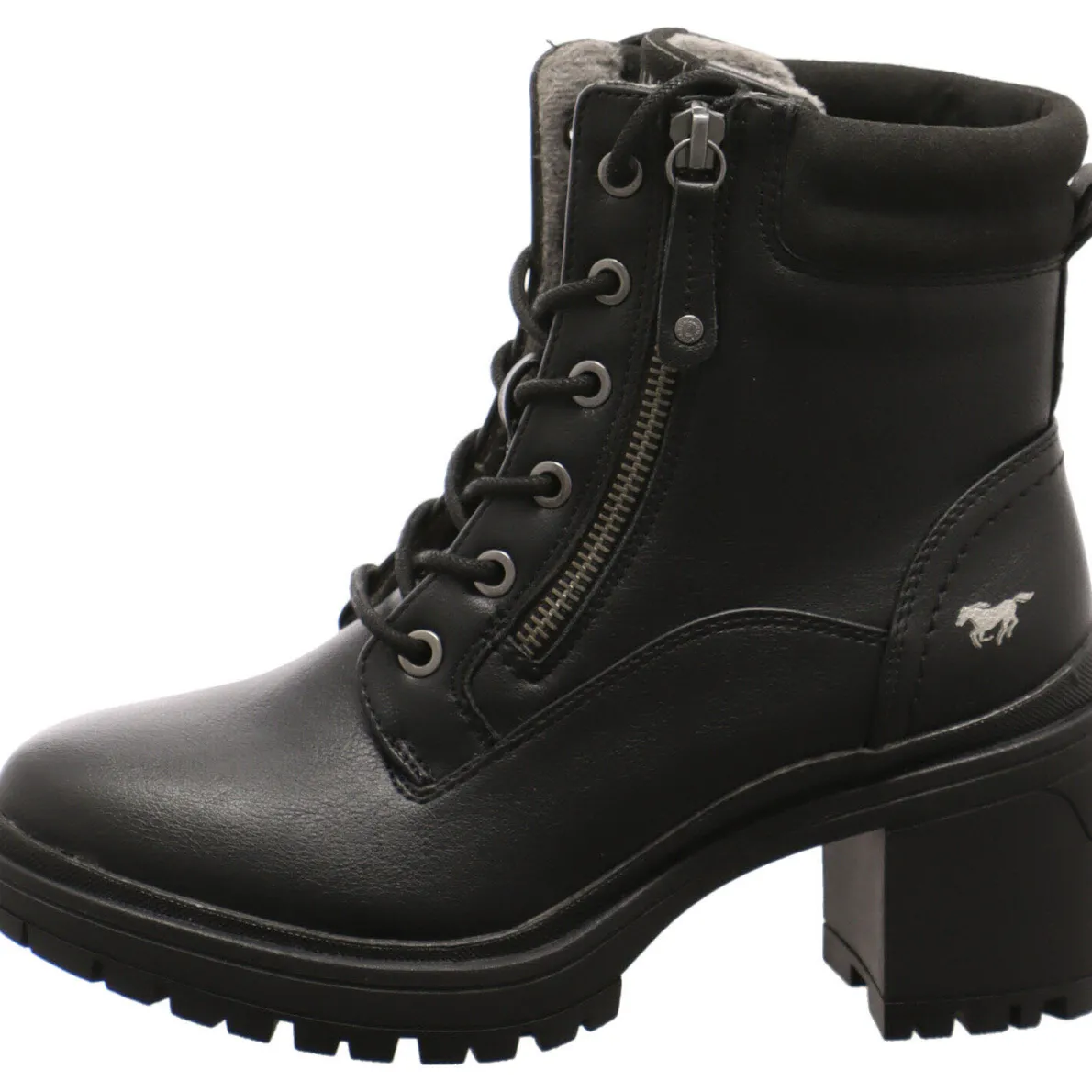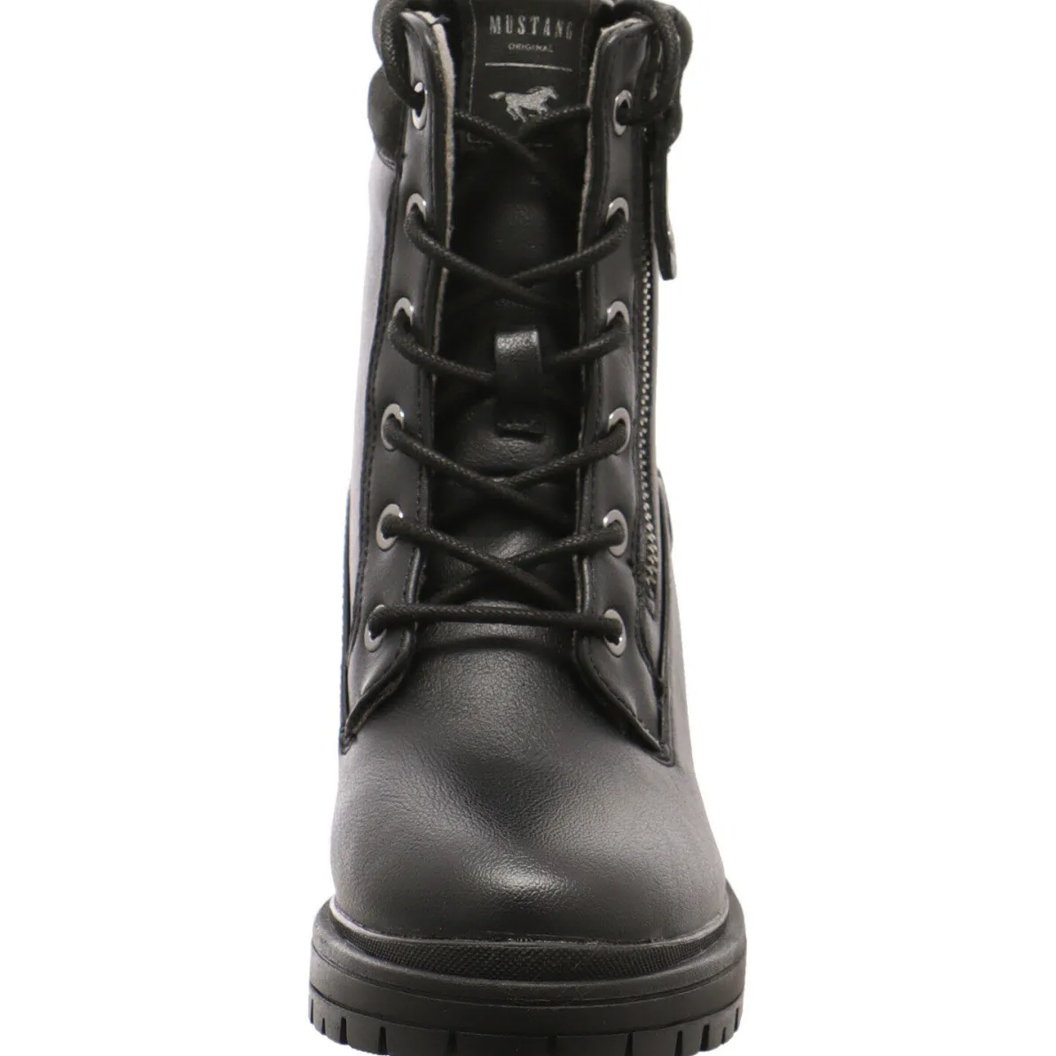 Diese Damen Schnürstiefelette von Mustang ist ein absoluter Eyecatcher. Das Obermaterial aus authentisch genarbtem Kunstleder in Schwarz wird durch den gepolsterten Schaftrand aus Textil gekonnt in Szene gesetzt.