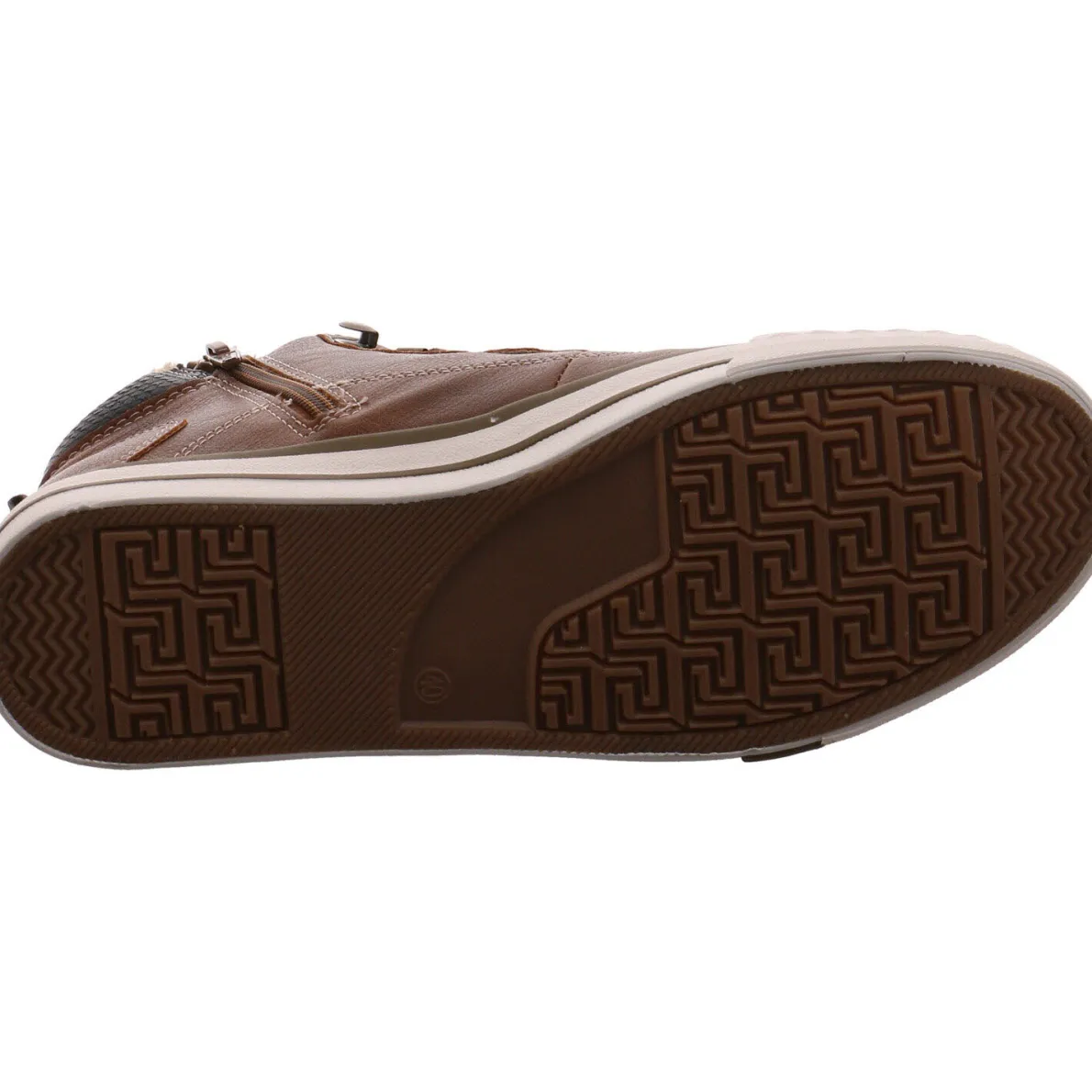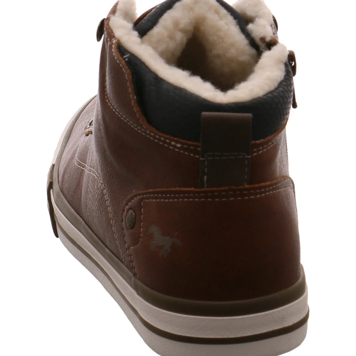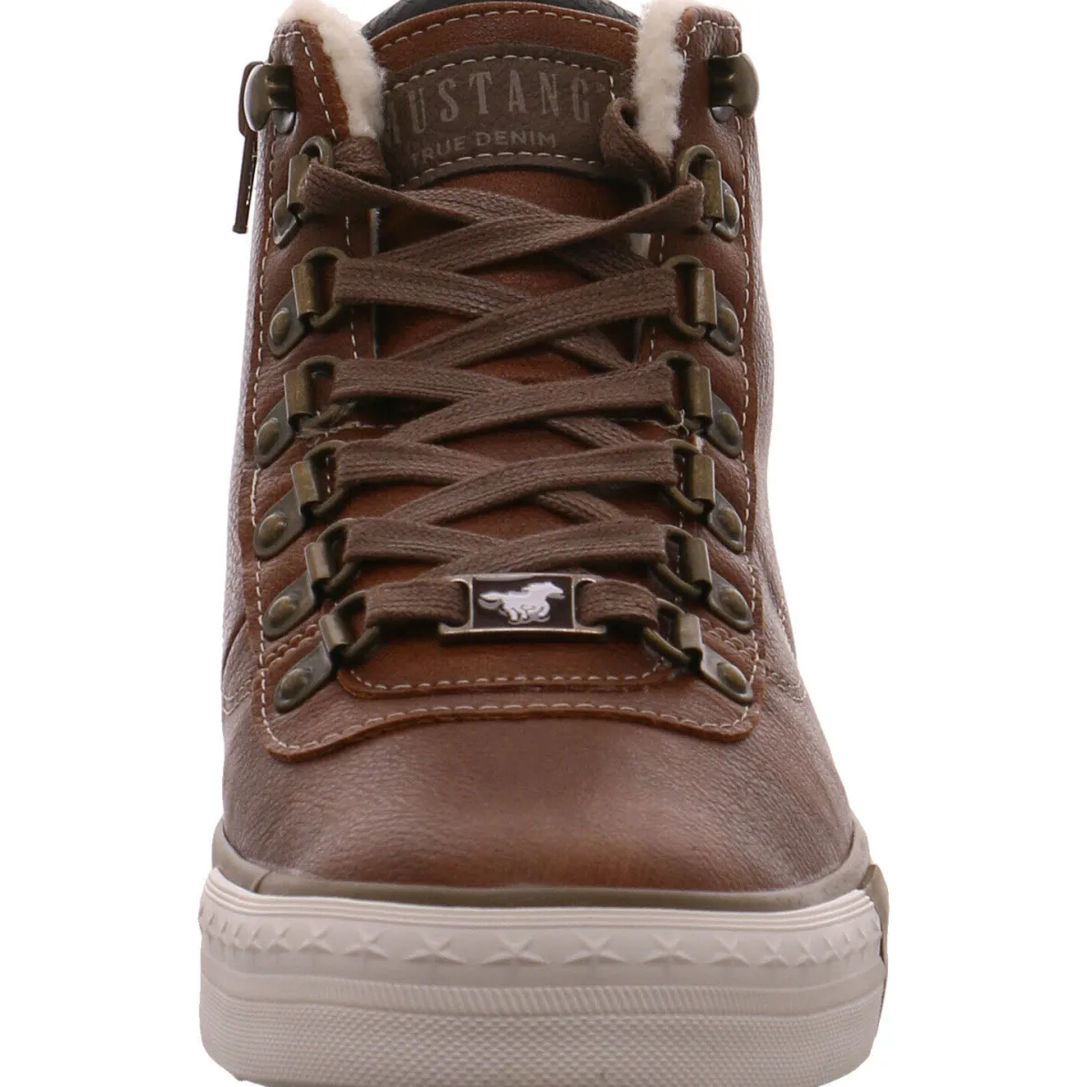 Dieser sportlich lässige Herren Hightop Sneaker von Mustang aus pflegeleichtem Kunstleder in Cognac Braun rundet jedes Casual Outfit perfekt ab.