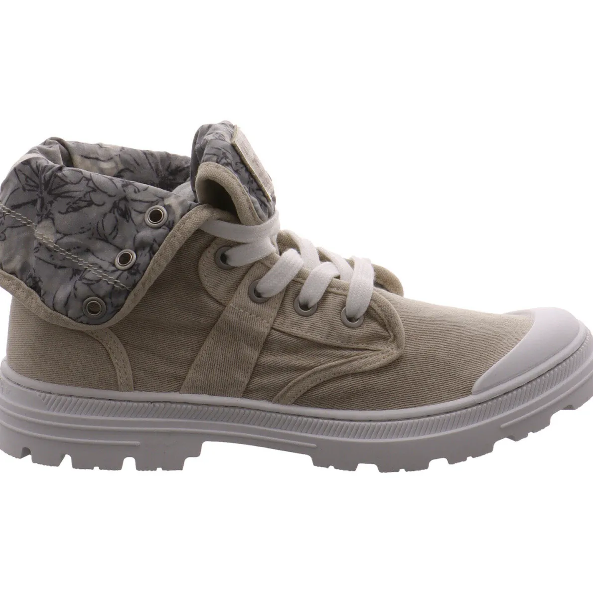 Gefertigt aus Textil im Denim Look in Beige, welches durch die Schnürsenkel und die Synthetik Kappe in Weiß toll zur Geltung kommt. Die Innenseite des Schuhs ist mit einem Blumen Muster gefertigt. Man kann den Oberen Teil des Schuhs runterklappen, damit das Blumen Muster zur Geltung kommt. Natürlich kann man den Schuh aber auch tragen, indem man die Schnürsenkel bis oben hin schnürt. Weitere Details sind die Ziernähte und die auffälligen Nieten.