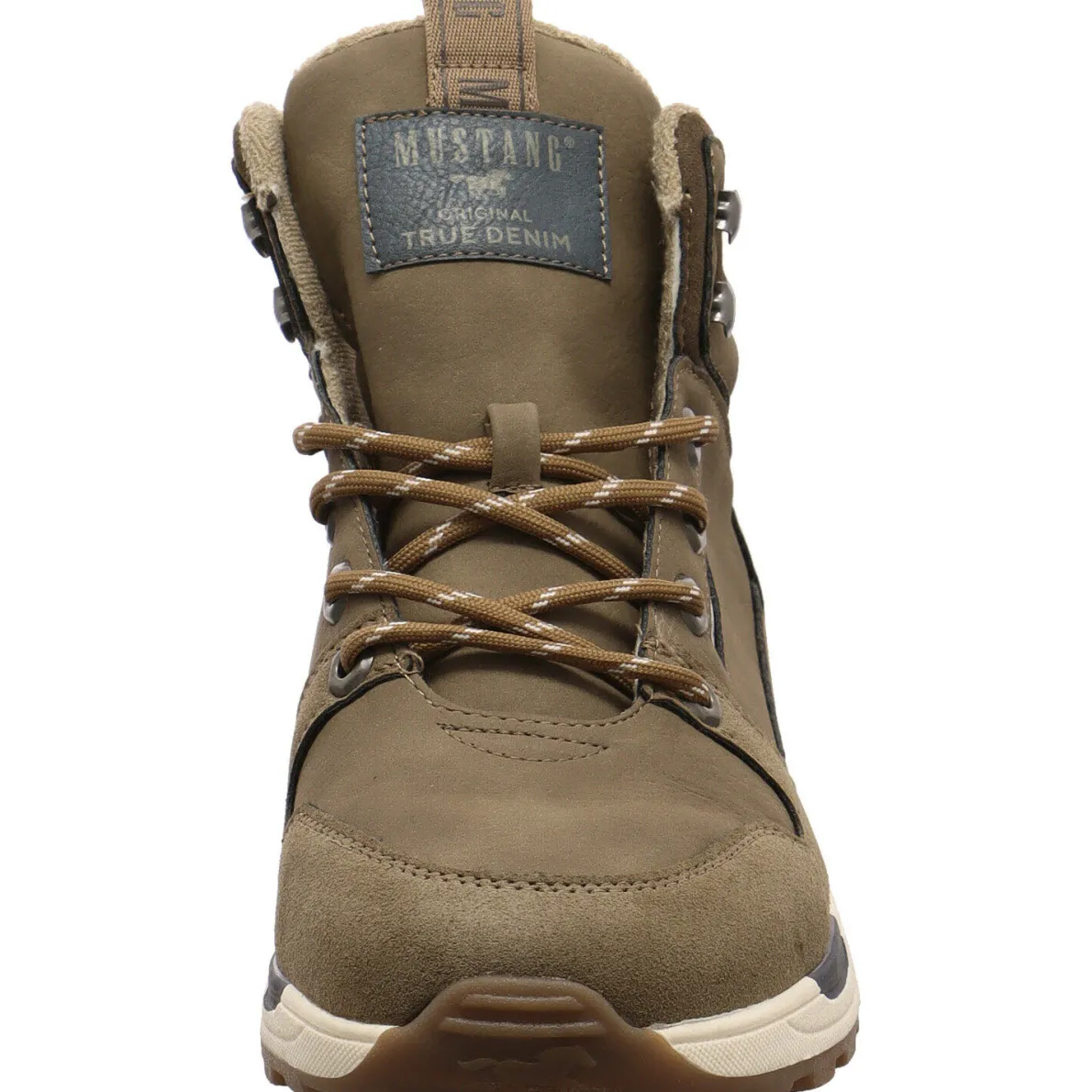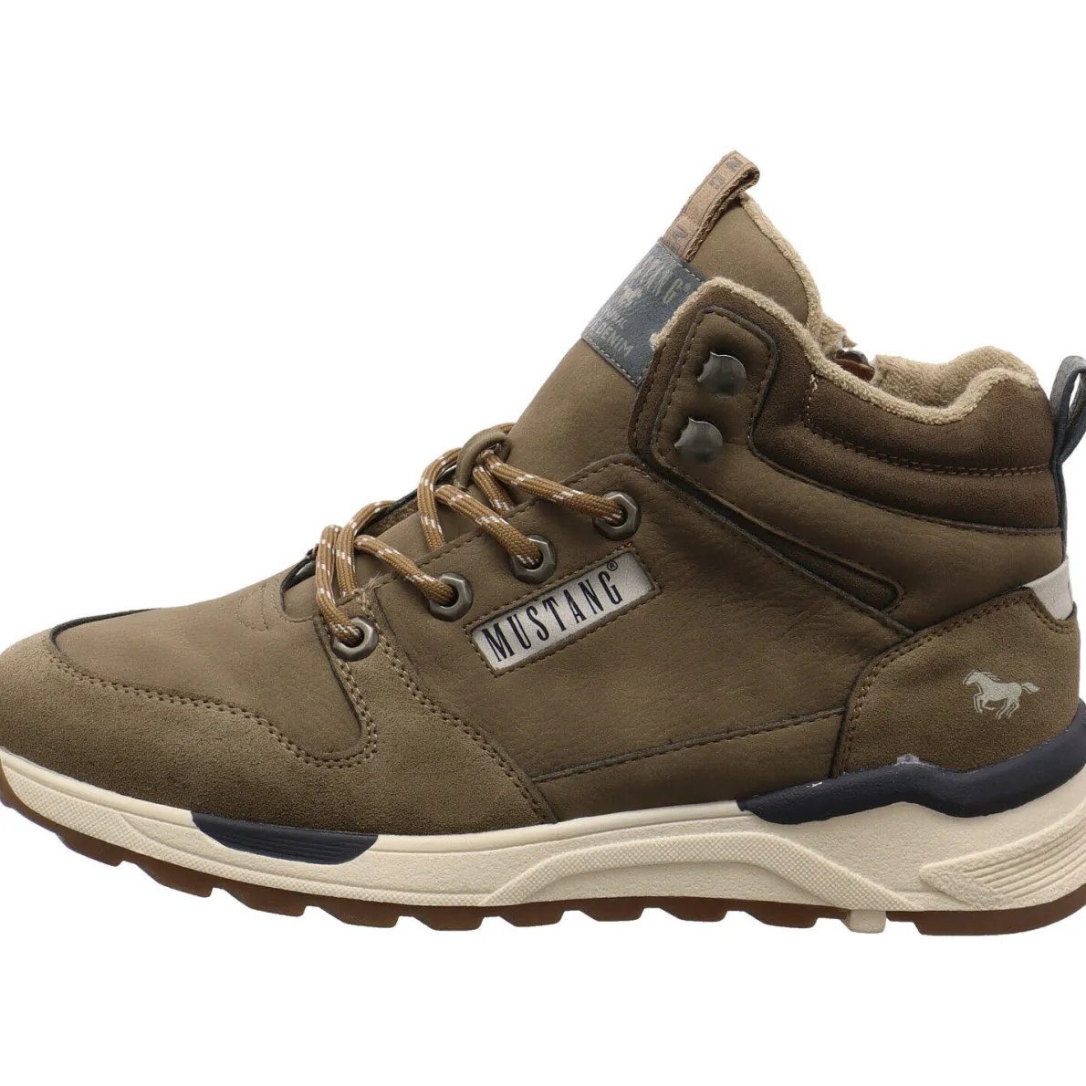 Dieser sportlich lässige Herren Hightop Sneaker von Mustang aus pflegeleichtem Kunstleder in Braun rundet jedes Casual Outfit perfekt ab.
