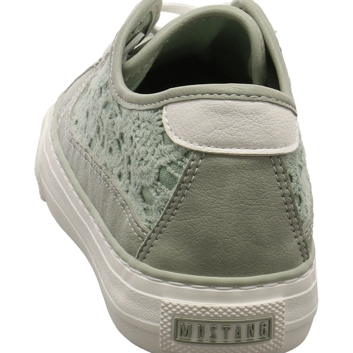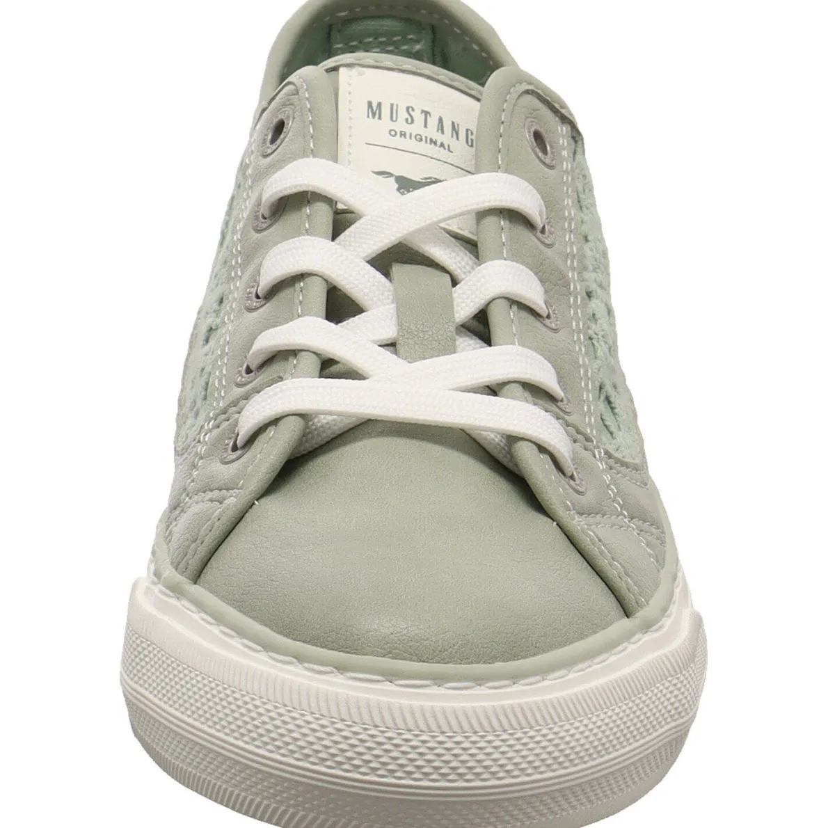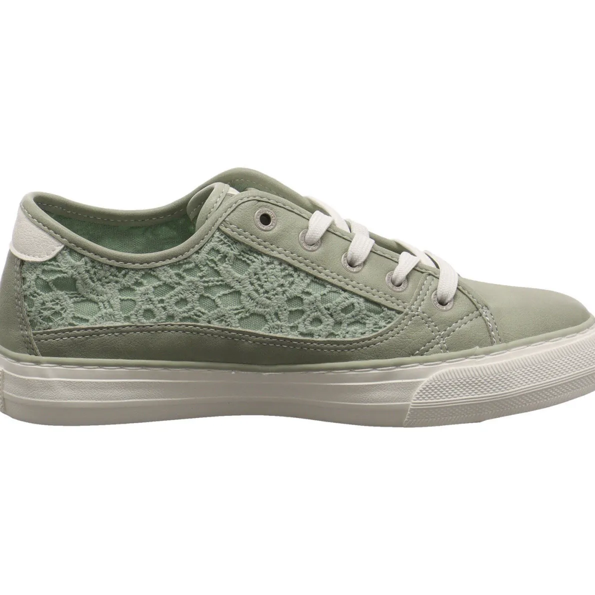 Dieser Damen Sneaker in angesagtem Pastell Grün von Mustang besticht auf den ersten Blick durch seinen femininen Spitzenbesatz.