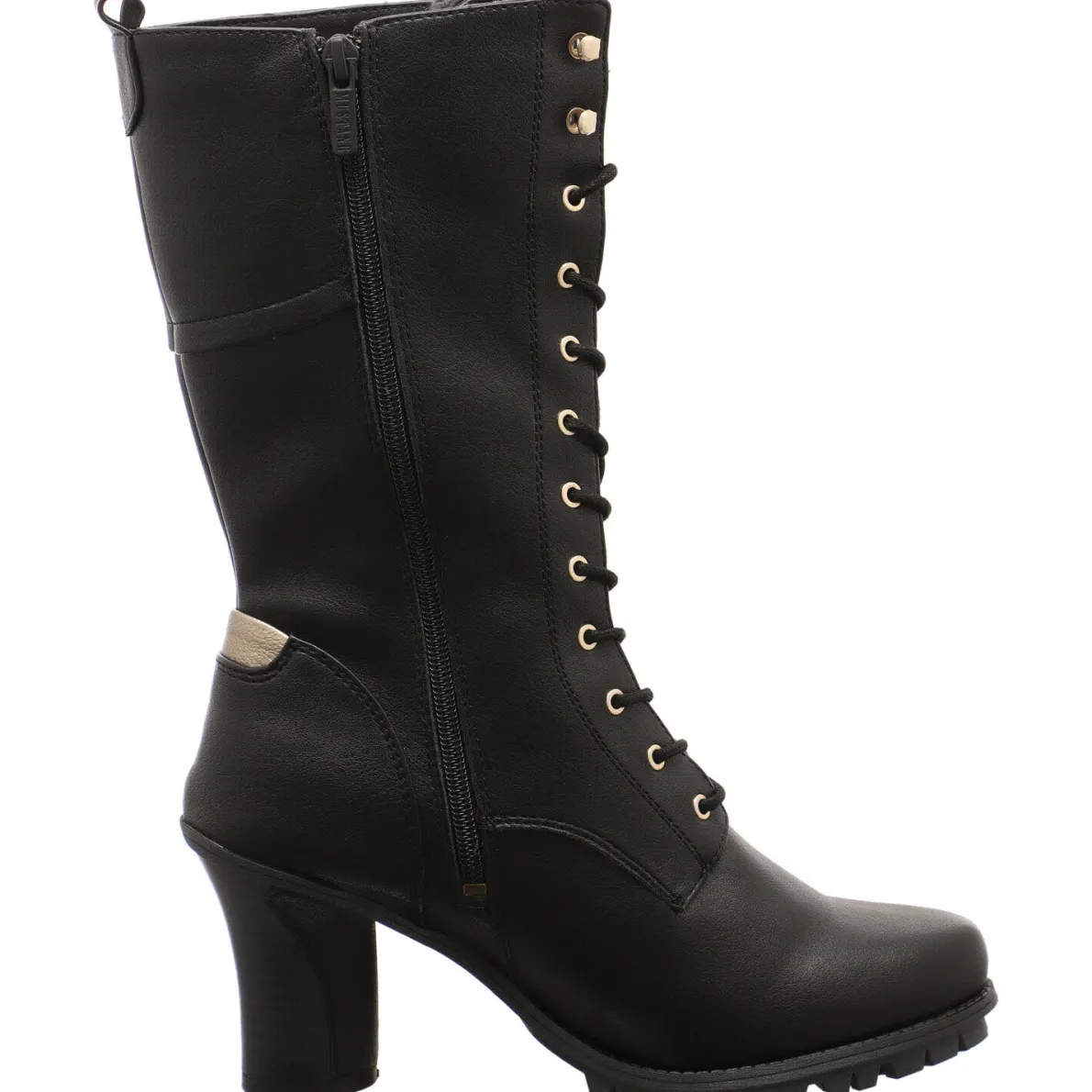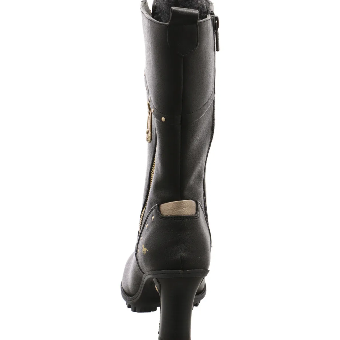 Das Obermaterial aus Kunstleder in Schwarz, wird durch Nieten und einem Zierzipper in Gold, an der Seite vom Schaft gekonnt in Szene gesetzt.