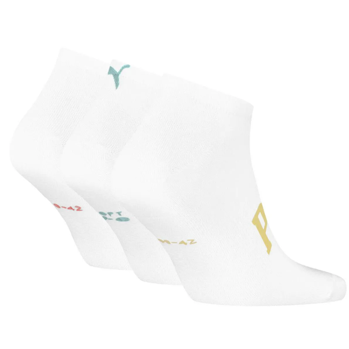 Das Set beinhaltet drei Paar in Weiß mit dem Logo in Gelb, Grün und Rot.
