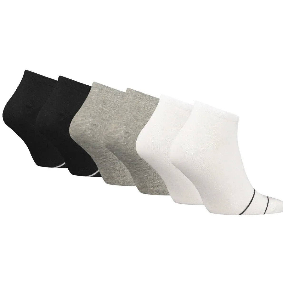 Das Set beinhaltet sechs Paar, davon zwei Paar in Schwarz, zwei Paar in Weiß und zwei Paar in Grau.
