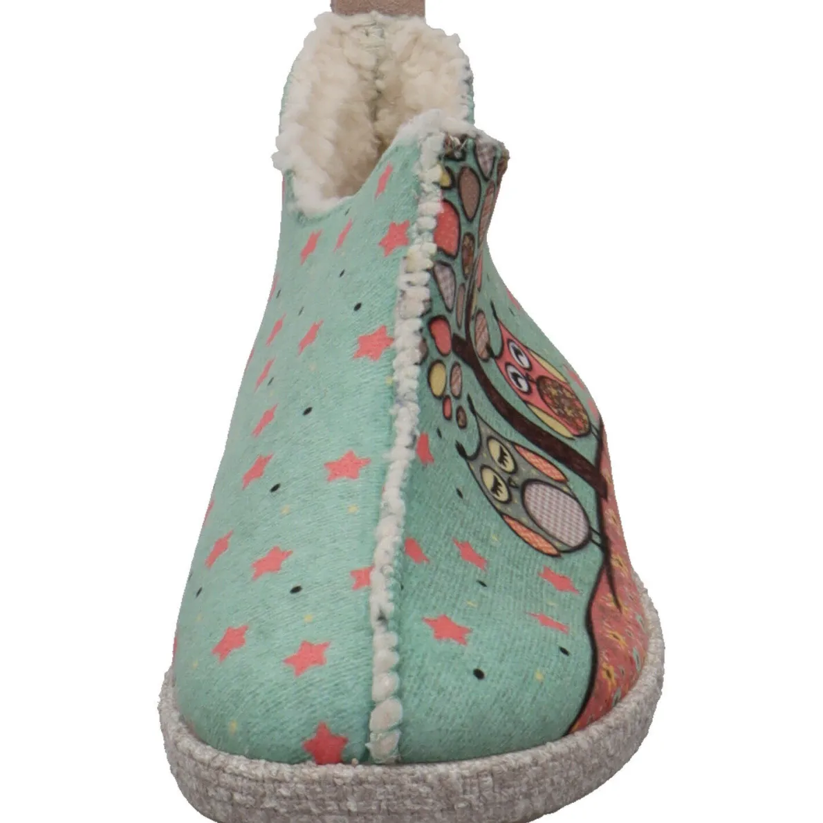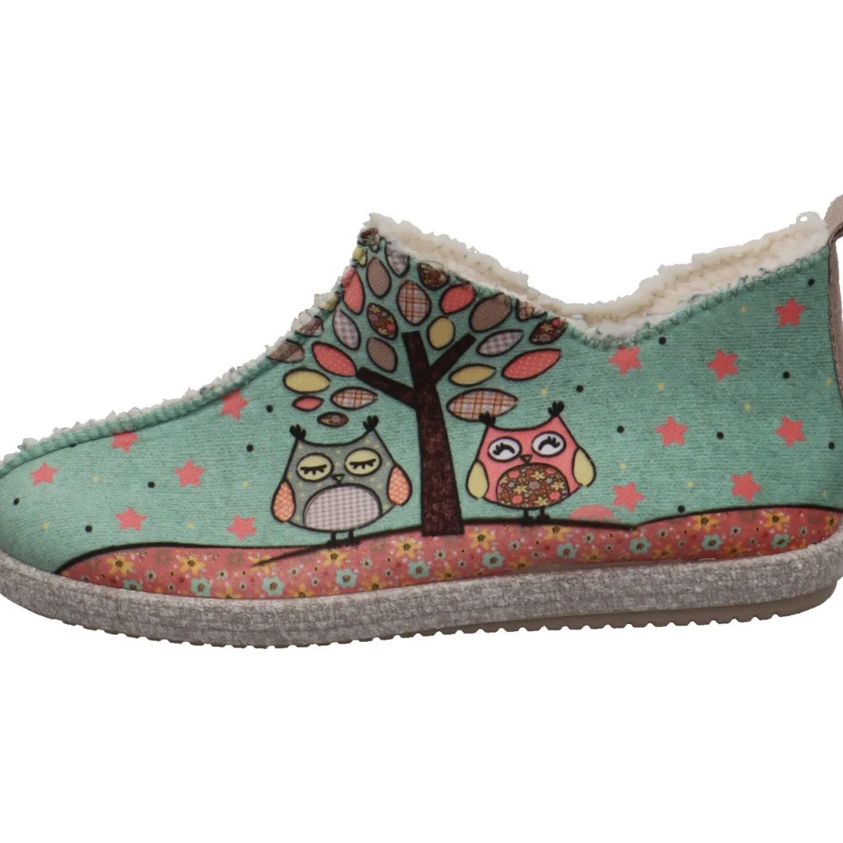 Das Obermaterial ist aus Textil in Grün und mit zwei Eulen und einem Baum verziert, welche den Schuh zu einem tollen Blickfang machen. Sterne in Pink sind ein weiterer Eyecatcher. Dabei sorgt das flauschige Innenfutter für warme Füße. Die Schnittführung des Hüttenschuh, sorgt für perfekten Halt am Fuß und verleiht dem Schuh eine modernen Look. Die Textillasche am Schaft hilft dir bei einem leichten Einstieg.