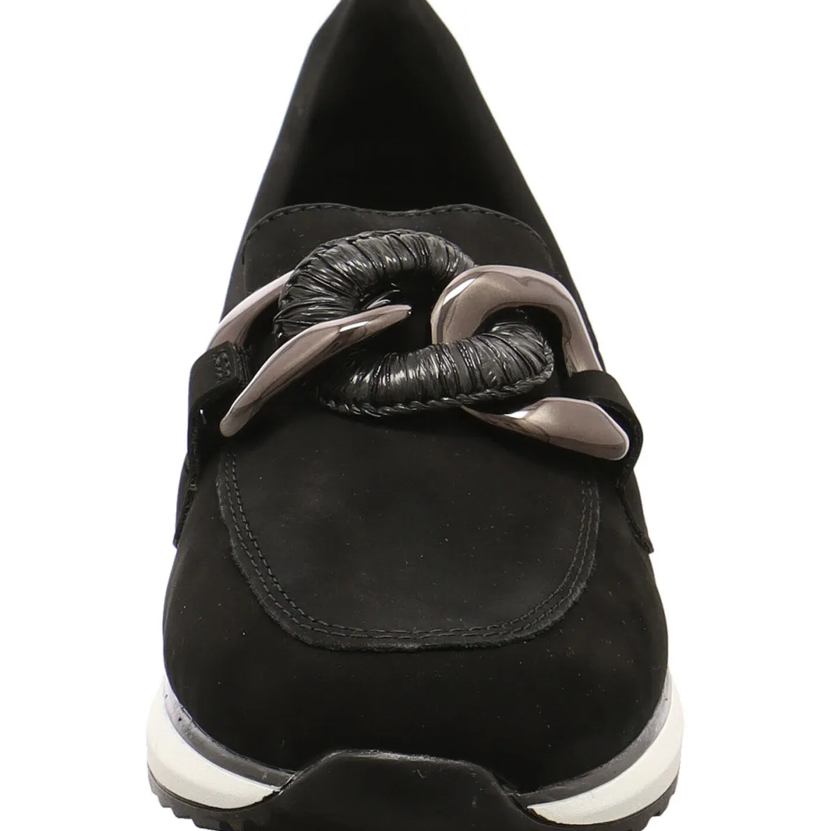 Dieser elegante Remonte Damen Loafer Slipper in klassischem Schwarz aus Nubukleder zieht mit Sicherheit Blicke auf sich. Die Gliederkette auf dem Blatt ist ein echter Hingucker und gibt dem tollen Schuh eine besondere Note. Für Komfort sorgt die Remonte Soft Innensohle, welche im vorderen Bereich perforiert und als Wechselfußbett gearbeitet ist. Die feminine Form verleiht dem Schuh eine klassische Eleganz, mit der du jedes Outfit zum Highlight machst.
