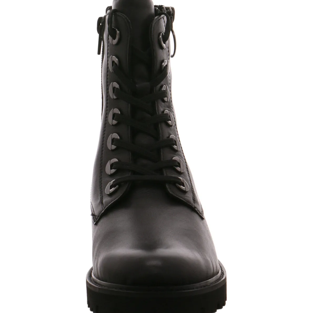Gefertigt aus hochwertigem Echtleder in Schwarz fungiert der Schuh als schicker Eyecatcher. Highlights sind die Metallnieten an der Schnürung und der Zipper an der Außenseite.