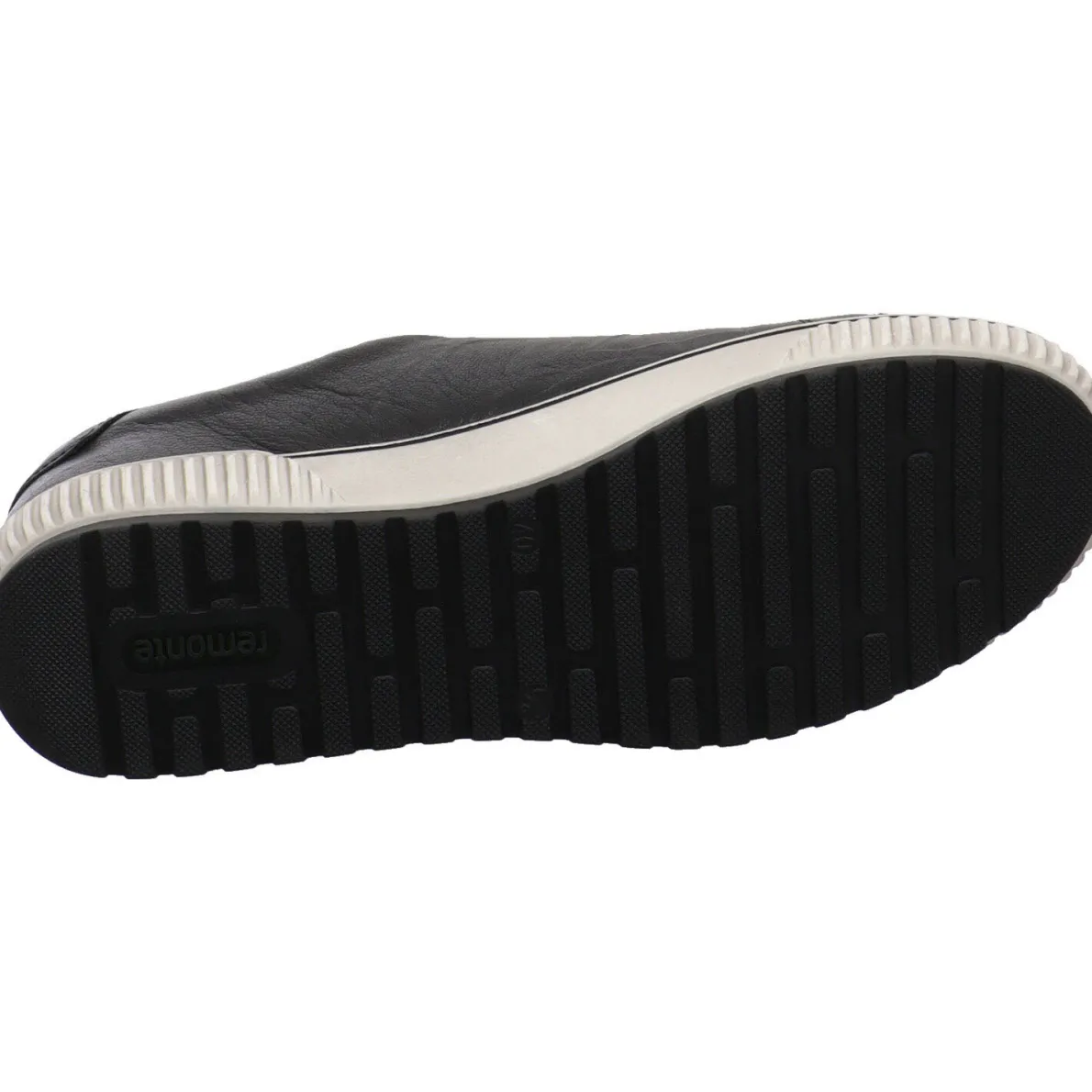 Die Remonte Soft Innensohle ist angenehm weich und als Wechselfußbett gearbeitet. Die Laufsohle hat Grip und ist mit einer Umrandung in Weiß mit dem Obmaterial verbunden. Diese macht ihn robust und verleiht dem Schuh seinen sportlichen Look.