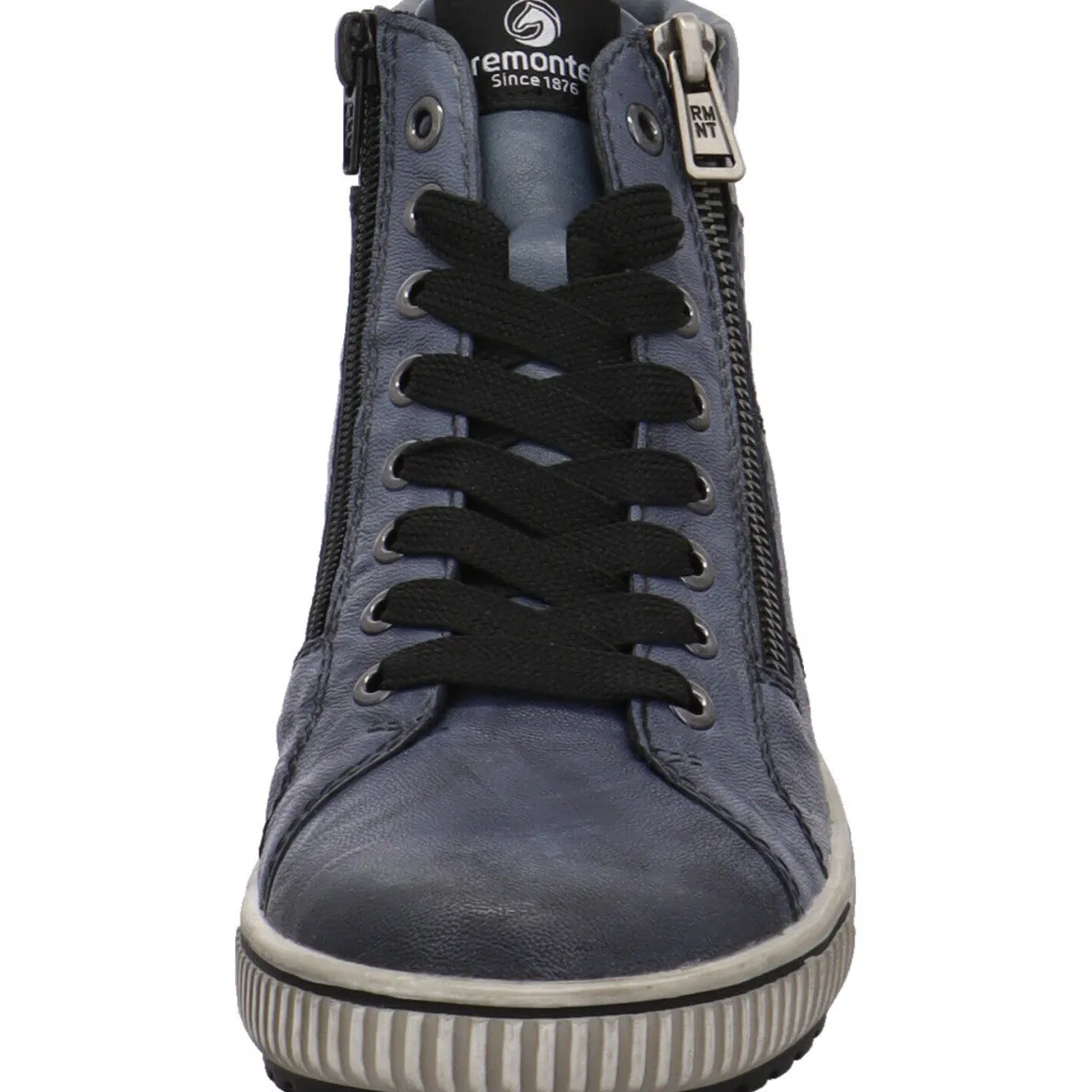 Das Obermaterial wurde in einem Mix aus Echtleder und Synthetik in Blau gefertigt. Einen schnellen und komfortablen Ein- und Ausstieg ermöglicht der doppelte Reißverschluss und die Schnürung. Die Hell abgesetzte Laufsohle verleiht dem Schuh, den typischen Sneaker Look.