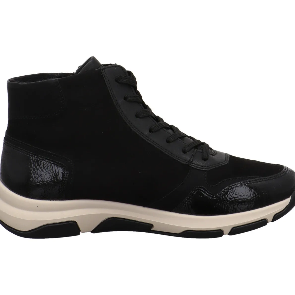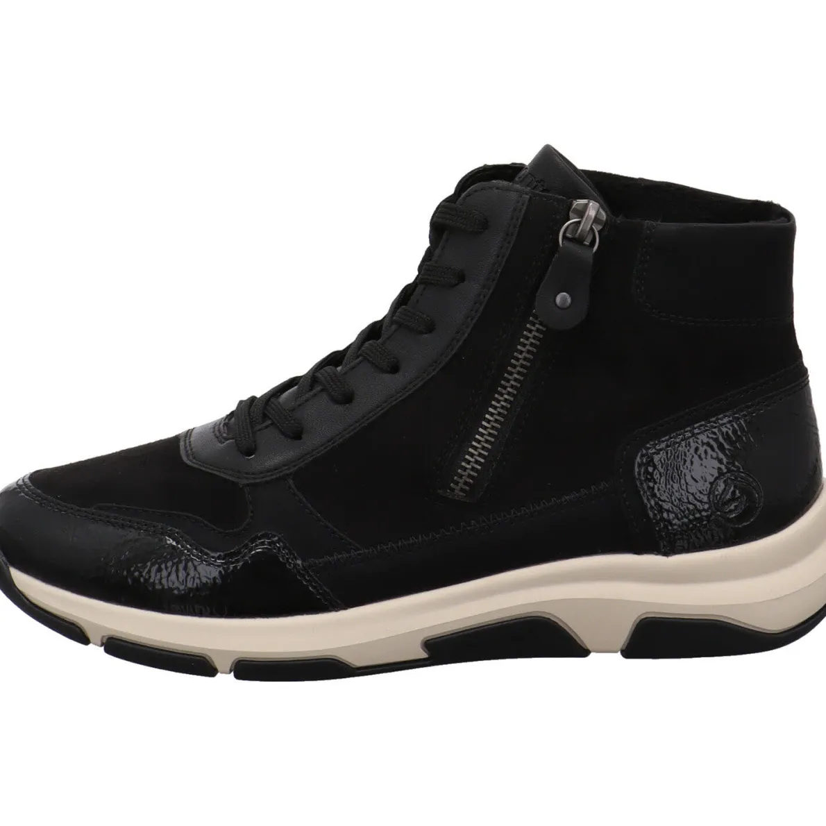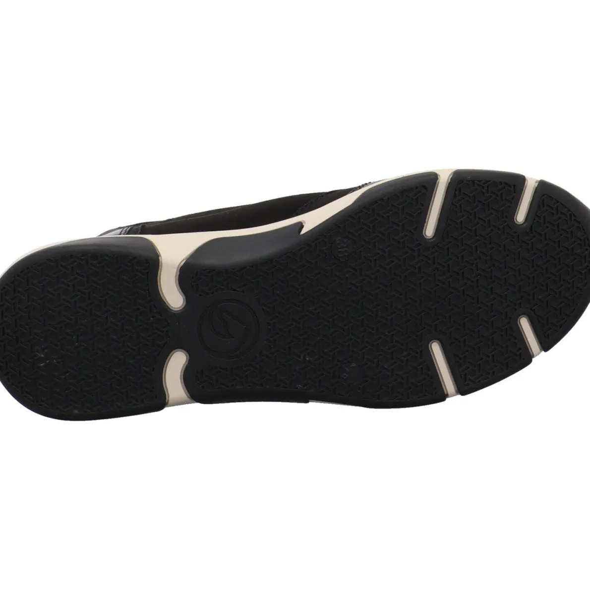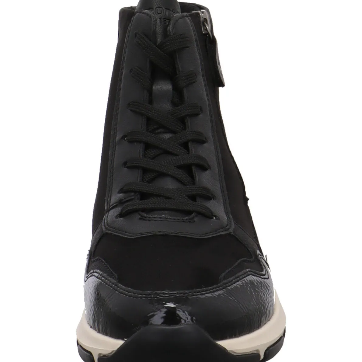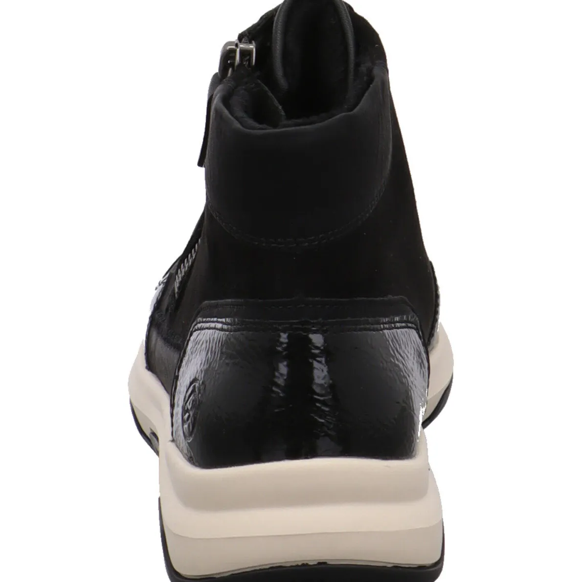 Das Obermaterial wurde aus einem gekonnten Mix aus Kunstleder und Textil in Schwarz gefertigt. Sie begeistert durch ihre untschiedlichen Haptiken und den Lack Einsatz. Durch den seitlichen Reißverschluss ist der Einstieg ganz einfach und mit der Schnürung kann der Schuh genau auf deine Bedürfnisse angepasst werden. Die Remonte Soft Innensohle ist angenehm weich gepolstert und im Vorderfuß perforiert. Zudem ist sie als Wechselfußbett gearbeitet. So kannst du auch eigene Einlagen verwenden.