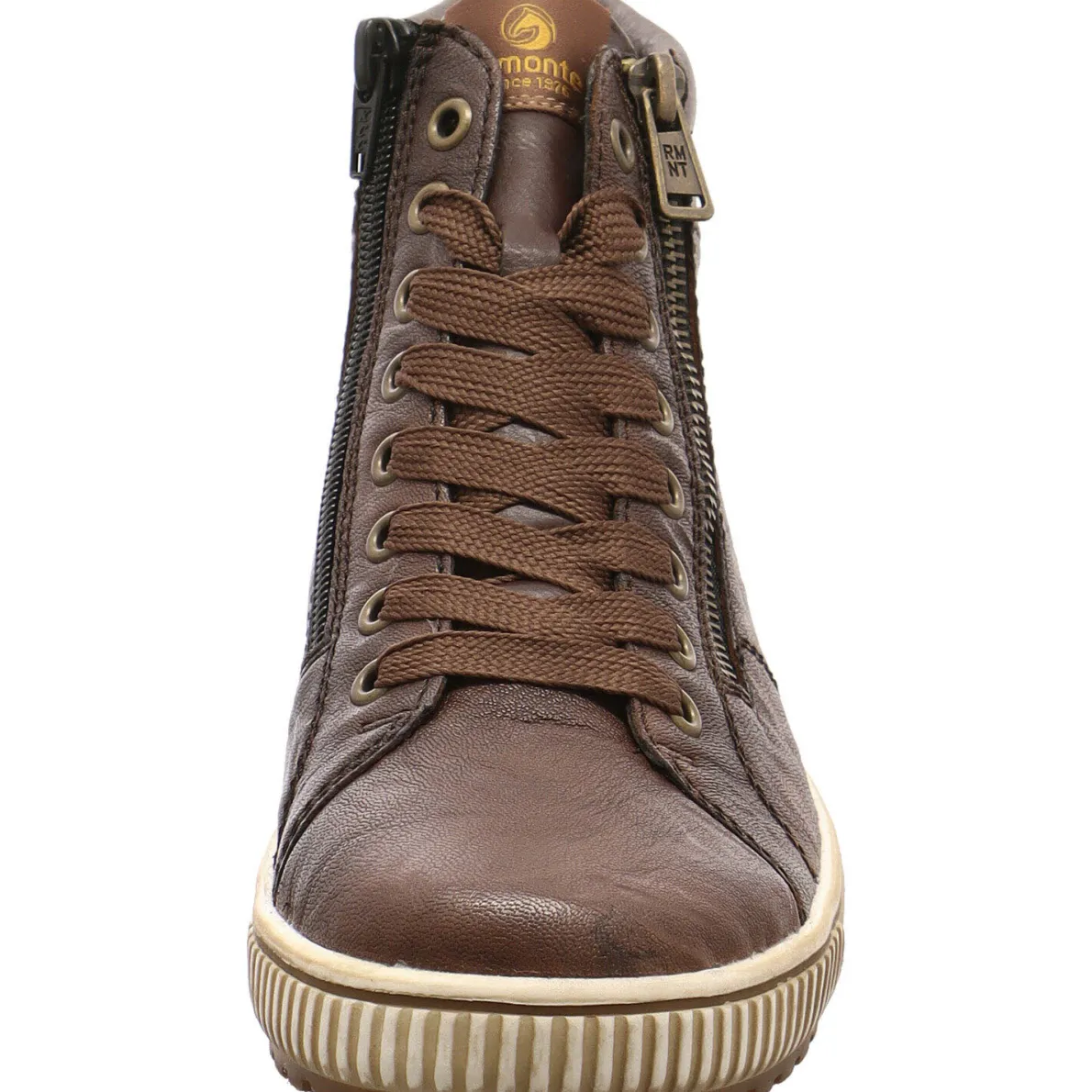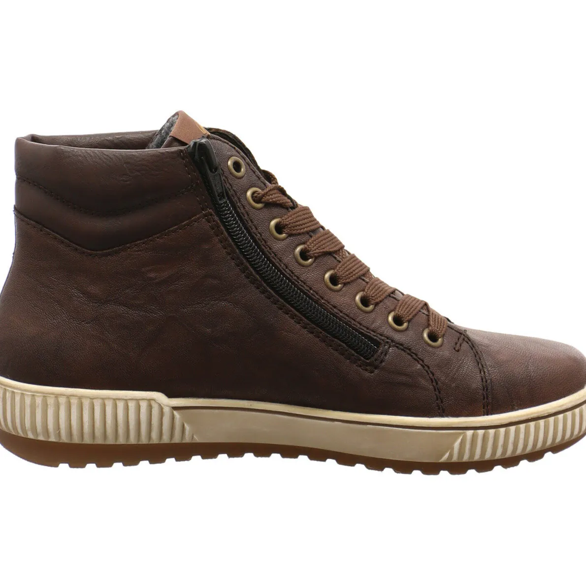 Das Obermaterial wurde in einem Mix aus Echtleder und Synthetik in Braun gefertigt. Einen schnellen und komfortablen Ein- und Ausstieg ermöglicht der doppelte Reißverschluss und die Schnürung. Die Hell abgesetzte Laufsohle verleiht dem Schuh, den typischen Sneaker Look.