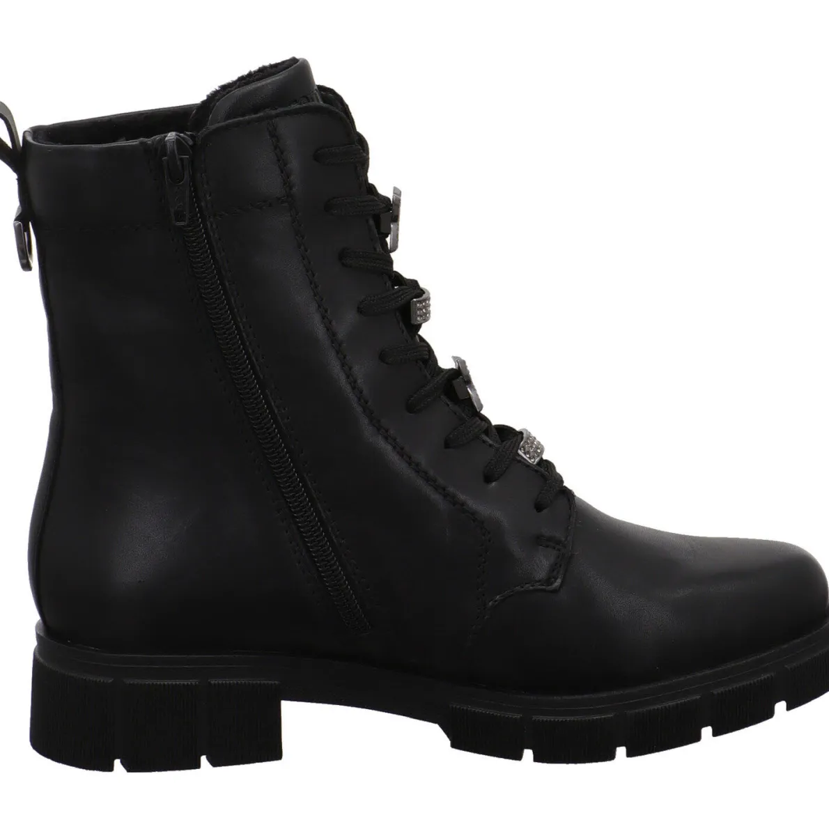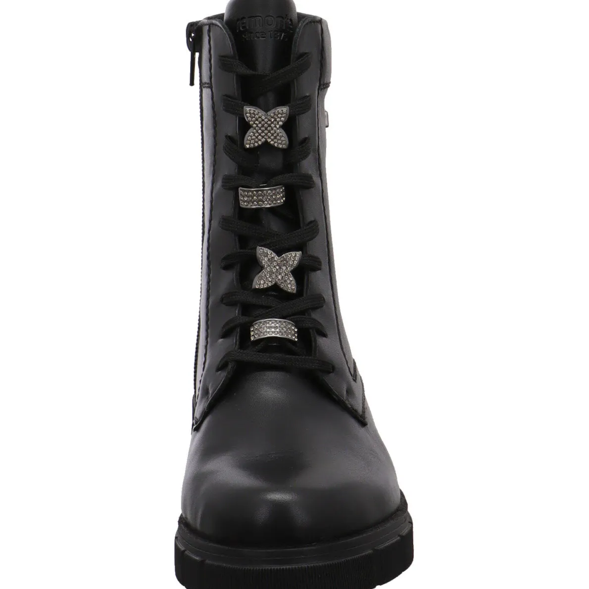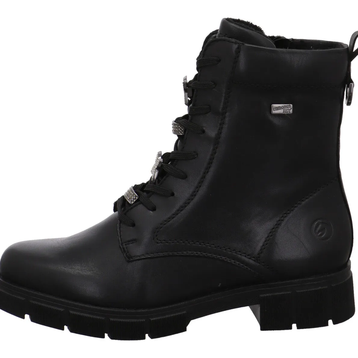 Sie wurde aus hochwertigem Echtleder in Schwarz gefertigt. Das Besondere sind die kleinen Schmuck Glitzer Applikationen auf der Schnürung. Diese machen die Schnürstiefelette zu einem Blickfang. Durch den seitlichen Reißverschluss und der Lasche am Schaft ist der Einstieg ganz einfach. Mit der Schnürung kannst du sie genau auf deine Bedürfnisse anpassen. Das Innenfutter ist angeraut und durch die Remonte Tex Ausstattung ist er wasserabweisend und windabweisend. So bleiben deine Füße auch bei Regen und Schnee, warm und trocken. Achte hier bitte auf die richtigen Socken, damit die Funktion unterstützt wird. Die Innensohle ist als Wechselfußbett gearbeitet, so kannst du eigene Einlagen oder auch eine Thermosohle verwenden.