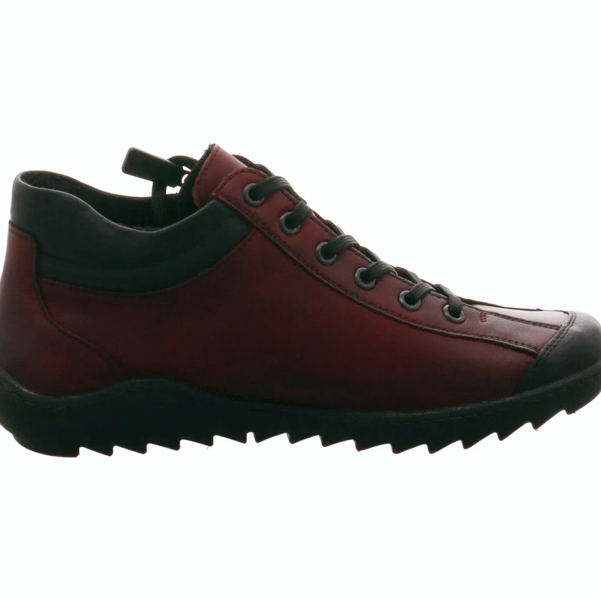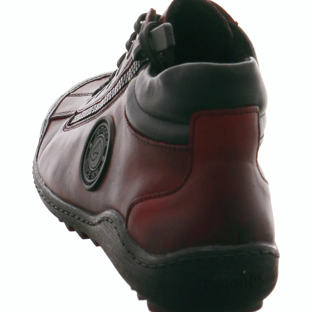 Die knöchelhohe Damen Schnürstiefelette von Remonte überzeugt mit ihrem originellen Design. Das Obermaterial besteht aus einem Mix aus Echtleder und Kunstleder in der Trendfarbe Weinrot. Ein besonderes Highlight ist das seitlich angebrachte Logo Emblem sowie die Akzente in Schwarz.