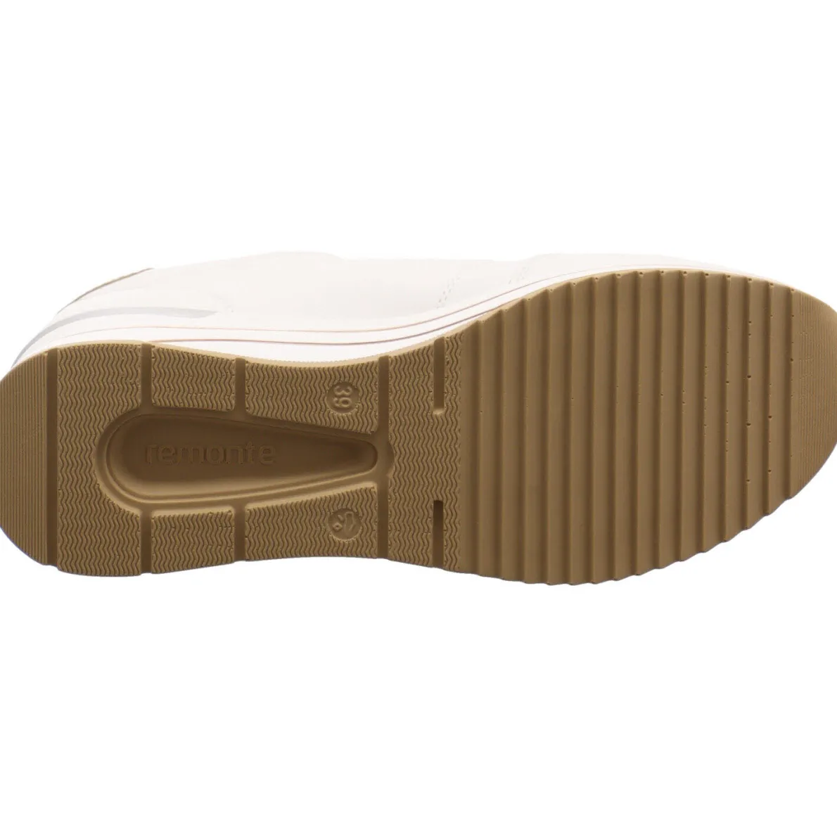 Das Obermaterial aus Leder in Weiß, ist auf dem Blatt mit einer Perforierung versehen. Tolle Details an der Ferse sowie am Schaft sind die Einsätze in einem Rose Gold, die Ziernähte und das Remonte Markenlogo an der Seite des Schuhs.