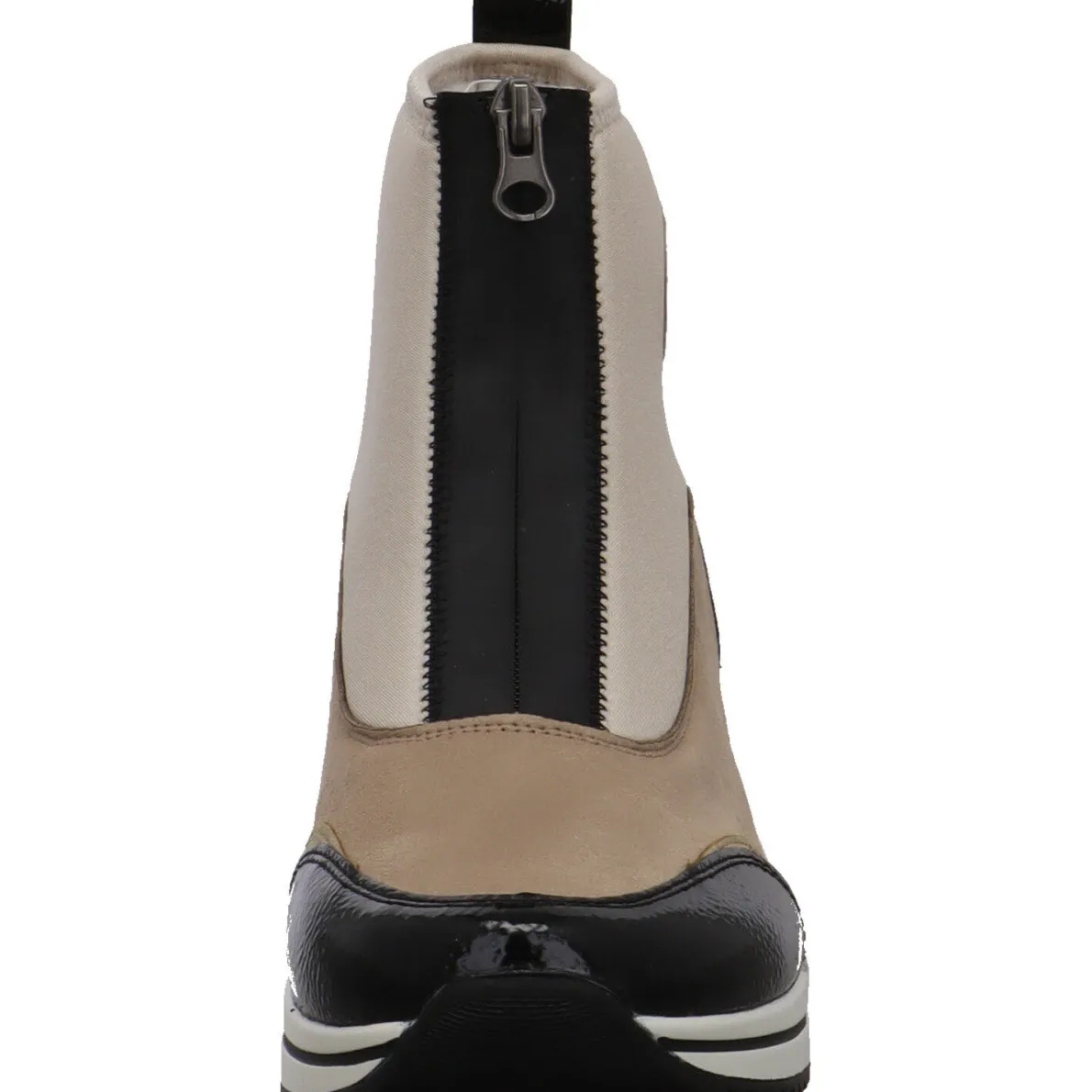 Sie wurde aus einem gekonnten Mix aus Textil und Synthetik in Schwarz mit Beige gefertigt. Dabei fallen einem die verschieden Haptiken sofort ins Auge. So wurde an Ferse und Schuhspitze ein Lack Einsatz verarbeitet. Der Schaft ist mit einem Stretch Material versehen. In Verbindung mit dem Reißverschluss auf dem Rist und der Lasche, ist der Einstieg ganz einfach. Die Remonte Soft Innensohle ist weich und als Wechselfußbett gearbeitet. So können auch eigene Einlagen verwendet werden.