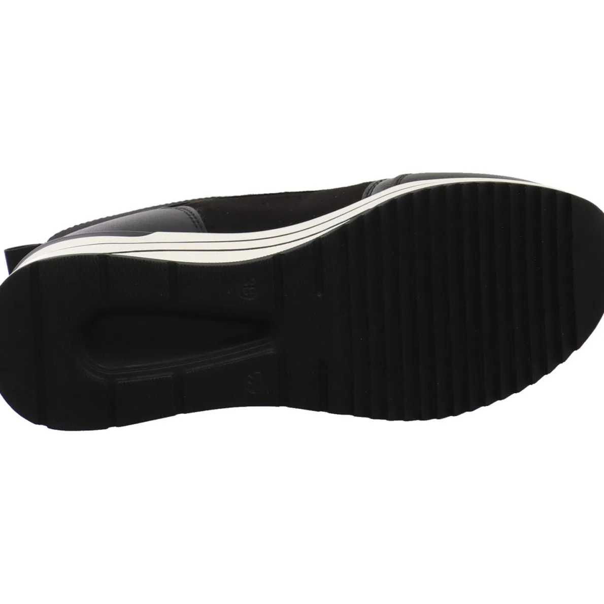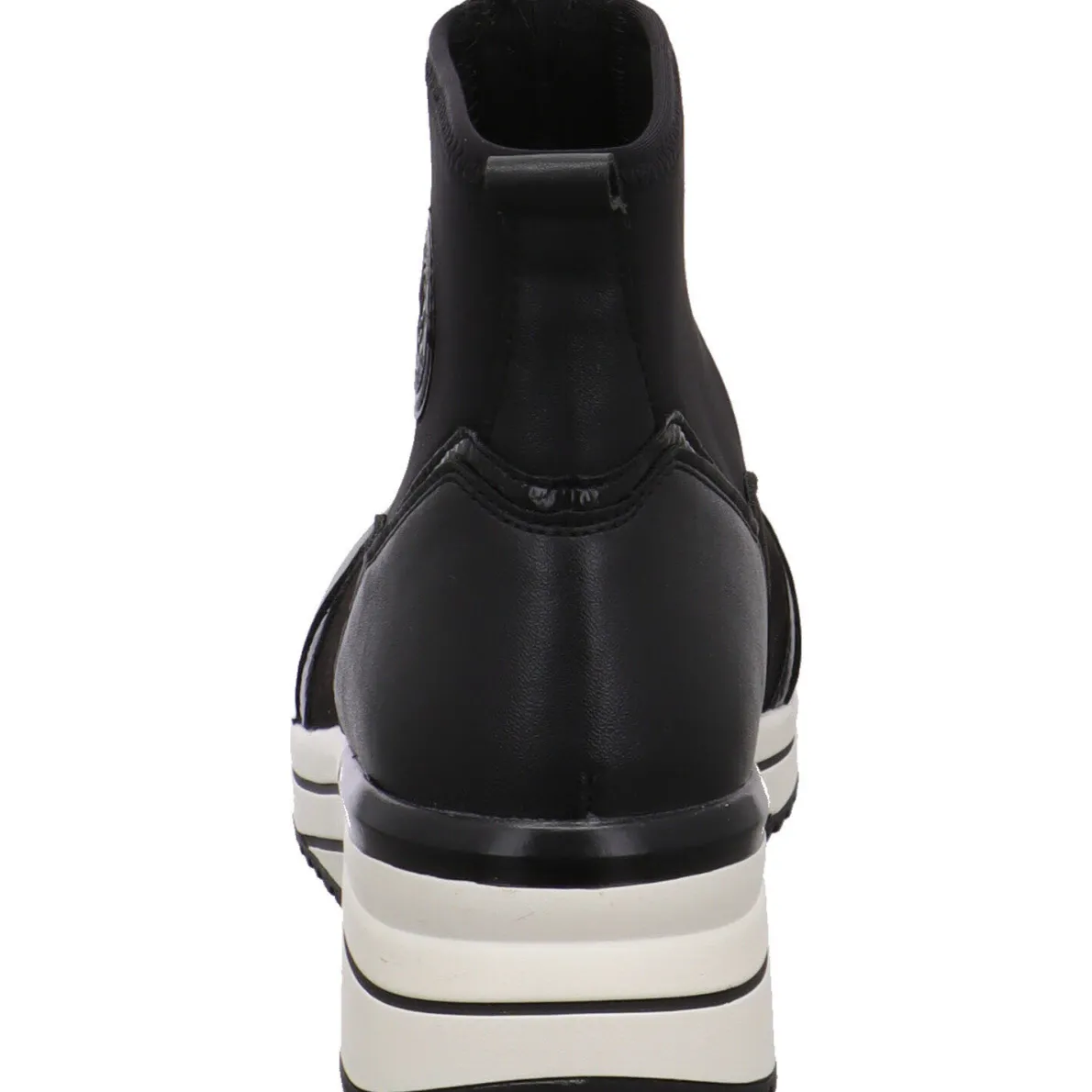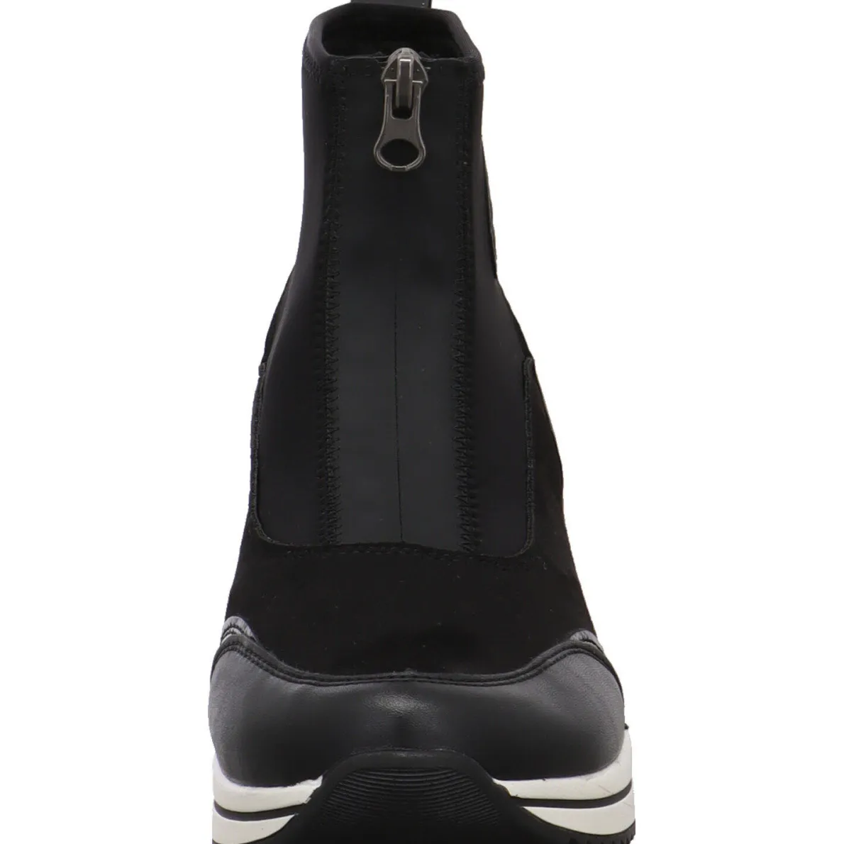 Sie wurde aus einem gekonnten Mix aus Textil und Synthetik in Schwarz gefertigt. Dabei fallen einem die verschieden Haptiken sofort ins Auge. So wurde an Ferse und Schuhspitze ein Kunstleder Einsatz verarbeitet. Der Schaft ist mit einem Stretch Material versehen. In Verbindung mit dem Reißverschluss auf dem Rist und der Lasche, ist der Einstieg ganz einfach. Die Remonte Soft Innensohle ist weich und als Wechselfußbett gearbeitet. So können auch eigene Einlagen verwendet werden.