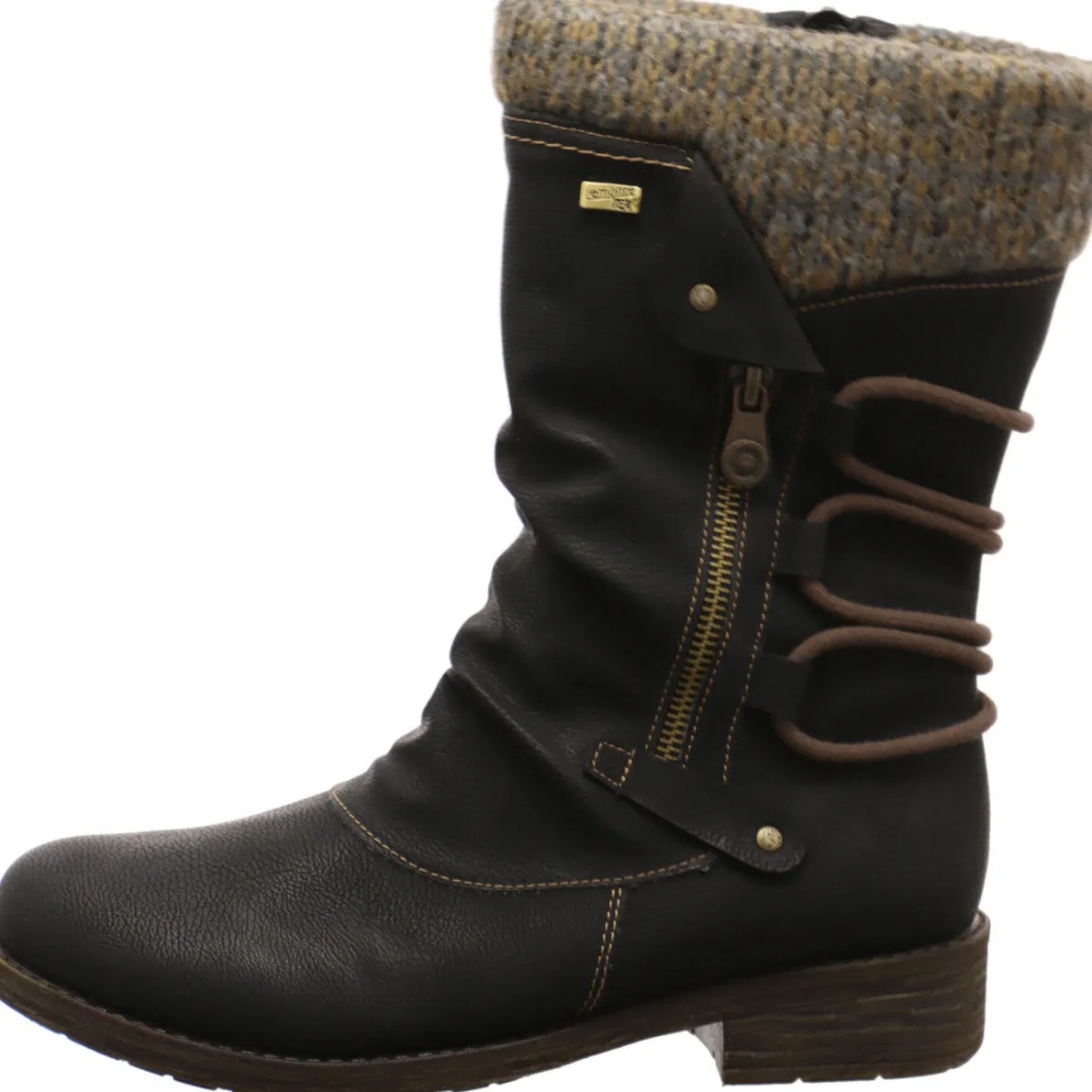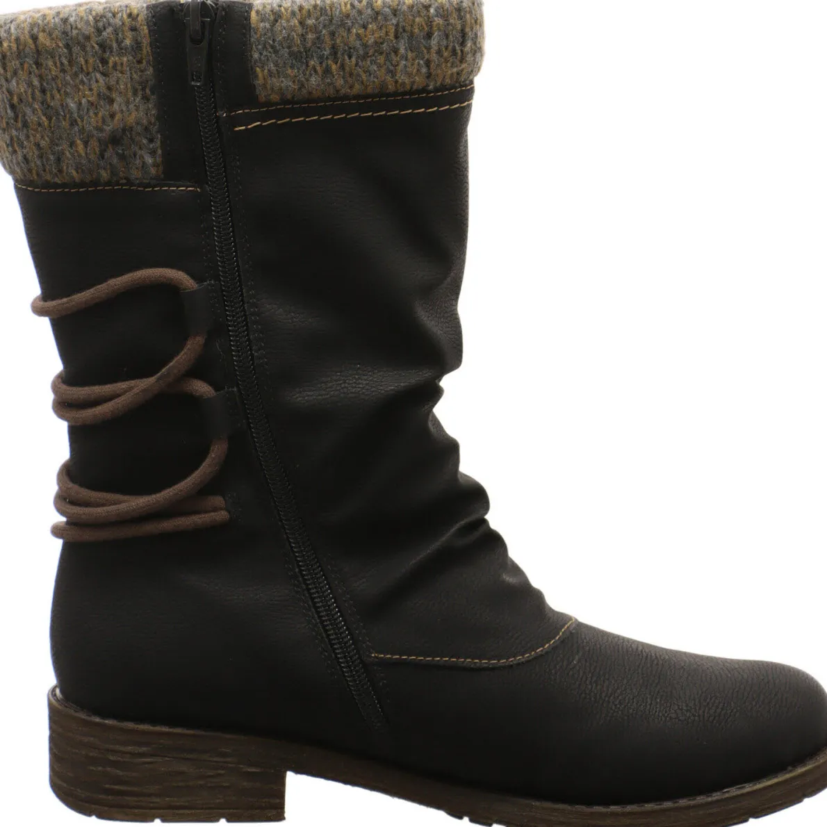 Das Obermaterial aus Kunstleder in Schwarz wurde mit einer authentischen Narbung gefertigt und ist so im angesagten Design. Der Schaftrand besteht aus Strick und sieht dadurch nicht nur besonders stylisch aus, sondern spendet auch extra Wärme. Highlights sind der seitliche Zierreißverschluss und die Zierschnürung in Braun über dem Fersenbereich. Abgerundet wird dieser Look noch durch Details in Braun mit kleinen Metall Applikationen.