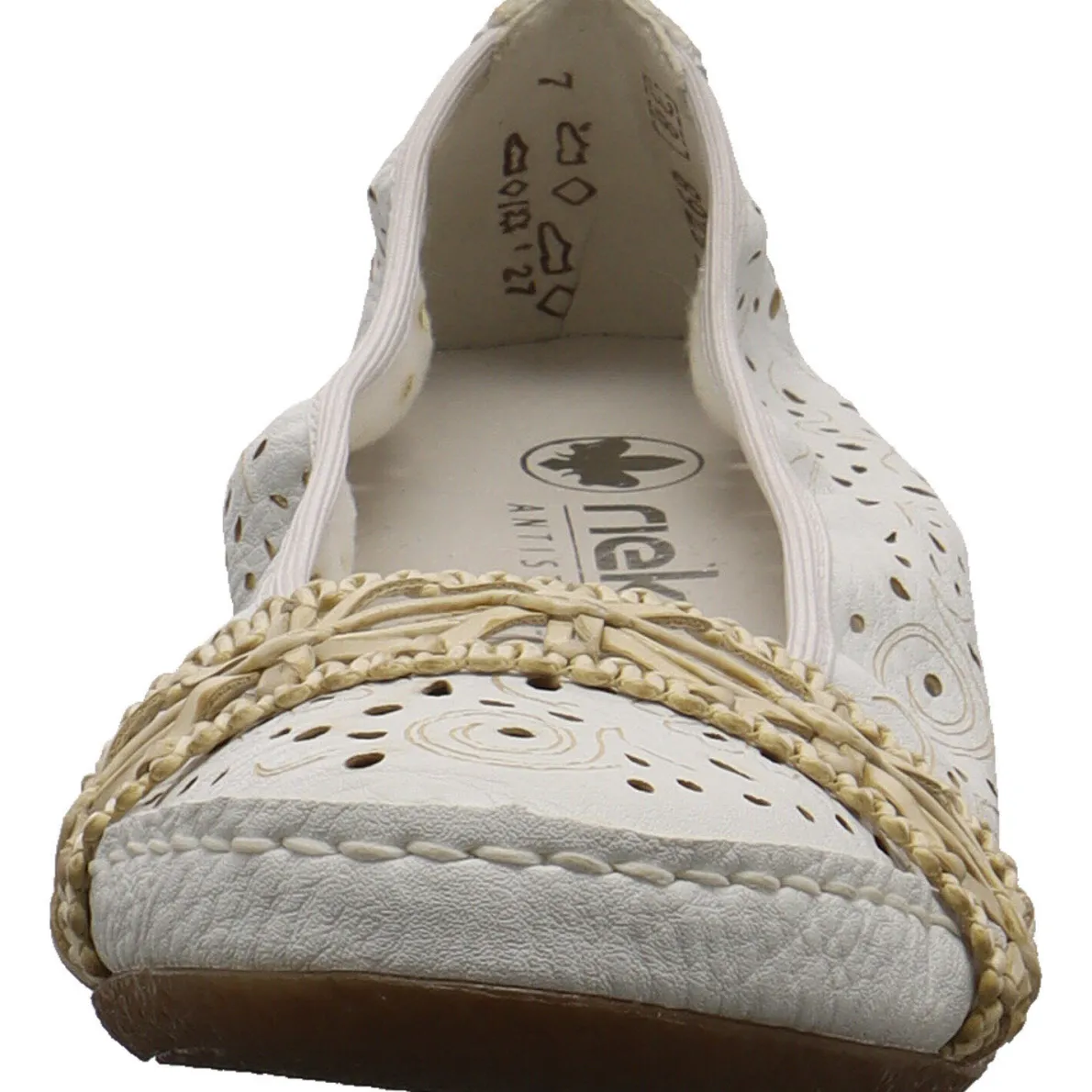 Ballerinas zählen zum Trend in diesem Frühling und Sommer. Daher bist du mit diesem femininen Damen Ballerina in Weiß aus dem Hause Rieker perfekt ausgestattet. Er wurde aus Kunstleder in Weiß gefertigt und mit einem schönen Lochmuster verziert. Farbakzente in Beige und das Zierband über dem Blatt in Bast Optik verleihen ihm einen besonders schönen Look.