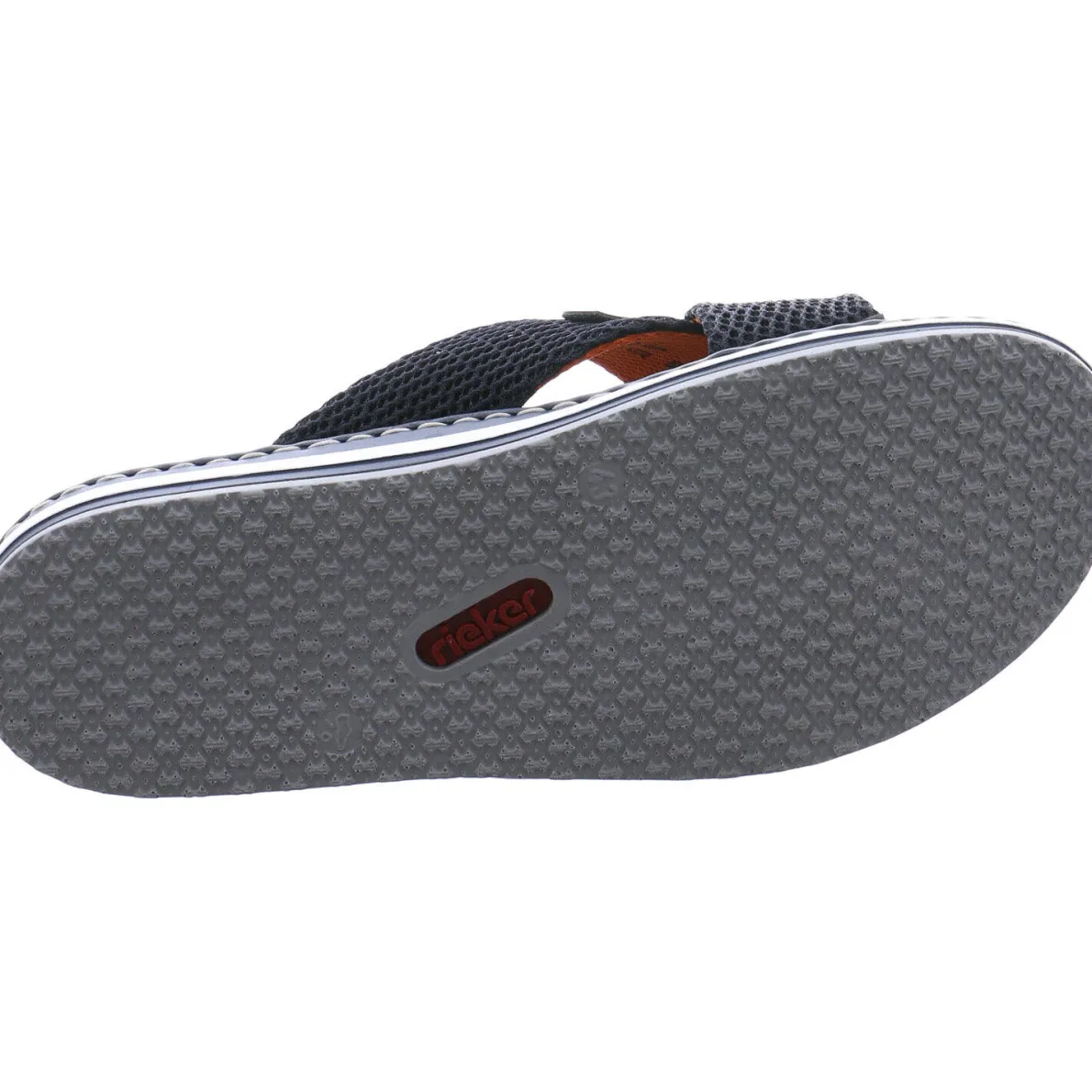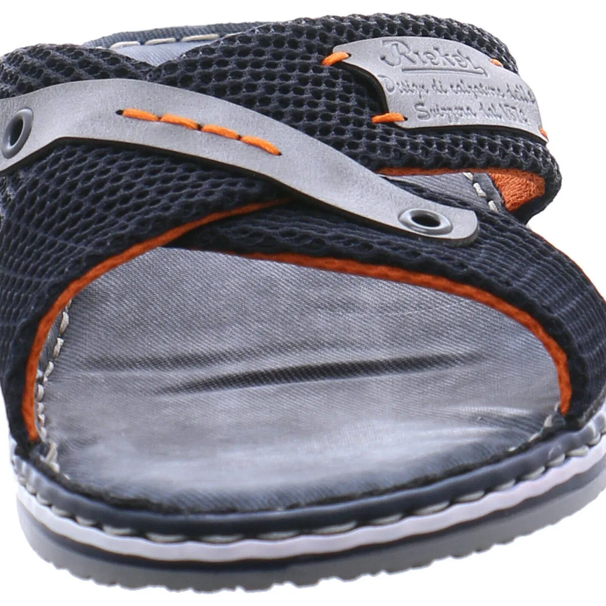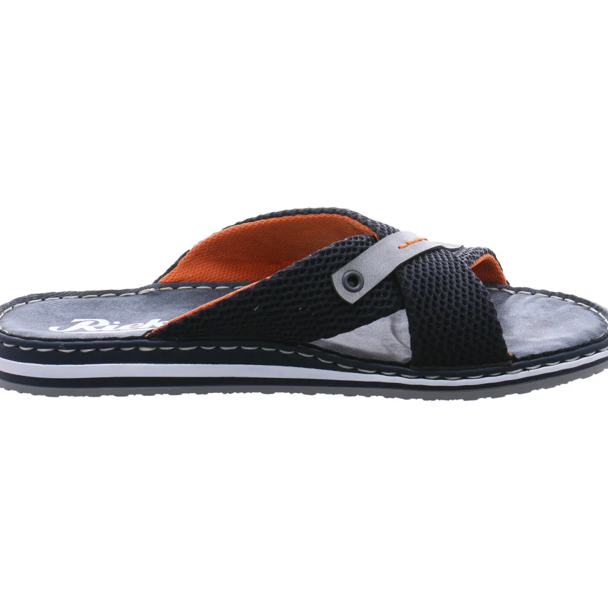 Diese angesagte Herren Sommer Pantolette in Blau von Rieker überzeugt in erster Linie durch ihr modernes Design und die Highlights in Orange.