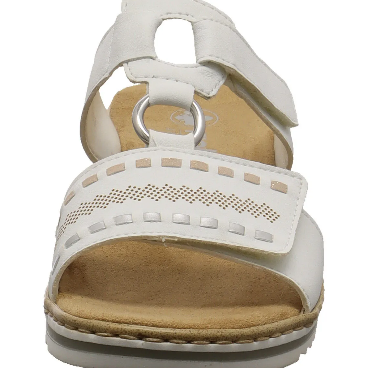 Das Obermaterial aus Kunstleder in Weiß begeistert durch das dezente Webmuster mit Akzenten in Silber. Und die schöne Linienführung der zwei Riemen. Der Metall Ring, welcher beide Riemen verbindet, rundet den Look perfekt ab. Mit dem dezenten doppelten Klettverschluss an beiden Riemen, kann der Schuh optimal an den Fuß angepasst werden und ein leichter Einstieg ist möglich.