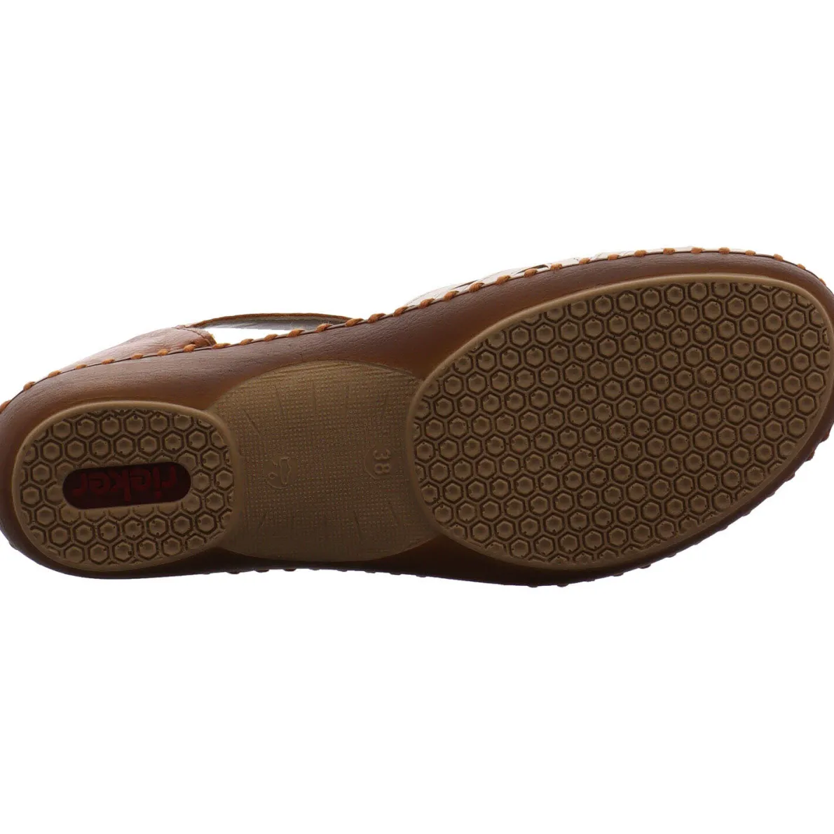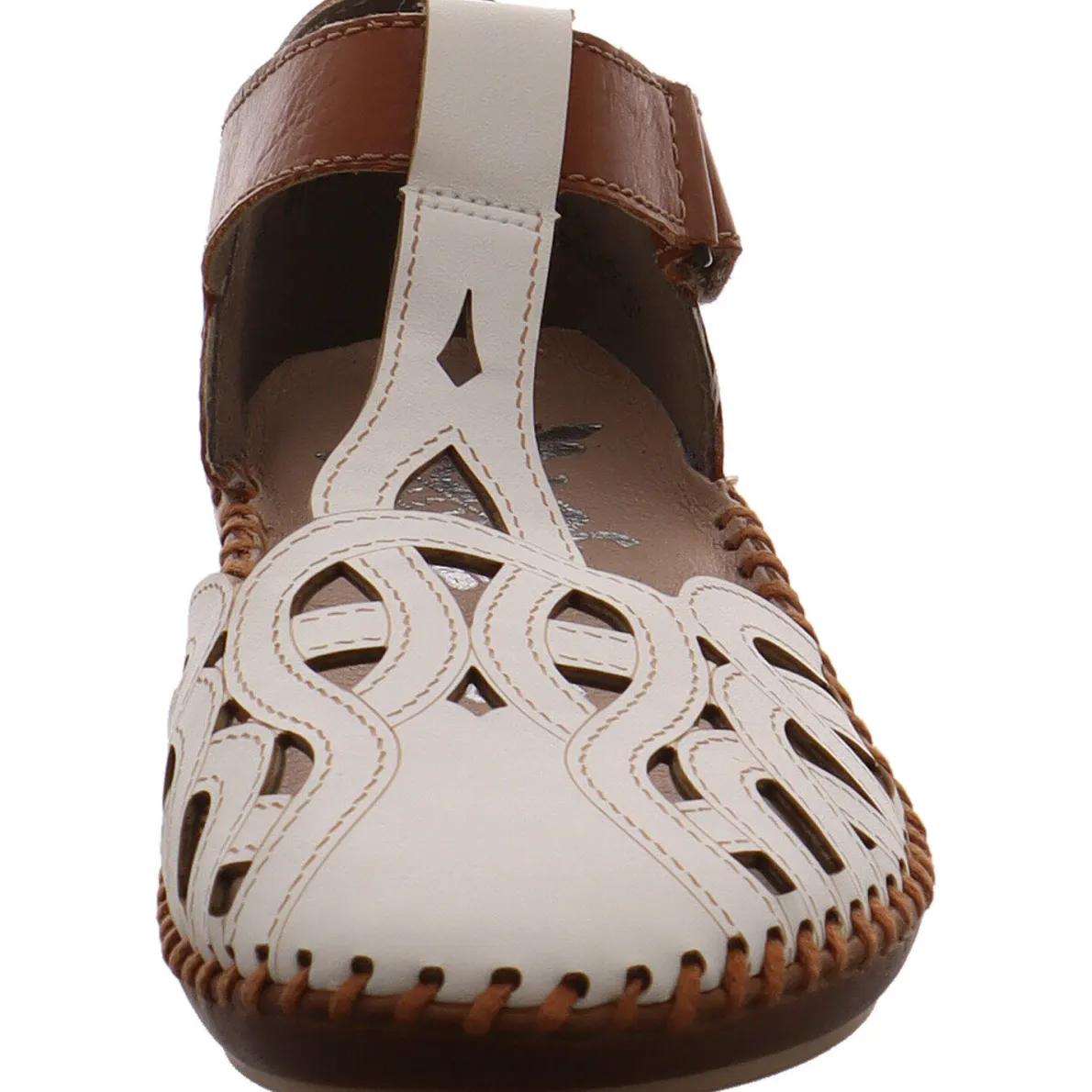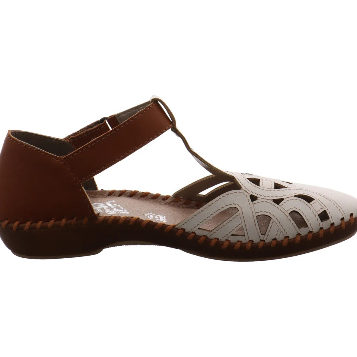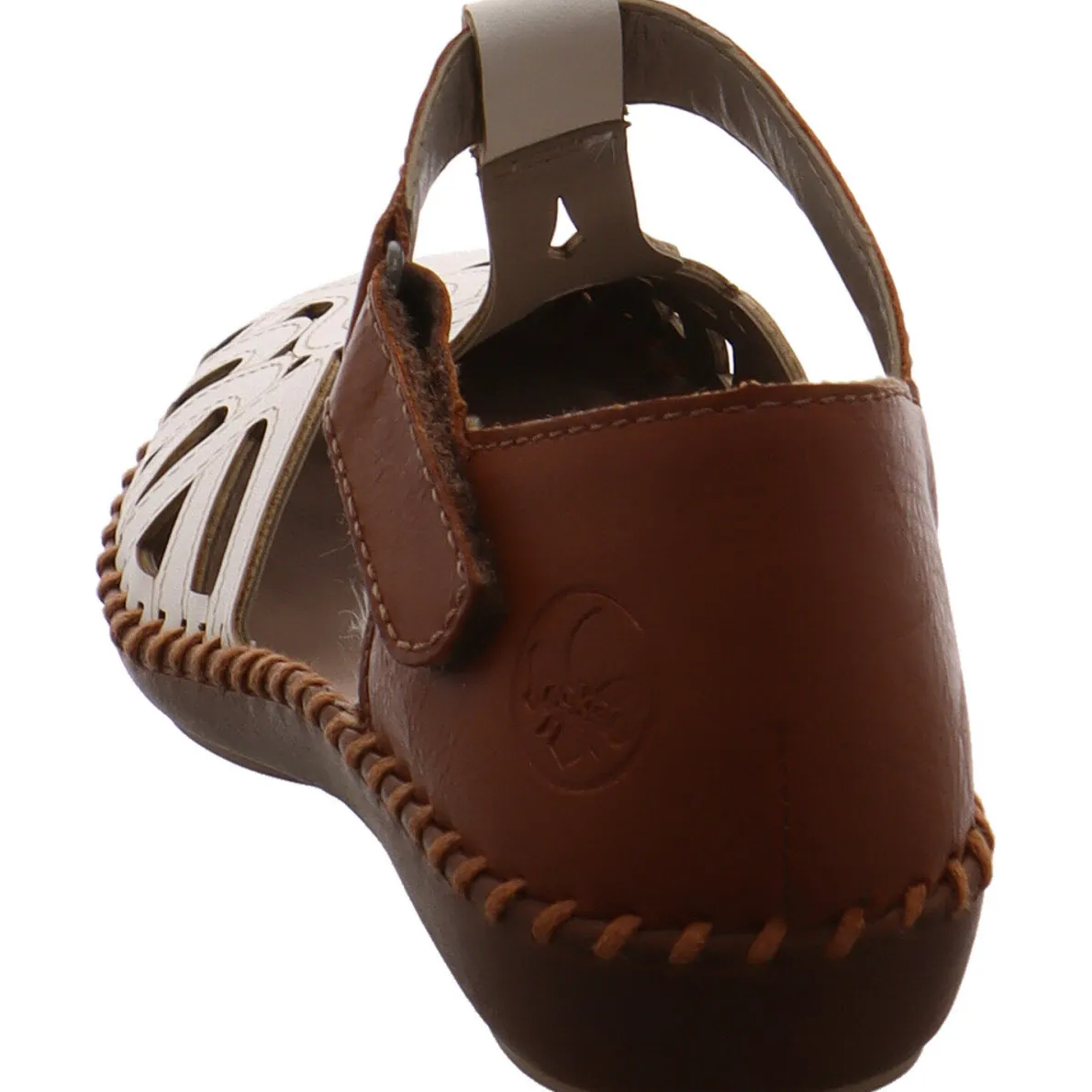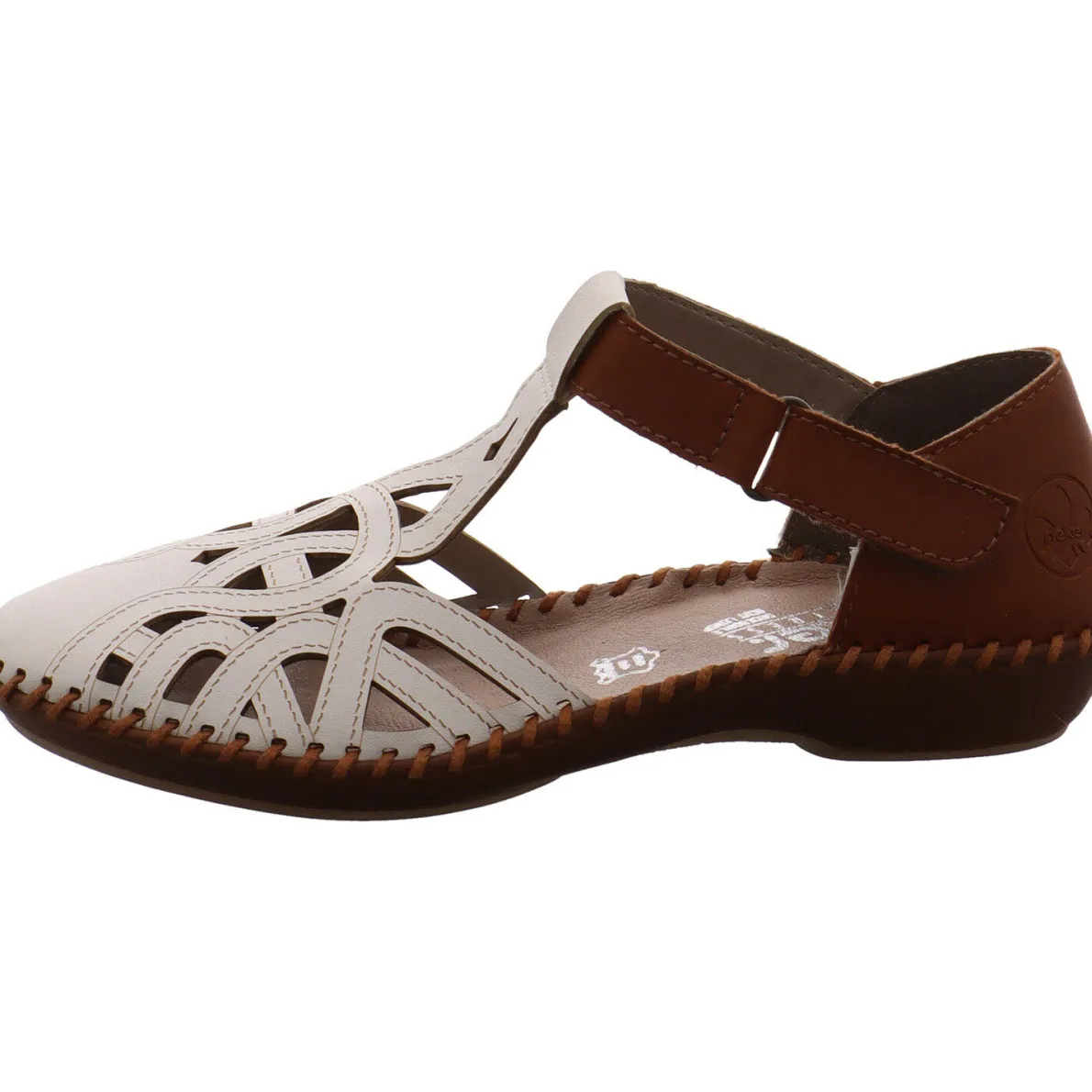 Diese ausgefallene und ausgesprochen feminine Damen Sandale in Weiß / Braun von Rieker zieht garantiert Blicke auf sich.