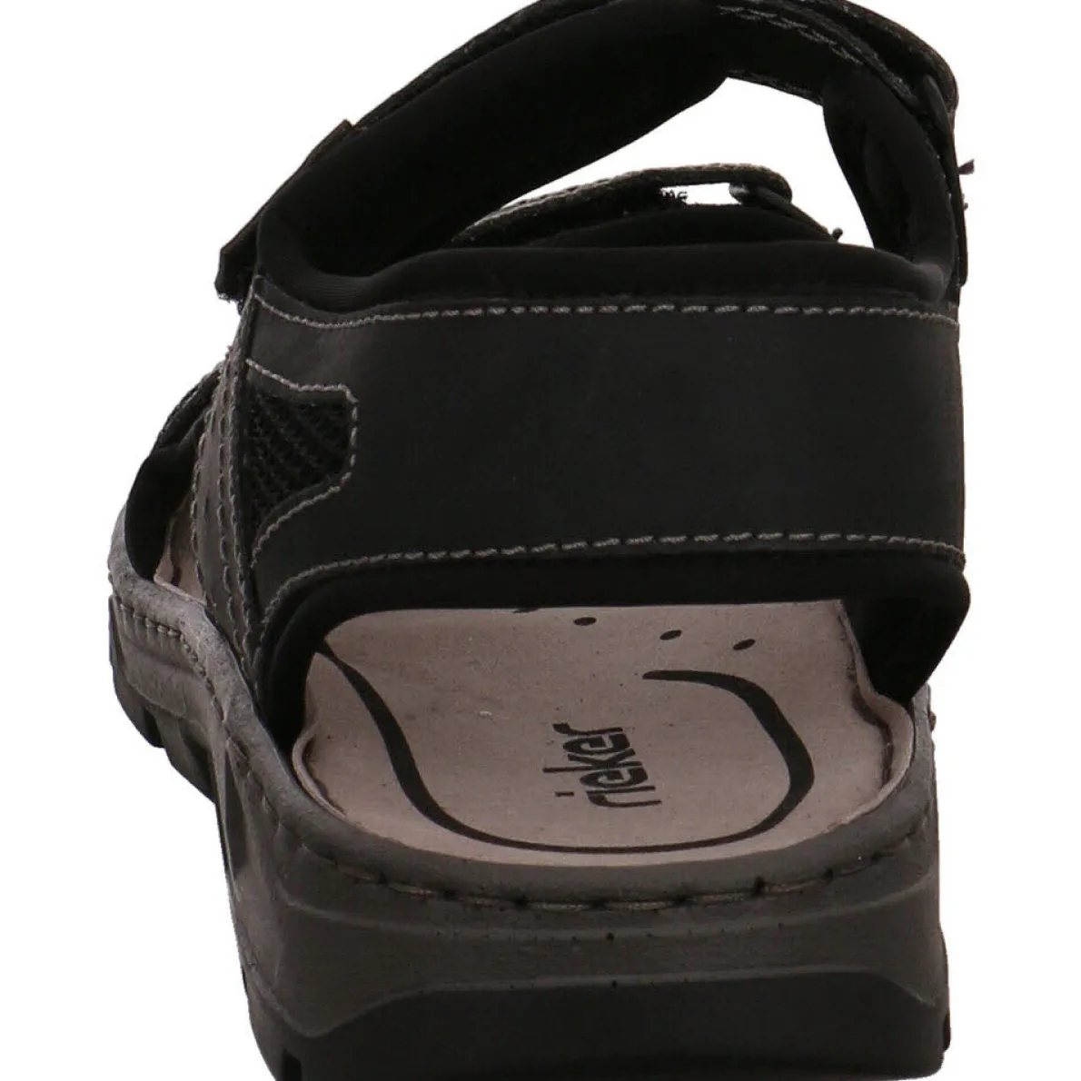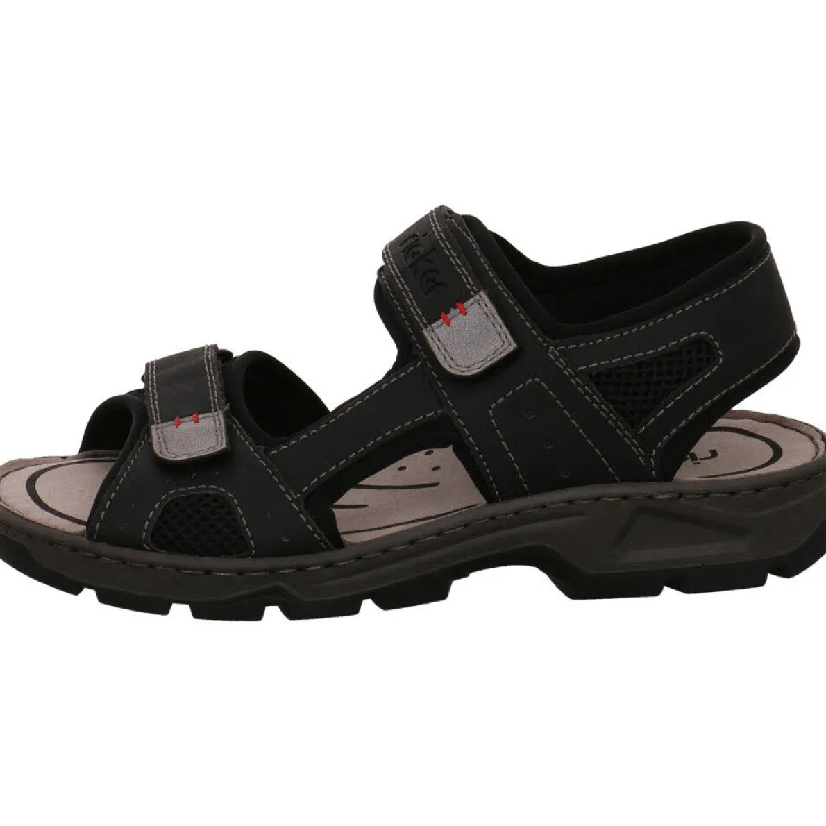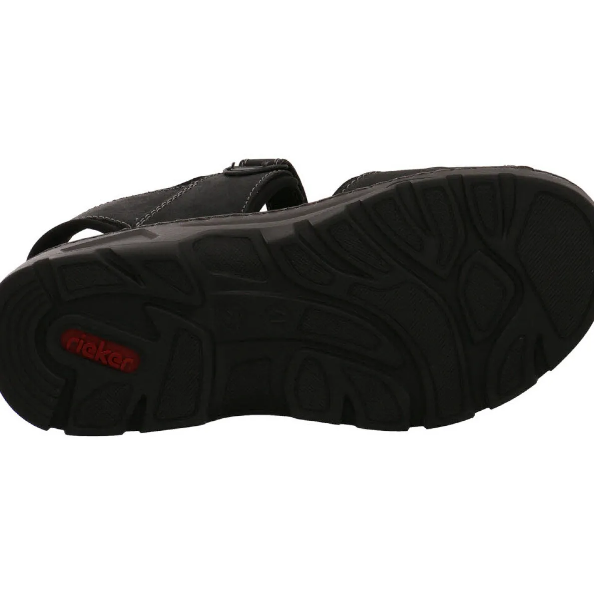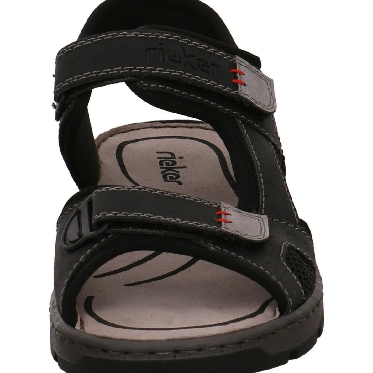 Diese Herren Sandale in Schwarz aus dem Hause Rieker wurde aus hochwertigem Kunstleder gefertigt, welches perfekt durch die Ziernähte in Grau unterstrichen wird.