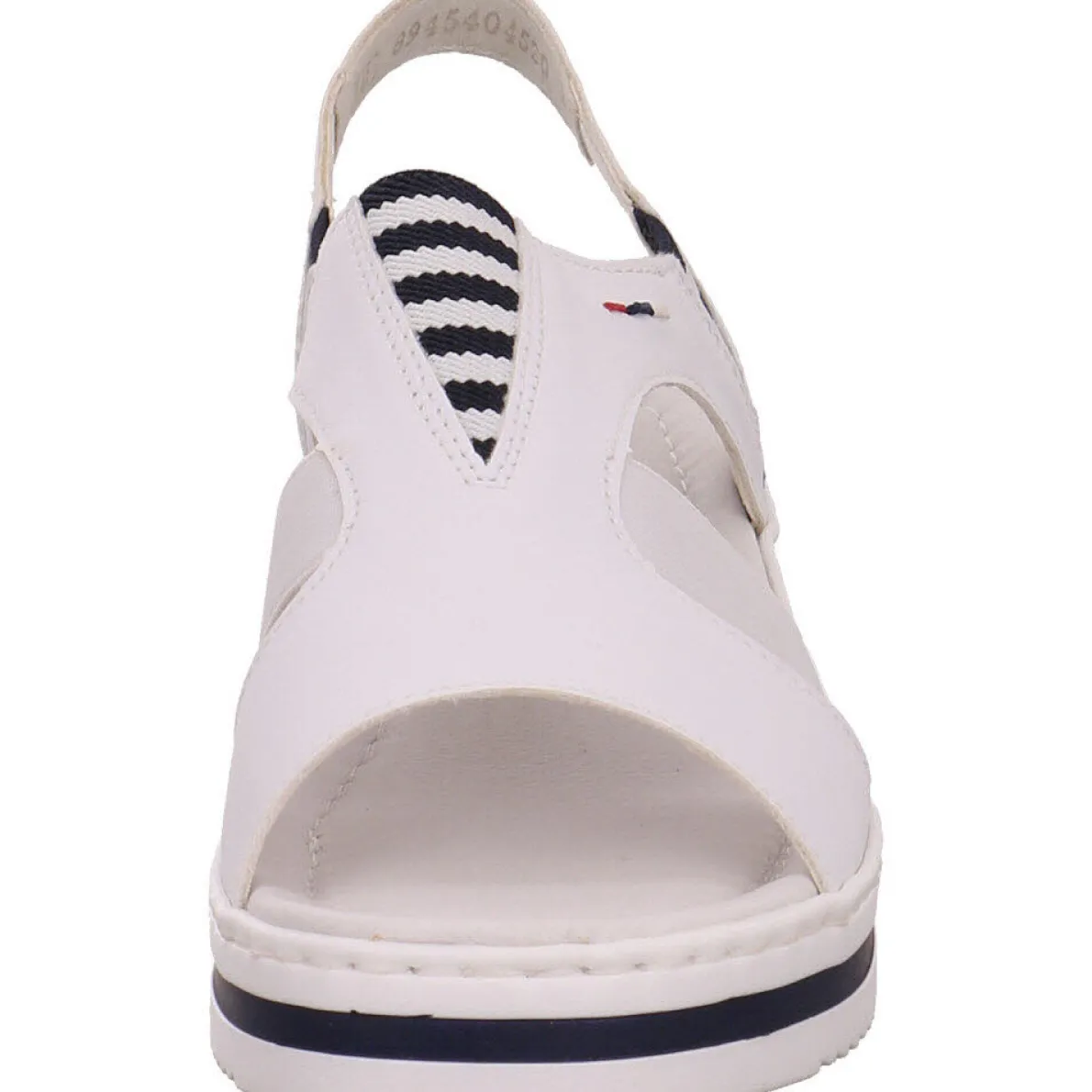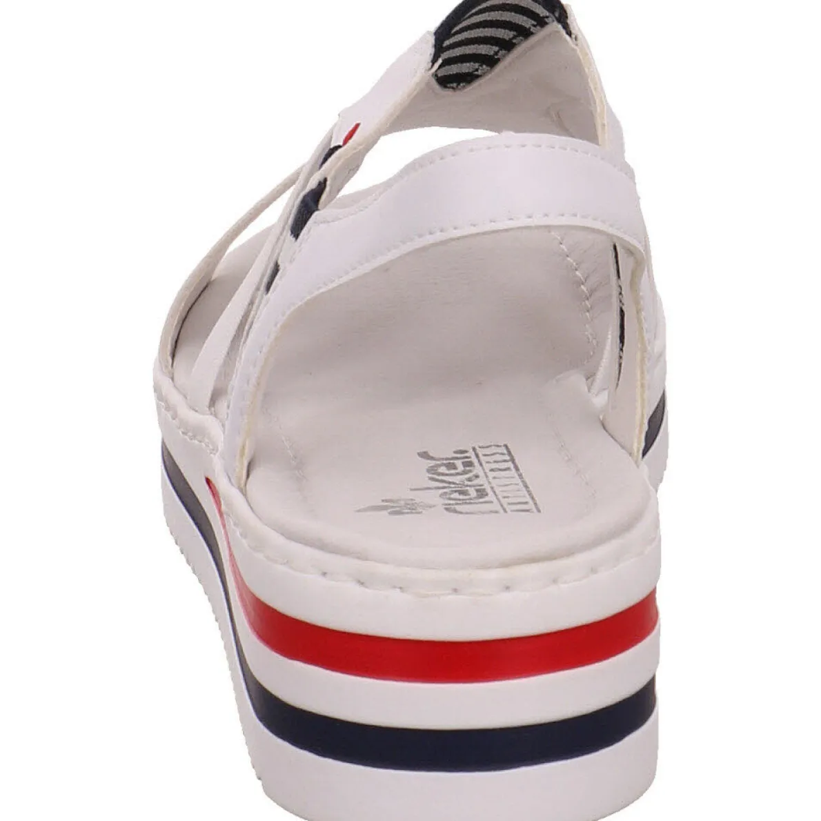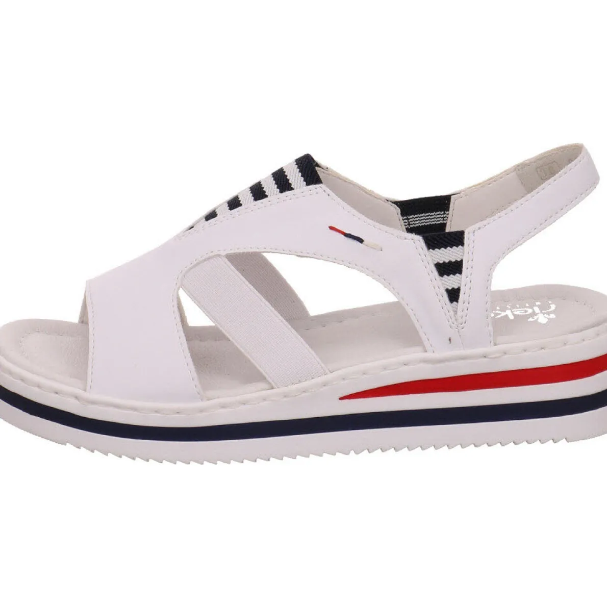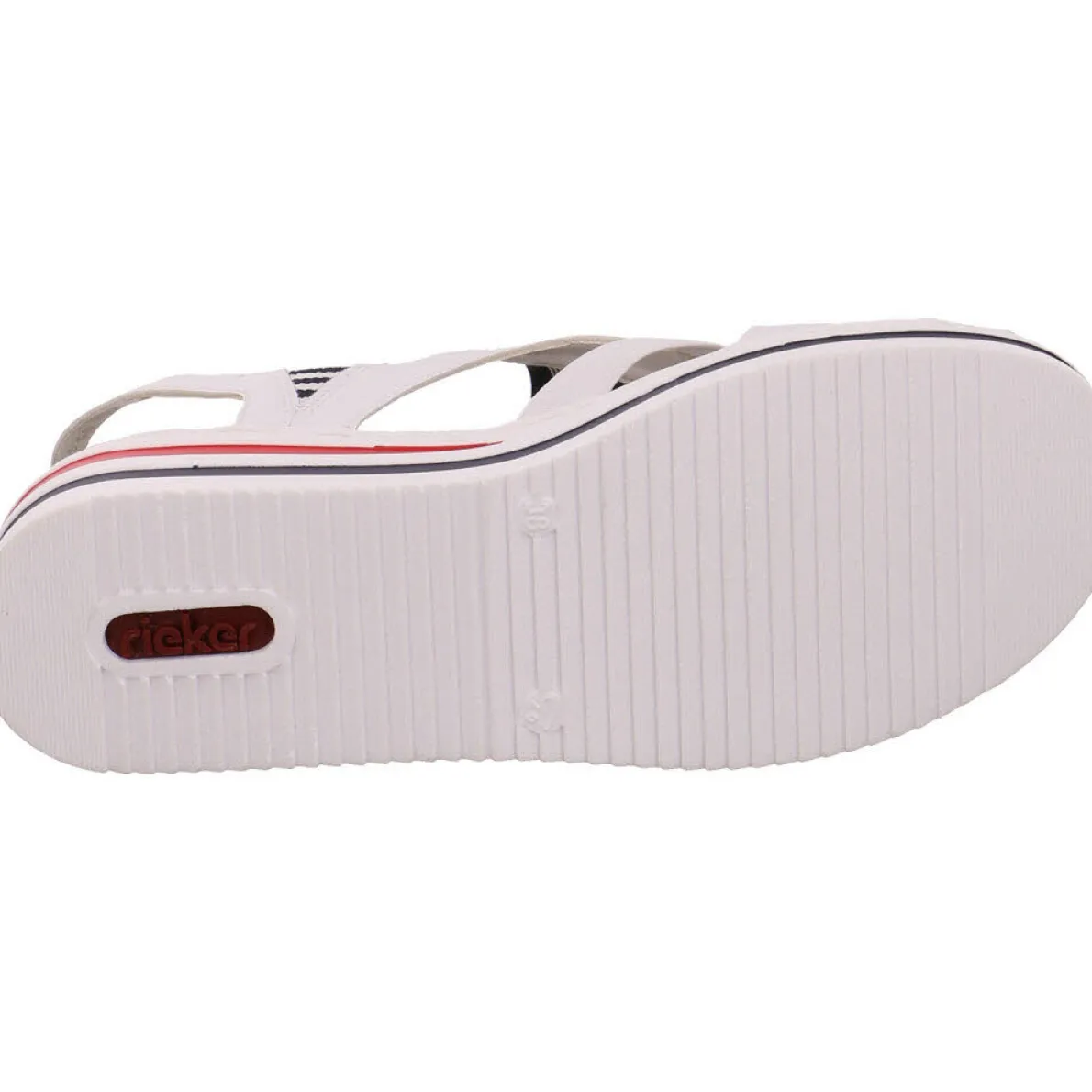 Diese Damen Sandale von Rieker wurde aus pflegeleichtem Kunstleder in Weiß, Rot und Blau gefertigt und überzeugt im modernen Maritim Design.
