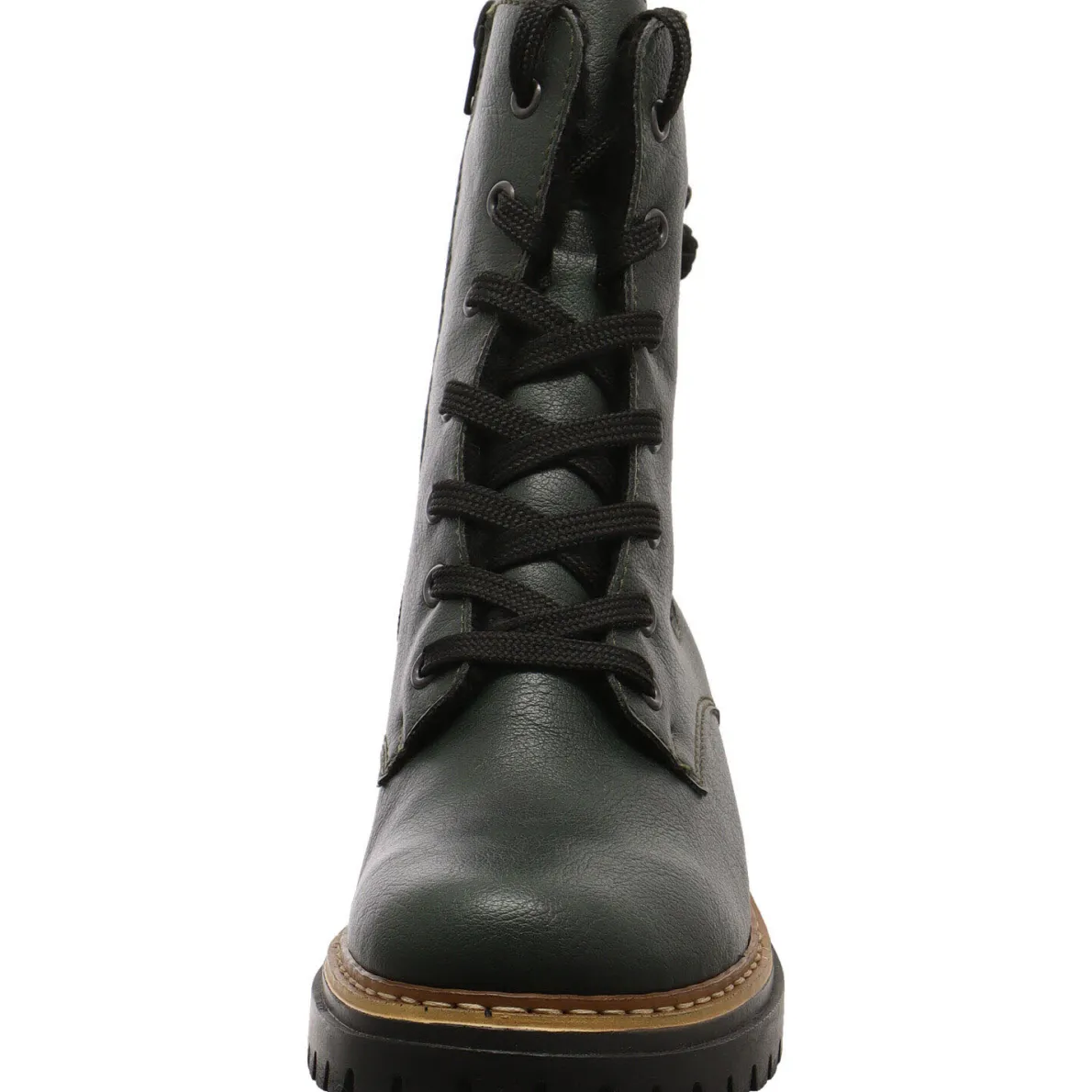 Das Modell wurde aus Kunstleder in der Trendfarbe Grün gefertigt. Der Schaft ist mit einem Stretch Einsatz in Schwarz versehen, der dir einen tollen Komfort bietet. Dieser wird mit einem Zierband gekonnt in Szene gesetzt. Durch den seitlichen Reißverschluss kommst du leicht in den Boots und mit der Schnürung kannst du die Passform optimieren.