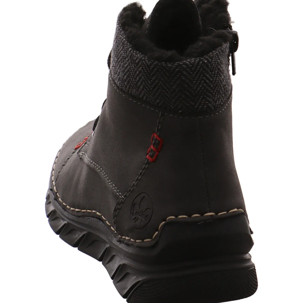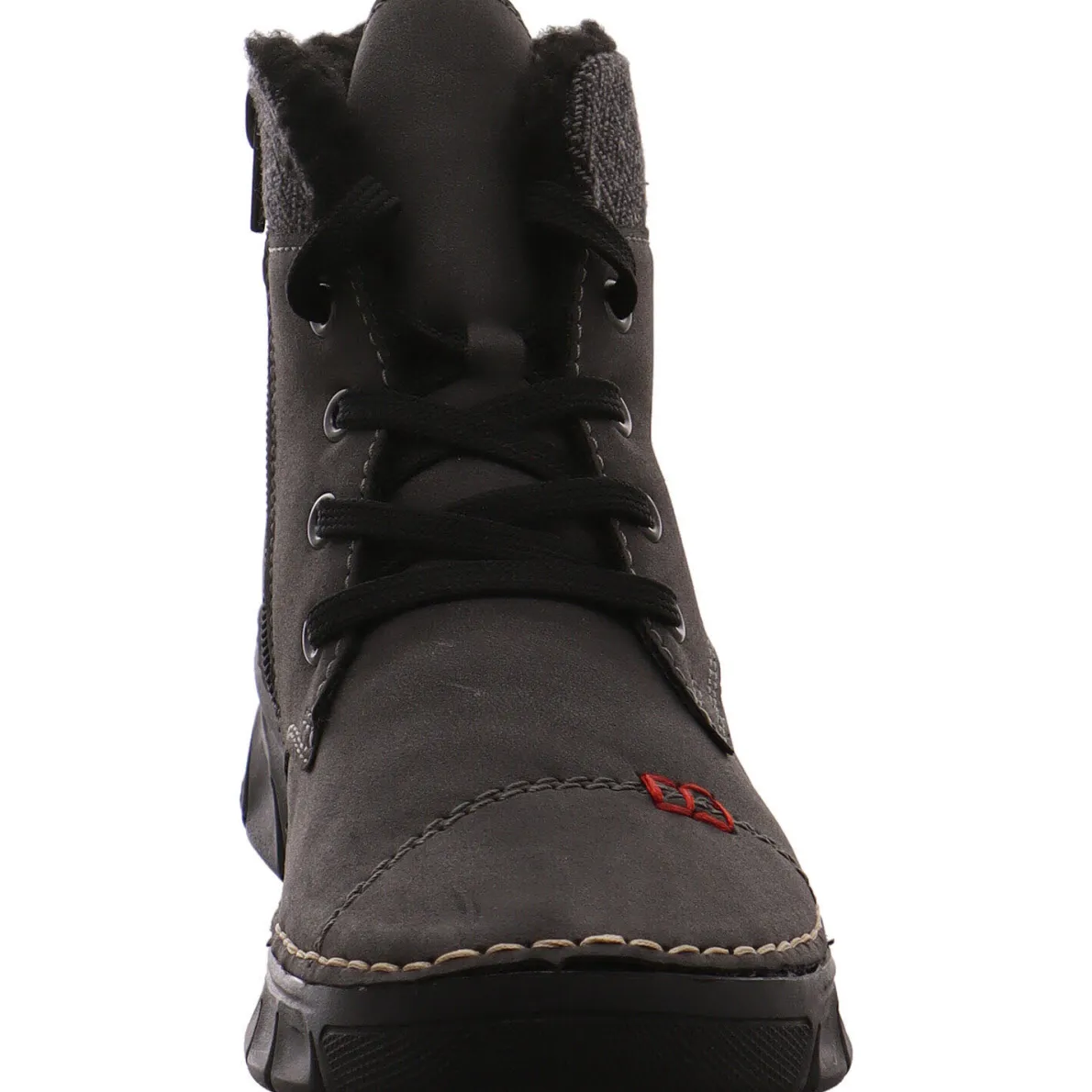Gefertigt wurde der Schuh aus pflegeleichtem Kunstleder in Grau und ist mit Highlights und Ziernähten in Rot und Beige versehen. Der gemusterte Schaft und das typische Rieker Markenlogo an der Seite des Schuhs sind weiterer Hingucker.