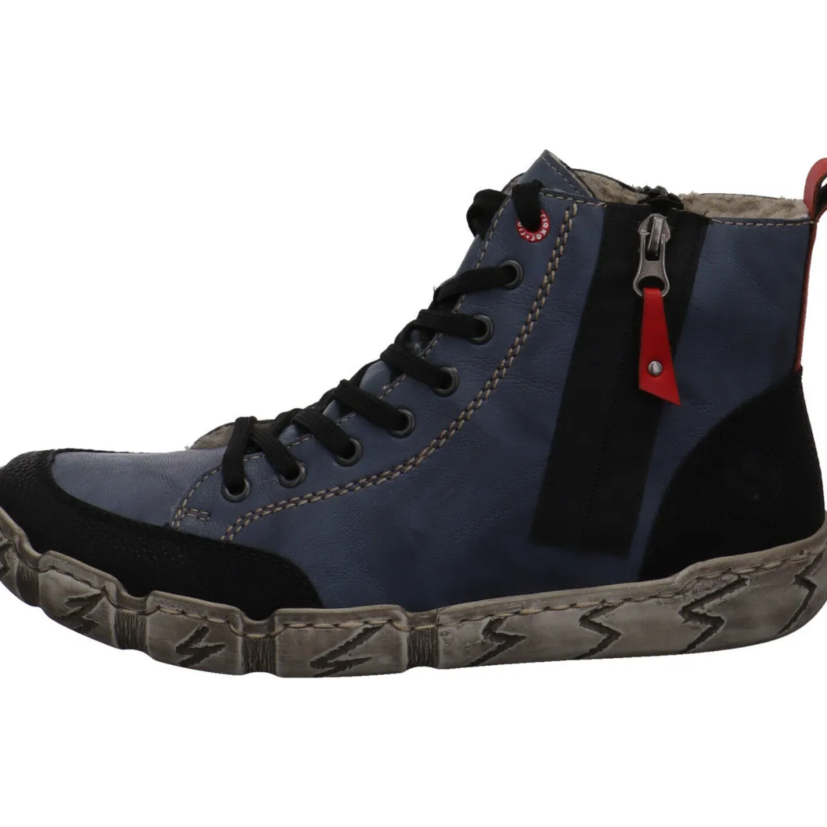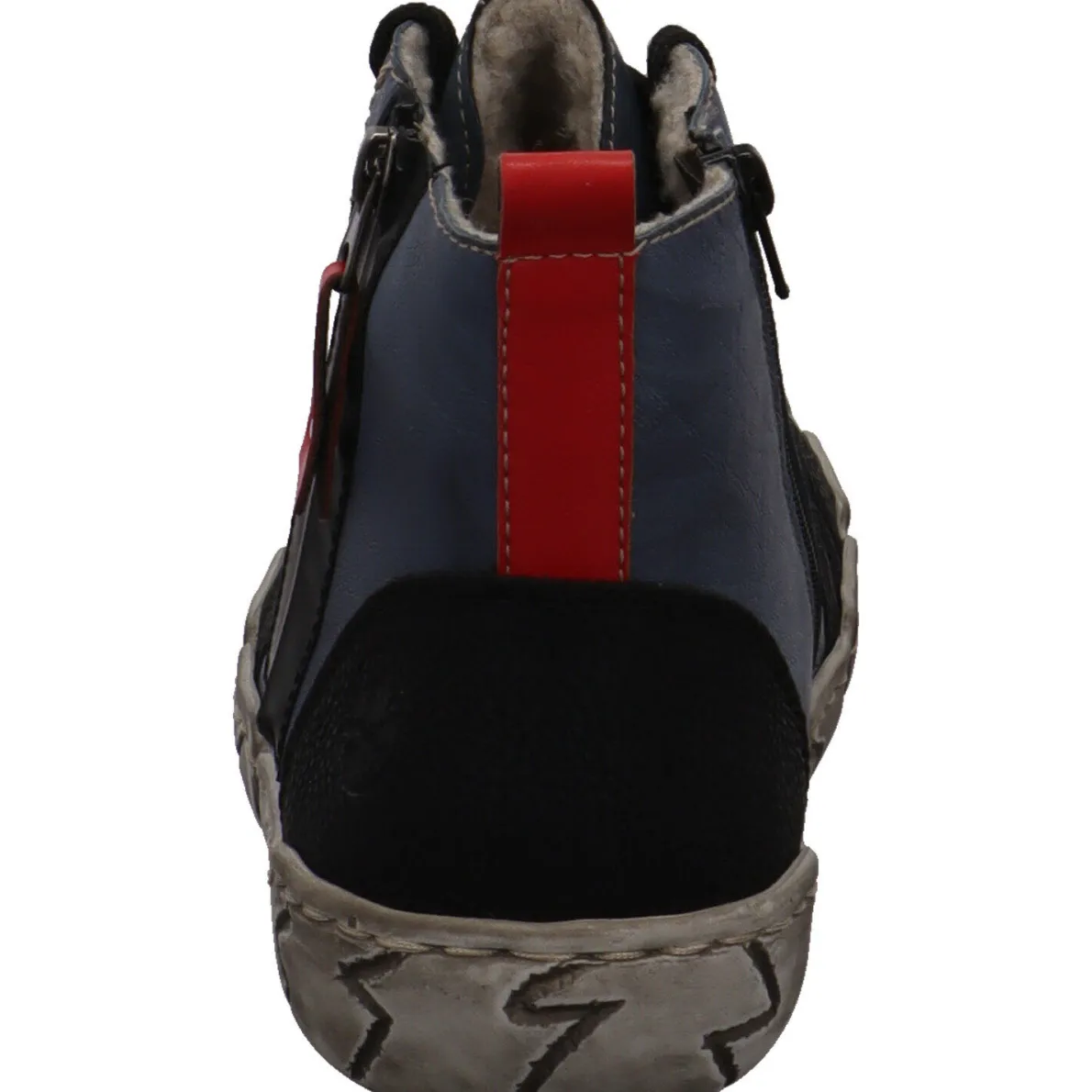 Das softe Obermaterial in einem Mix aus Echtleder und Synthetik in Blau und Schwarz ist ausgesprochen flexibel. Optische Highlights sind die Parts in leuchtendem Rot und der Dekozipper an der Außenseite.