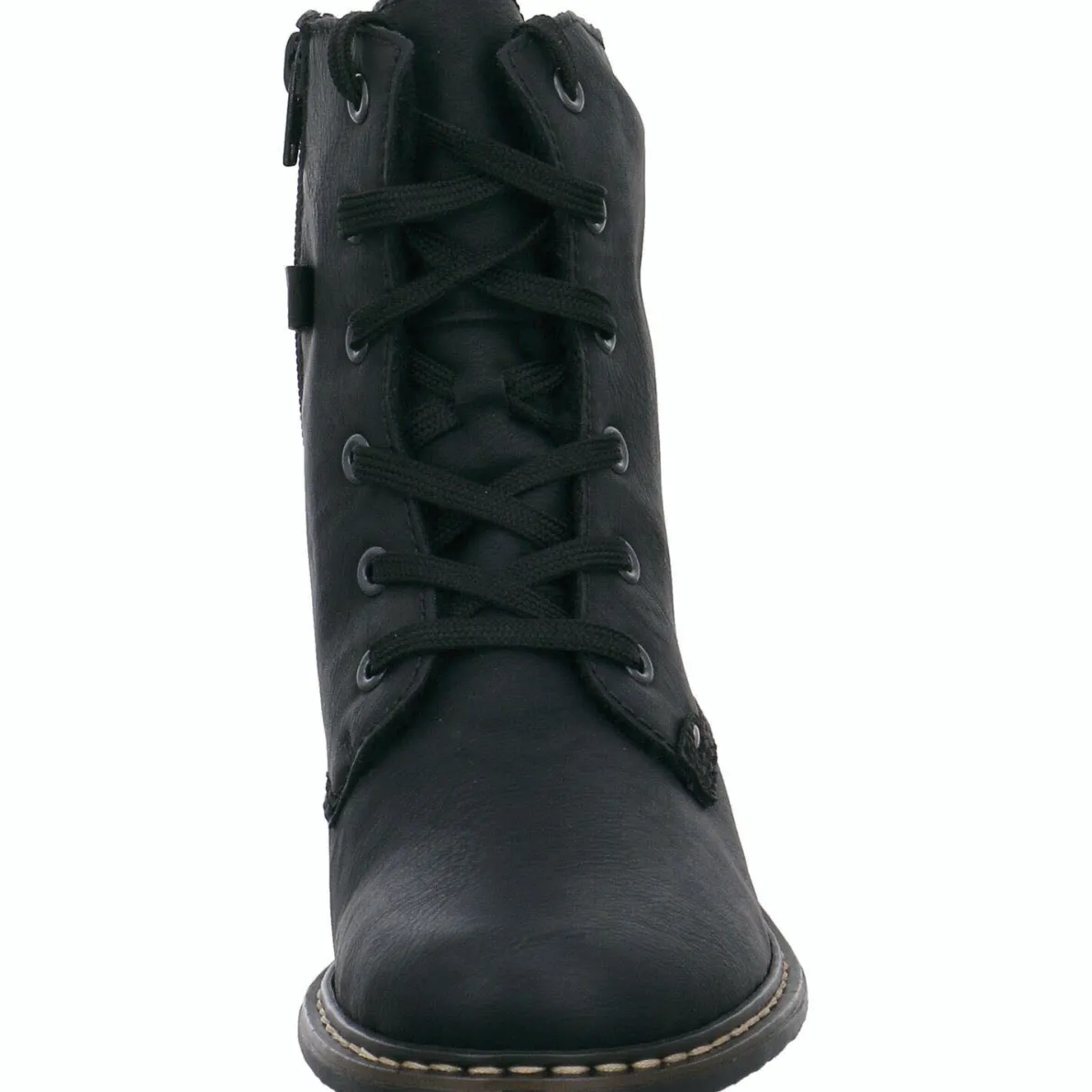 Diese sportliche Damen Schnürstiefelette von Rieker wurde aus hochwertigen Kunstleder in Schwarz gefertigt. Der Braun abgesetzte Blockabsatz und die kleine Faltenlegung am Schaft lockert das schlichte Design auf. Das flauschige Innenfutter der Stiefelette hält Ihre Füße in der kühlen Jahreszeit angenehm warm. Der seitliche Reißverschluss hilft bei einem leichten Ein- und Ausstieg. Die patentierte Antistress Innensohle bietet maximalen Tragekomfort.