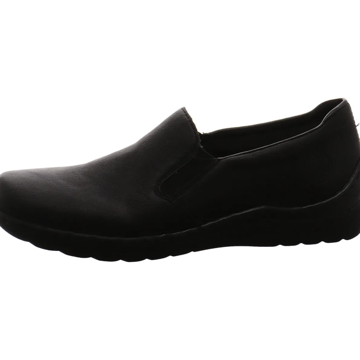 Das Obermaterial aus Kunstleder in Schwarz mit dem Rieker Markenzeichen an der Seite macht den Schuh schlicht und gut kombinierbar.